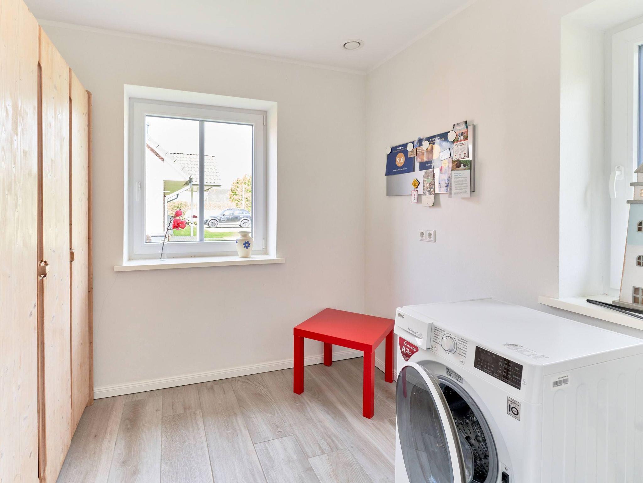 Neben dem Wohnbereich befindet sich ein praktischer Hauswirtschaftsraum mit Waschmaschine und Stauraum für Ihre persönlichen Dinge. Zudem steht Ihnen ein modernes Badezimmer mit Dusche, WC und Waschbecken zur Verfügung.