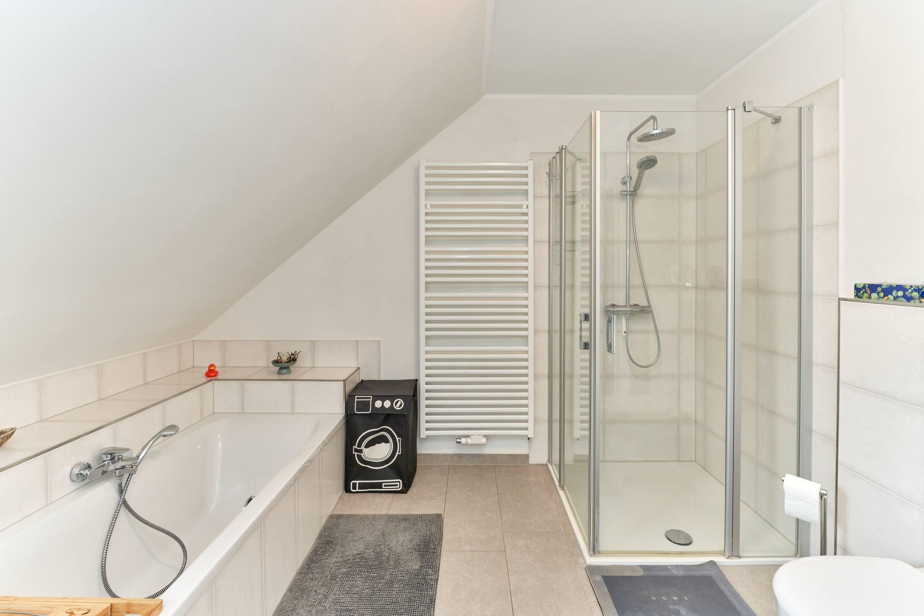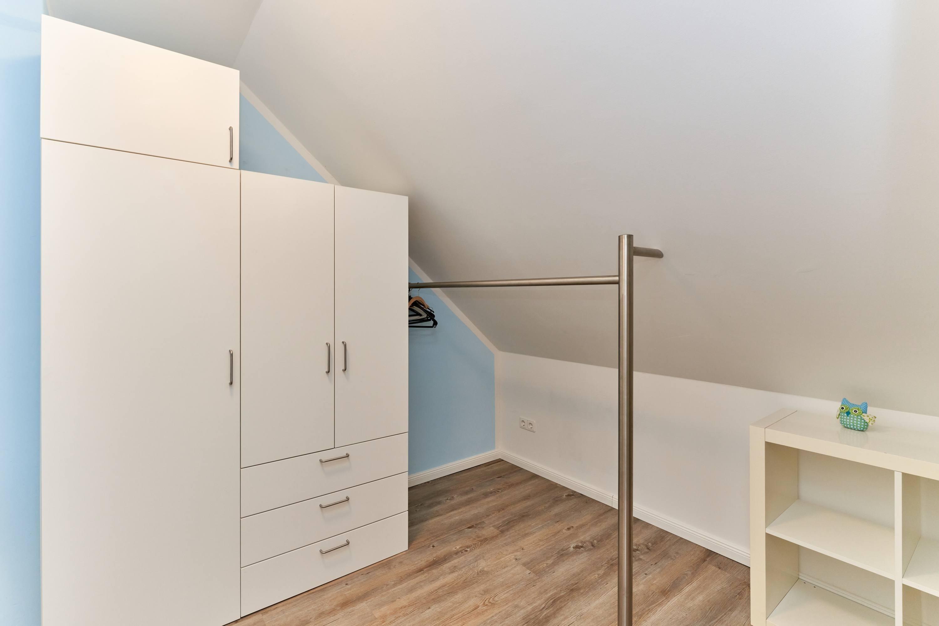 Im Dachgeschoss befinden sich zwei gemütliche Schlafzimmer, die Ihnen eine erholsame Nachtruhe garantieren. Zudem erwartet Sie ein großes Badezimmer mit separater Badewanne und Dusche, Toilette und Waschbecken – ideal für entspannende Wellnessmomente nach einem aktiven Tag an der Nordsee. Ein Ankleidezimmer bietet Ihnen zusätzlichen Stauraum für Ihre Kleidung und persönlichen Dinge.