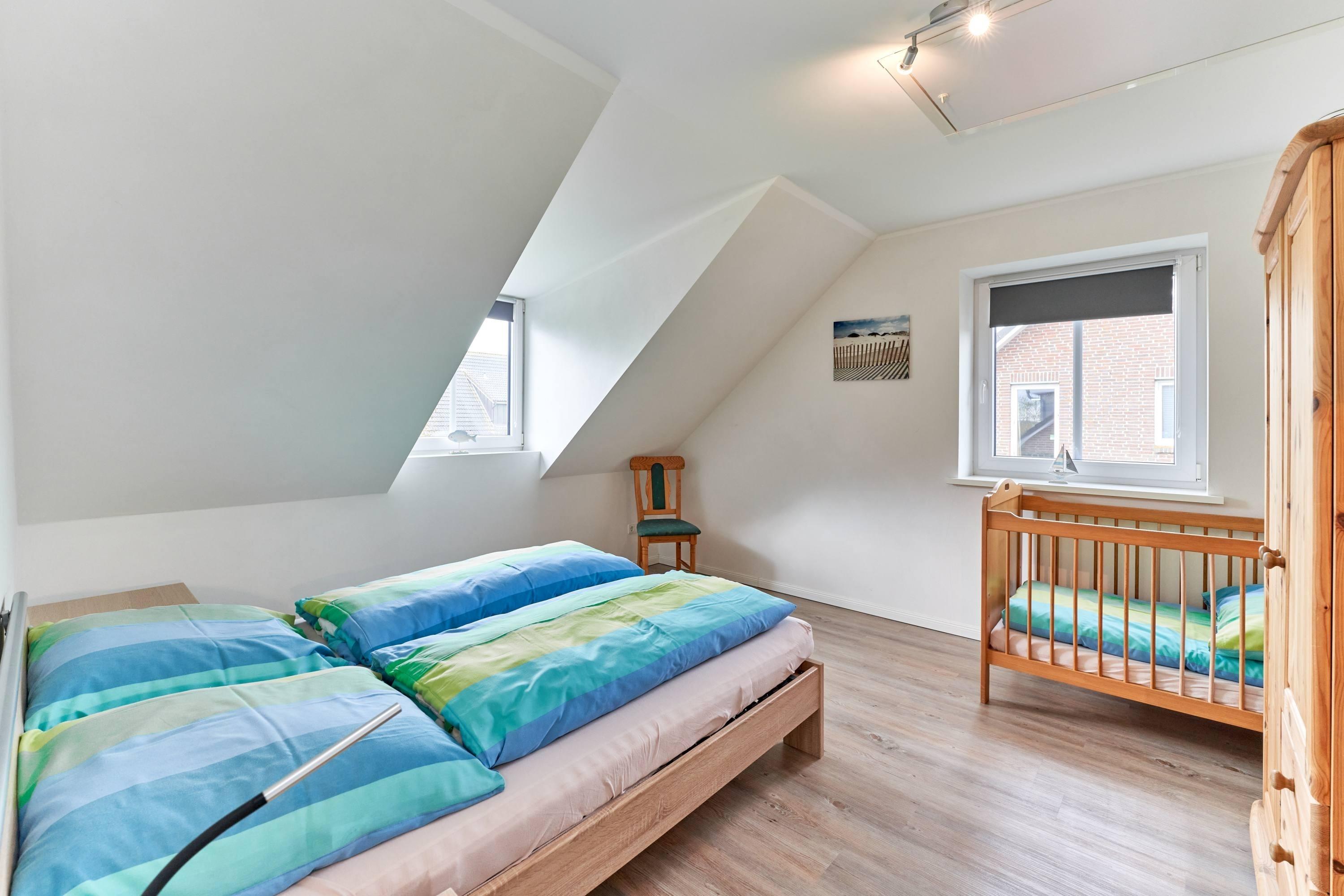 Schlafzimmer 2: Doppelbett und Kinderbett, ideal für die kleine Familie.