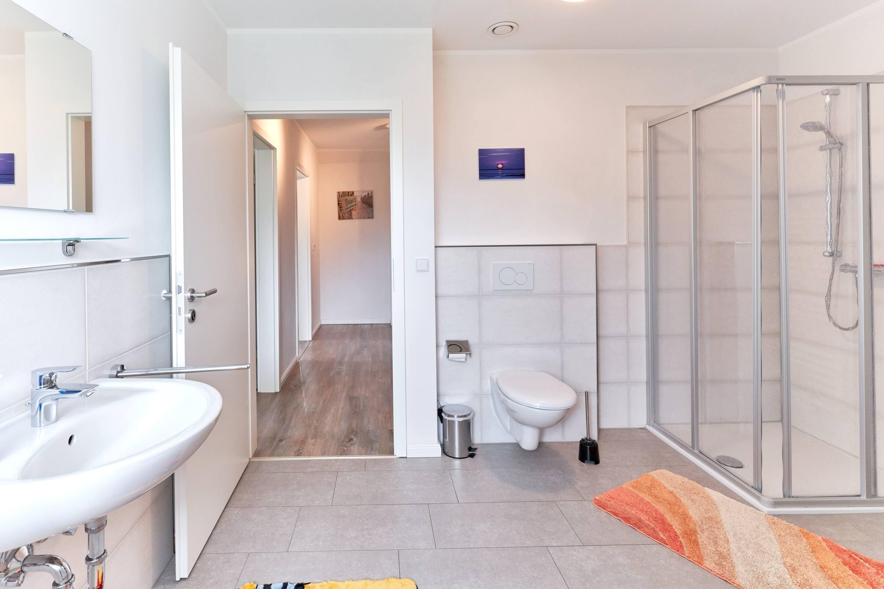 Das großzügige Badezimmer im Dachgeschoss bietet Ihnen eine Dusche, ein WC sowie ein Waschbecken – ideal für entspannte Wellnessmomente nach einem langen Tag an der frischen Luft.