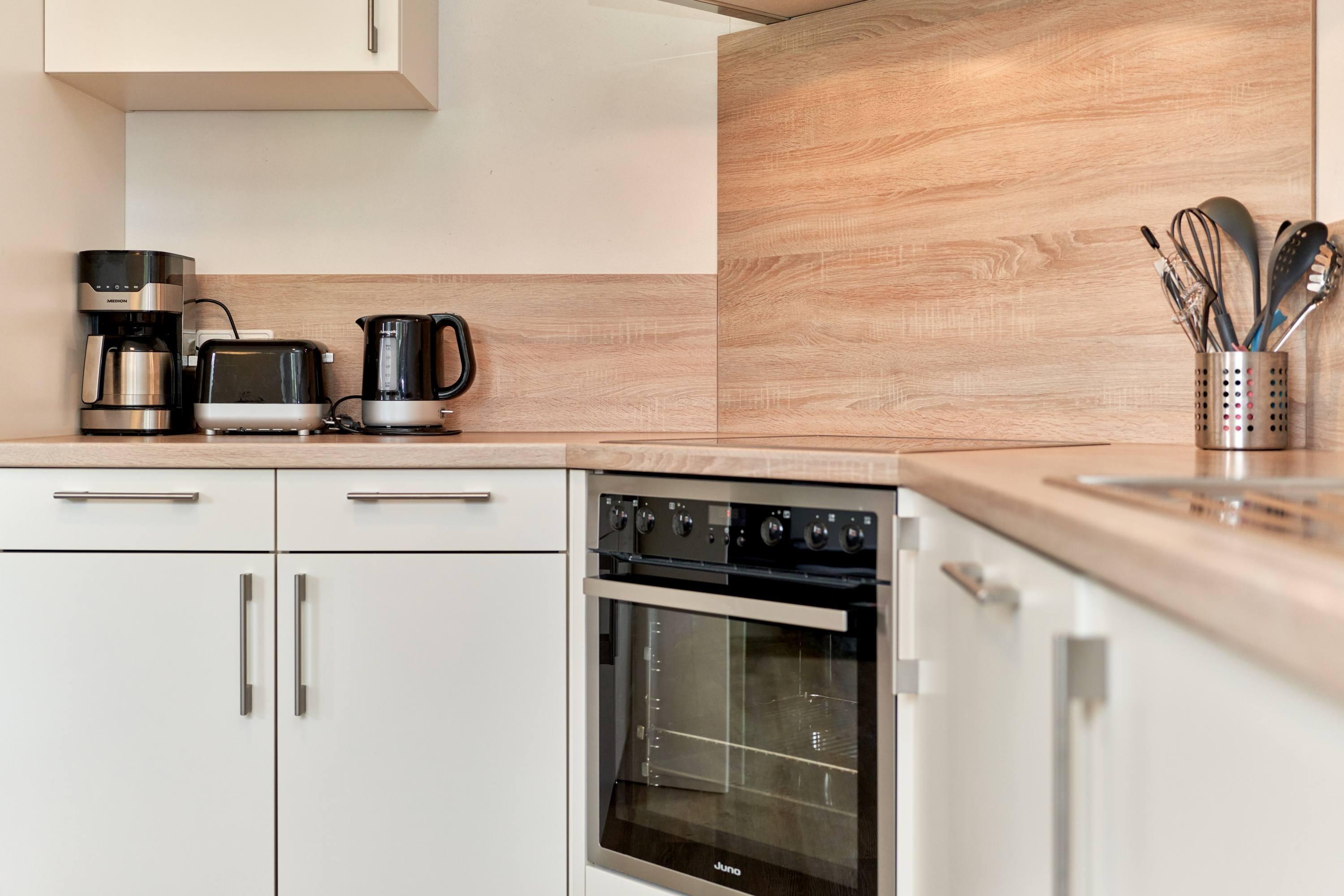Die moderne, voll ausgestattete Küche lässt keine Wünsche offen. Hier finden Sie alles, was Sie für die Zubereitung leckerer Mahlzeiten benötigen: