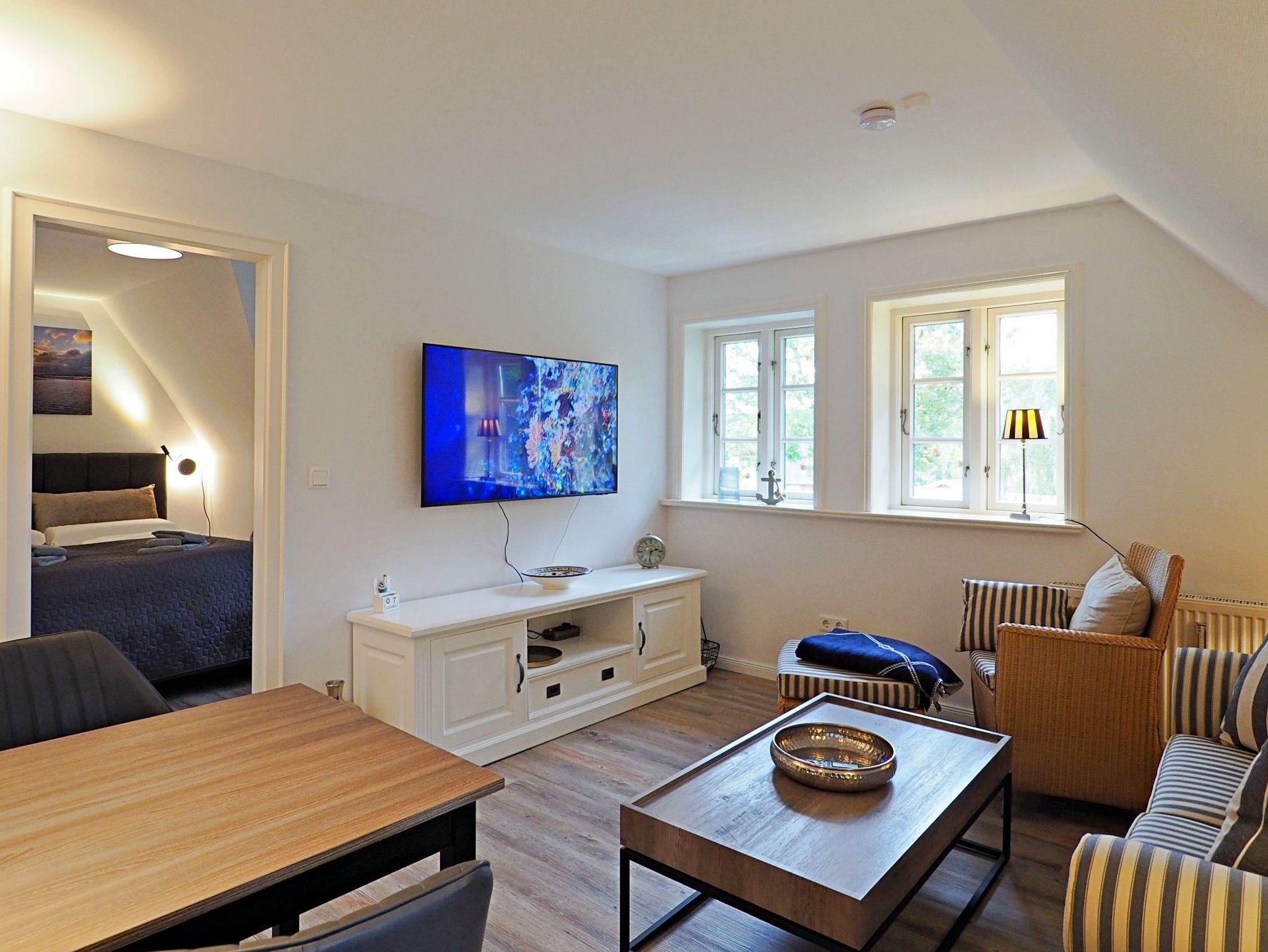 Zwei getrennte Schlafzimmer, einmal mit einem Doppelbett (1,60m x 2,00m) und einmal mit einem Einzelbett (0,90m x 2,00m), der gemütliche Wohn- und Essbereich mit offener Küche und das großzügige Bad stehen Ihnen ebenso zur Verfügung, wie kostenfreies WLAN, ein großes Smart-TV, ein Parkplatz direkt am Haus und Ihr eigener, großer Gartenbereich mit Gartenmöbeln und Strandkorb.