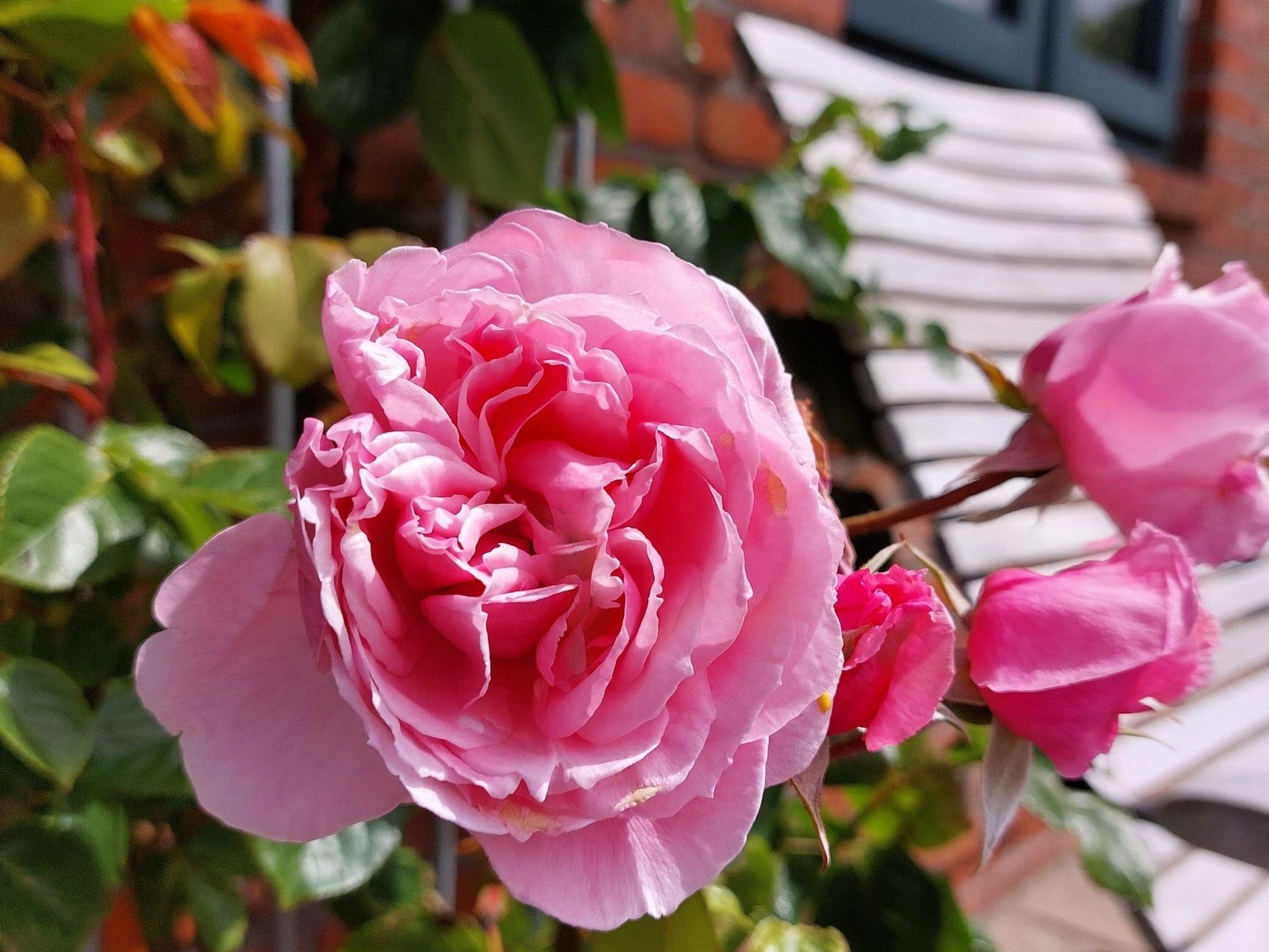 Sichtschutz zu den Nachbarn mit einer Ligusterhecke und zarten Rosen bepflanzt ist. Ein