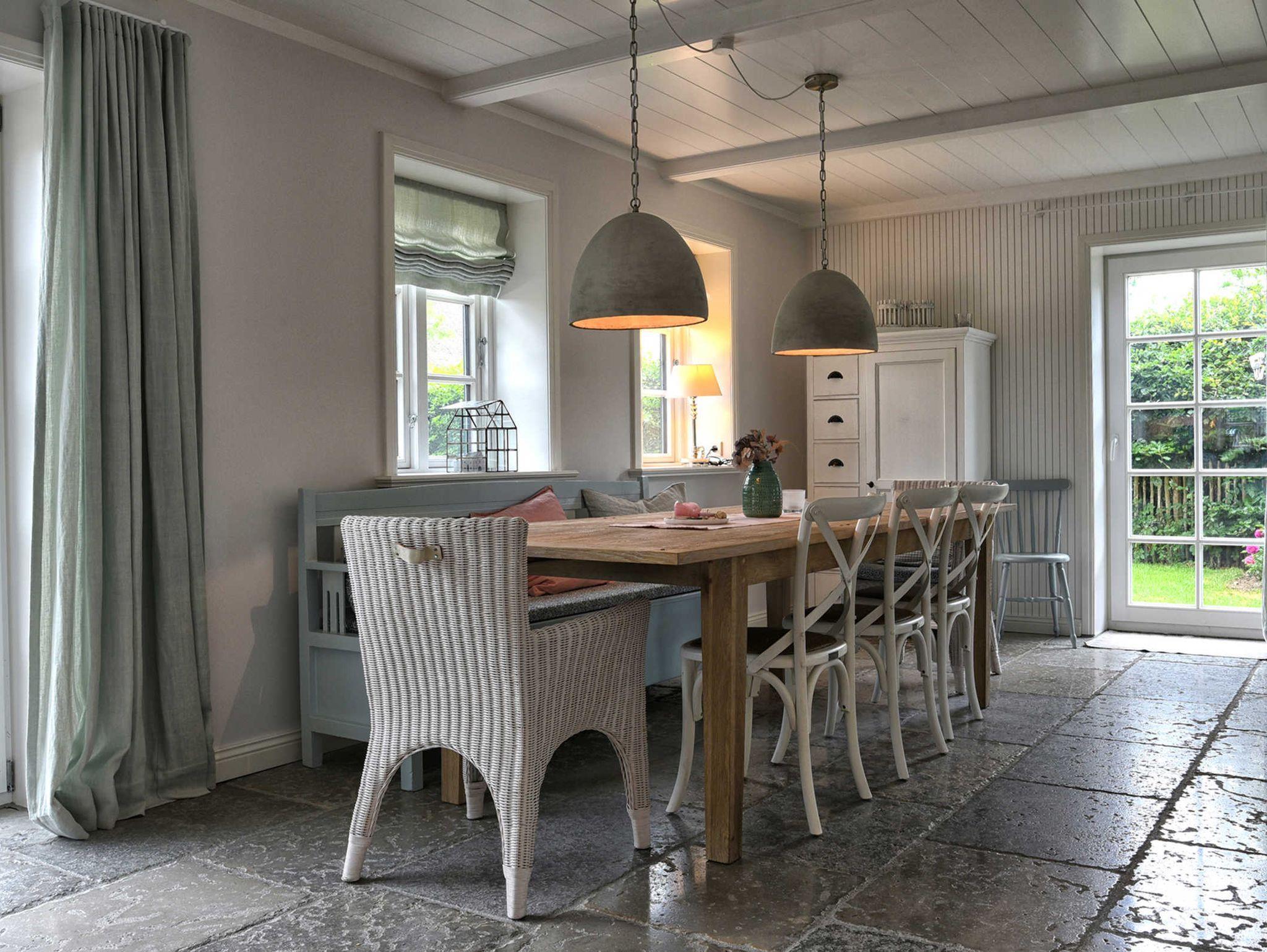 Der Wohn-/Essbereich besticht durch einen großen Holztisch. Ob essen, spielen oder