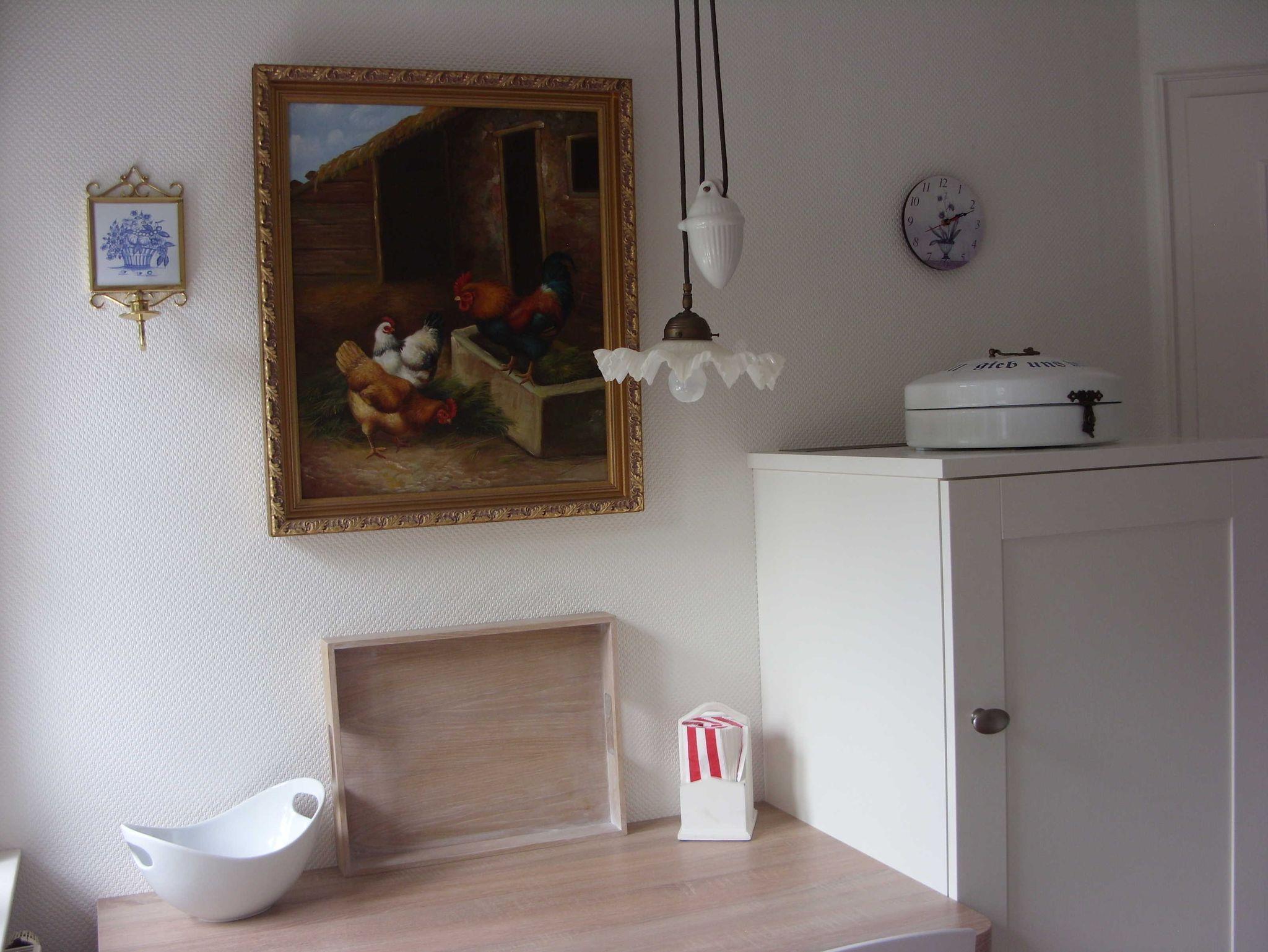 Es gibt auch eine Kaffeemaschine, einen Wasserkocher, Mixer, Toaster, Waffeleisen, Eierkocher und Pütt und Pann zum Kochen.
