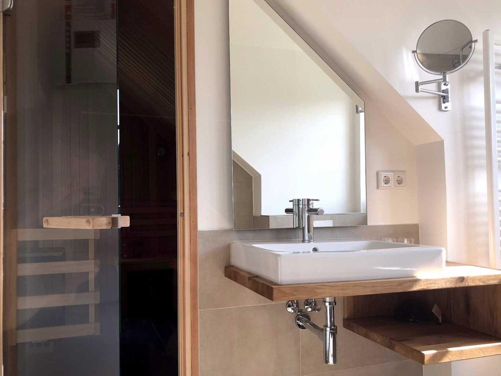 Sanitär: Bademantel, bodenebene Dusche, Föhn, Handtuchheizkörper, Schminkspiegel, Walk-In Dusche.