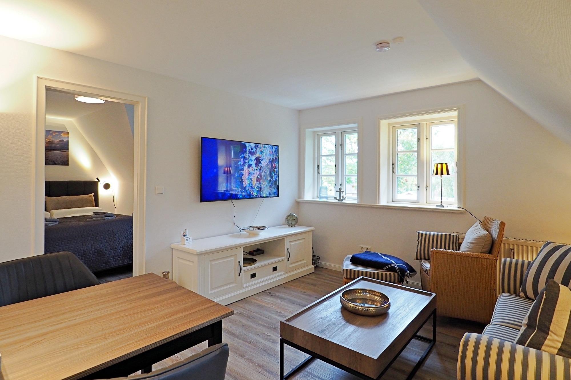 Zwei getrennte Schlafzimmer, einmal mit einem Doppelbett (1,60m x 2,00m) und einmal mit einem Einzelbett (0,90m x 2,00m), der gemütliche Wohn- und Essbereich mit offener Küche und das großzügige Bad stehen Ihnen ebenso zur Verfügung, wie kostenfreies WLAN, ein großes Smart-TV, ein Parkplatz direkt am Haus und Ihr eigener, großer Gartenbereich mit Gartenmöbeln und Strandkorb.