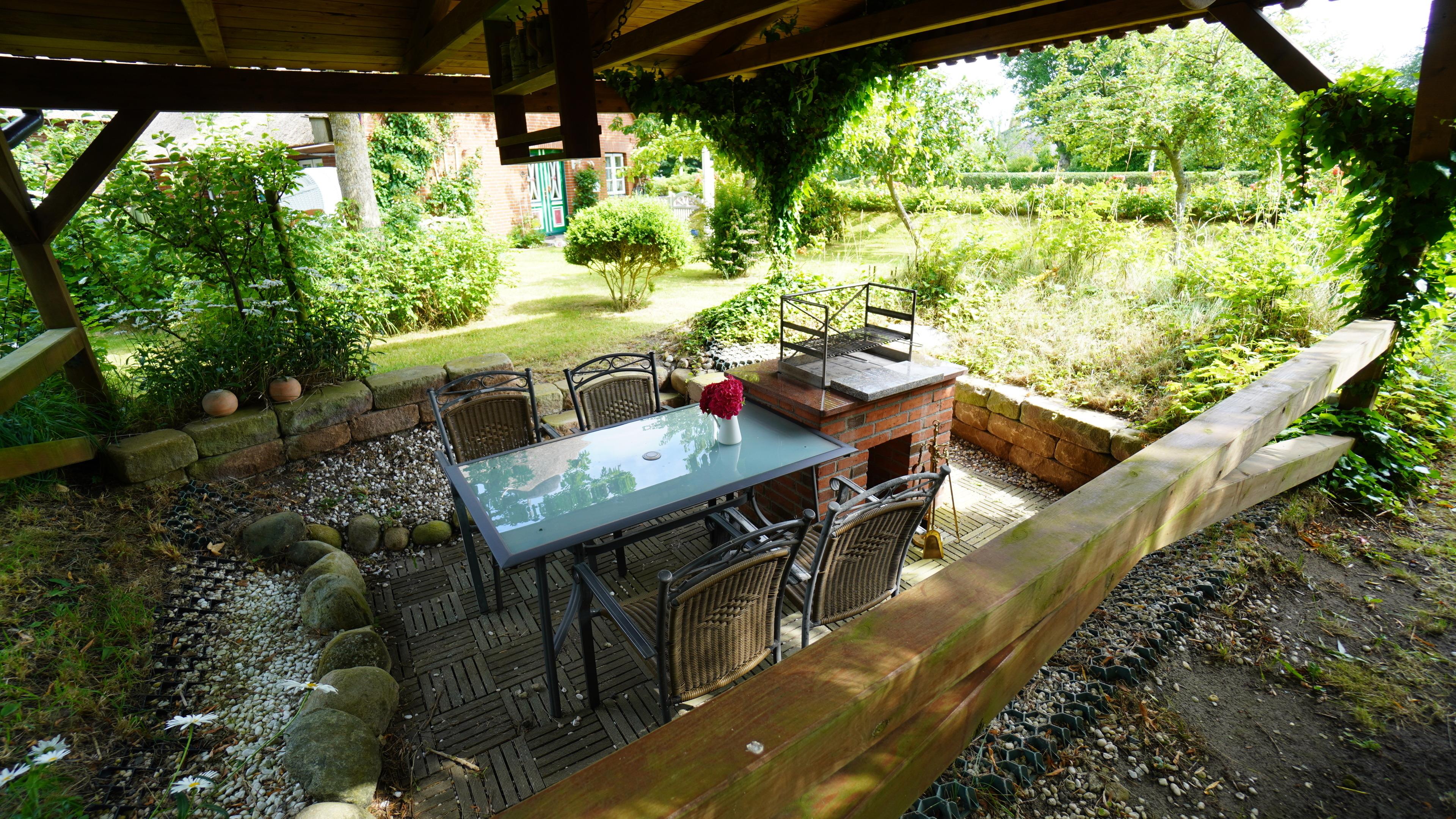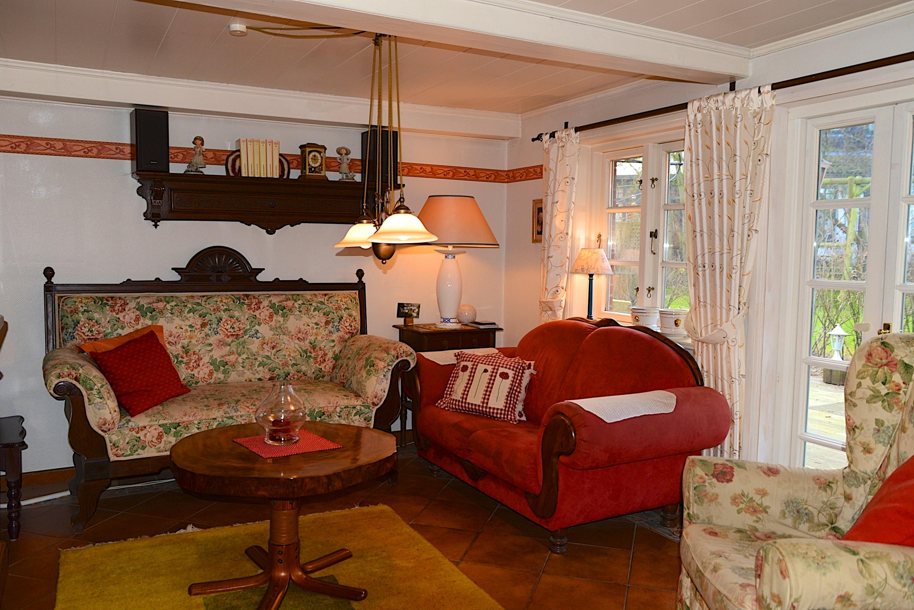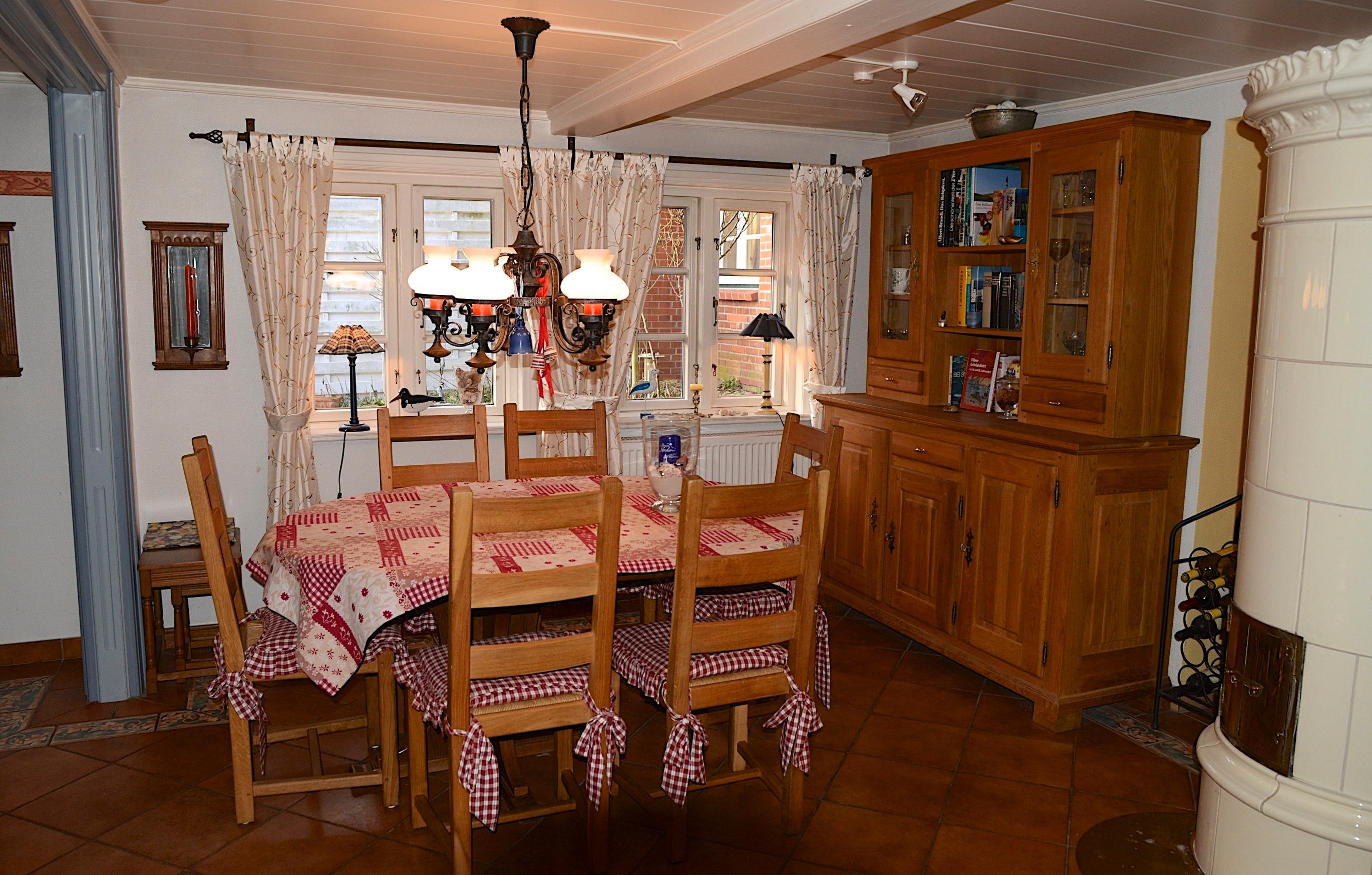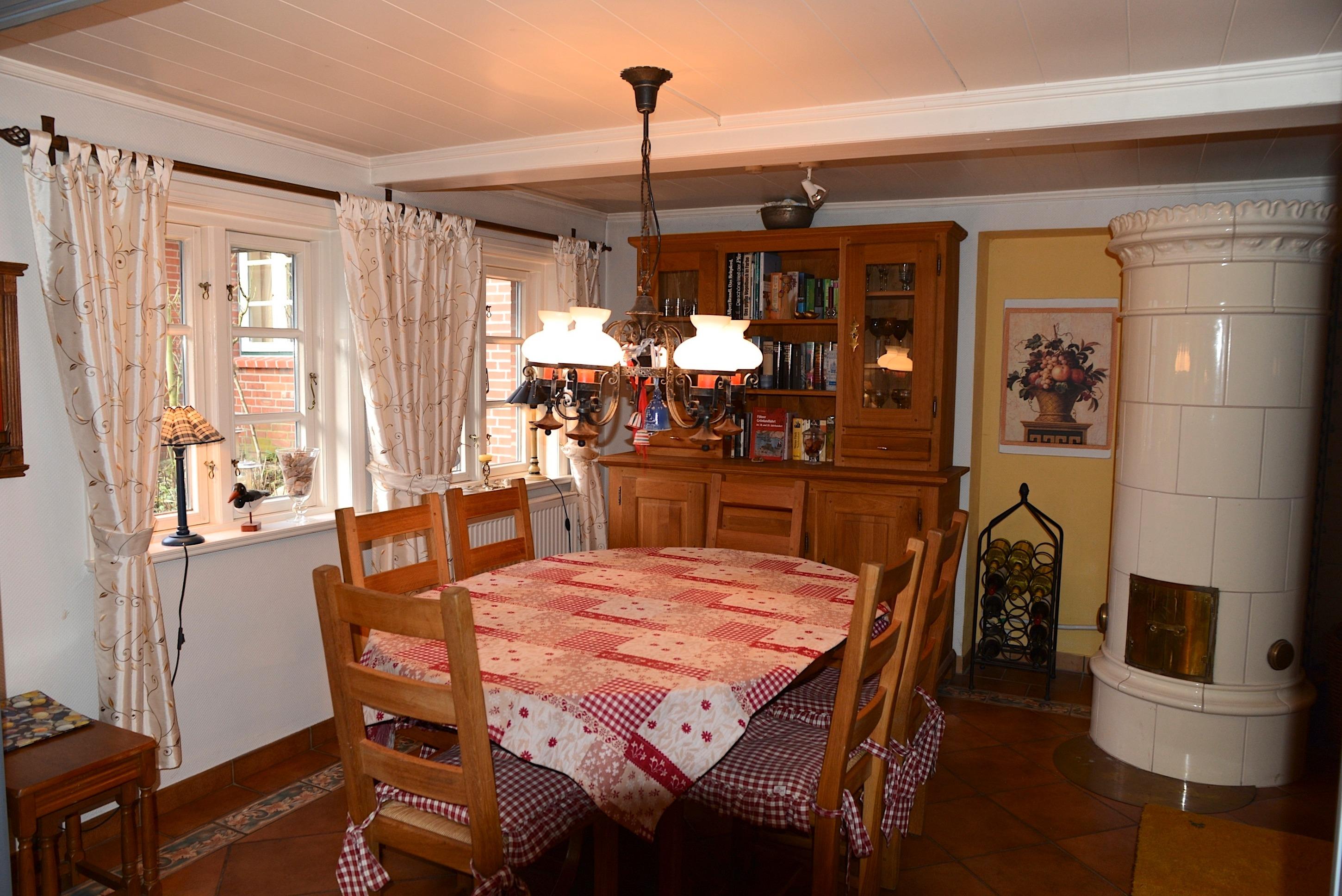 Im Erdgeschoss erwartet Sie ein großzügiger Wohn- und Essbereich mit einem friesischen Kachelofen, der an kühleren Abenden für wohlige Wärme sorgt.