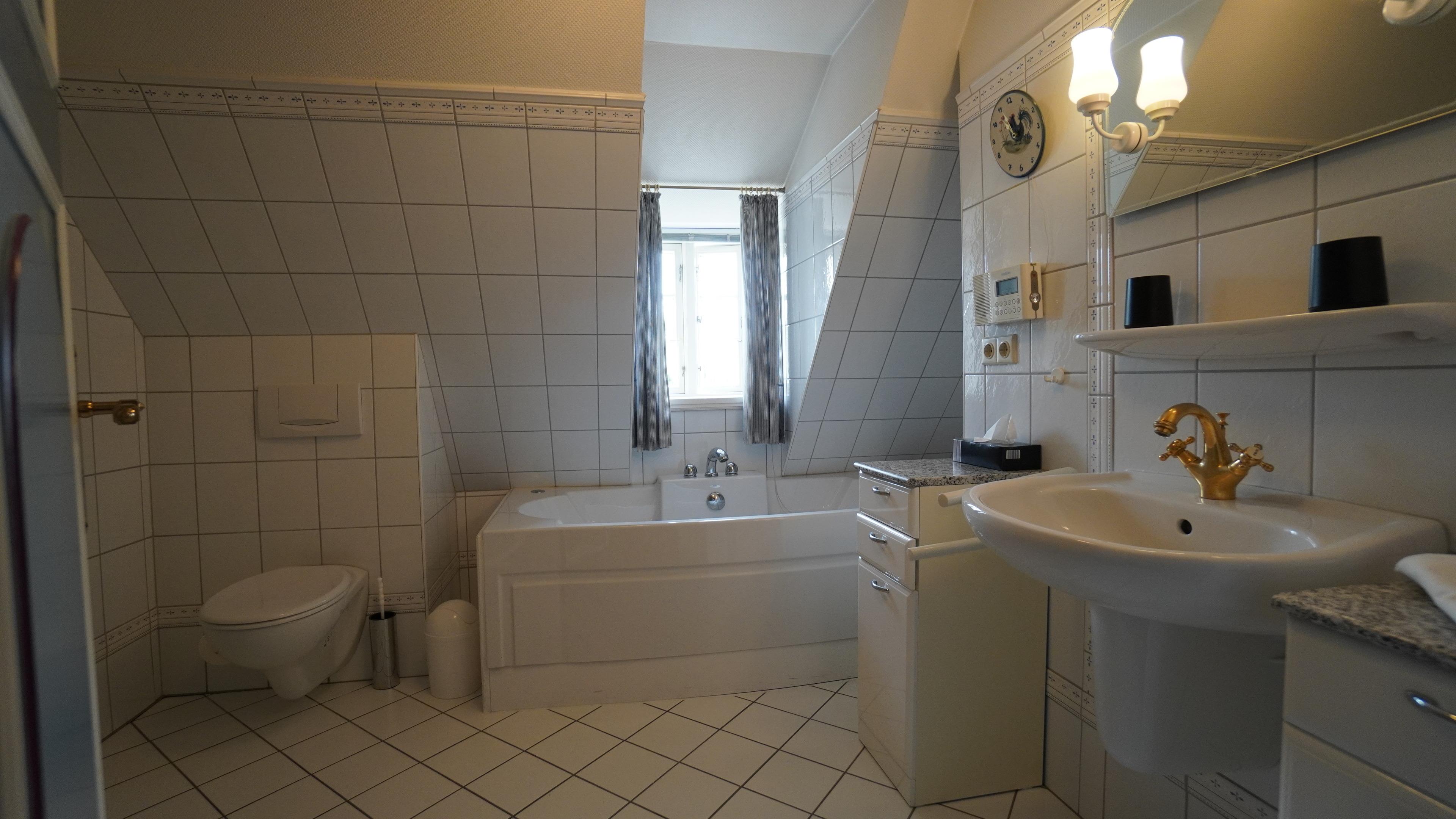 Das geräumige Badezimmer bietet eine Badewanne, eine separate Dusche und einen stilvollen Waschtisch.