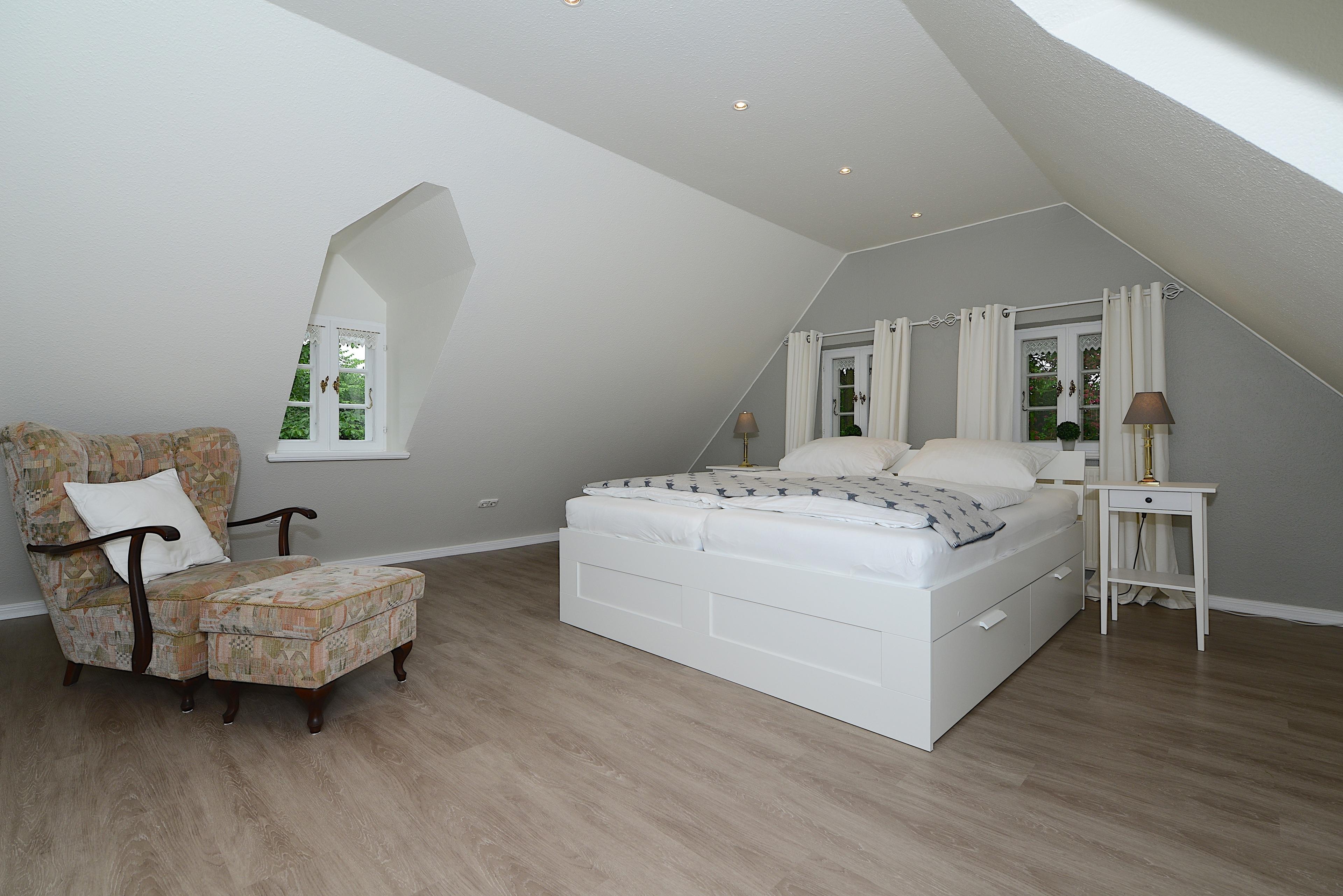 Im Obergeschoss erwartet Sie ein stilvolles Schlafzimmer mit exklusivem Designboden und ein großzügiges Badezimmer. Das Schlafzimmer ist mit einem hochwertigen Doppelbett ausgestattet, das für erholsamen Schlaf sorgt. Ein gemütlicher Ohrensessel lädt zum Entspannen ein. Das Badezimmer bietet Platz für Wellness-Momente mit einer großzügigen Runddusche und einem großen Waschtisch-WC-Bereich. Ein Fön, Waschmaschine und Trockner stehen Ihnen ebenfalls zur Verfügung.