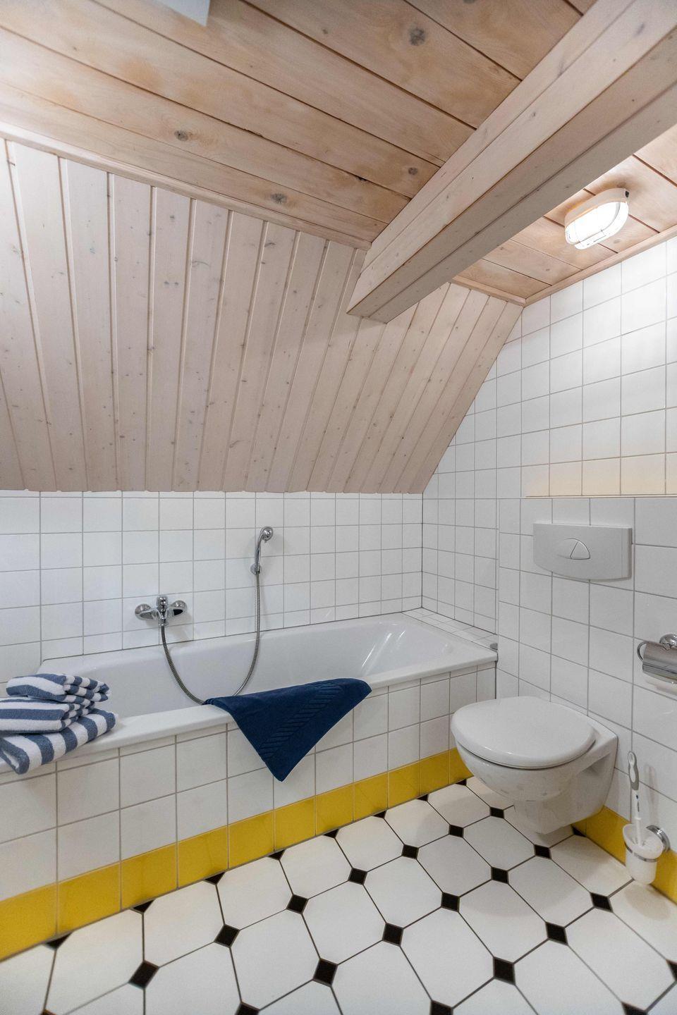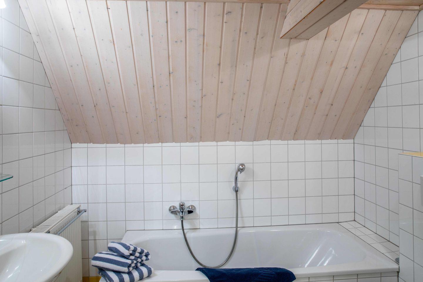 Im Obergeschoss erwarten Sie drei weitere Schlafzimmer, jeweils ausgestattet mit einem Bett (1,40 m x 2,00 m) und durchgehender Matratze. Auf dieser Etage befindet sich auch ein weiteres Badezimmer mit Badewanne und Dusche, das Entspannung für erholsame Stunden verspricht.