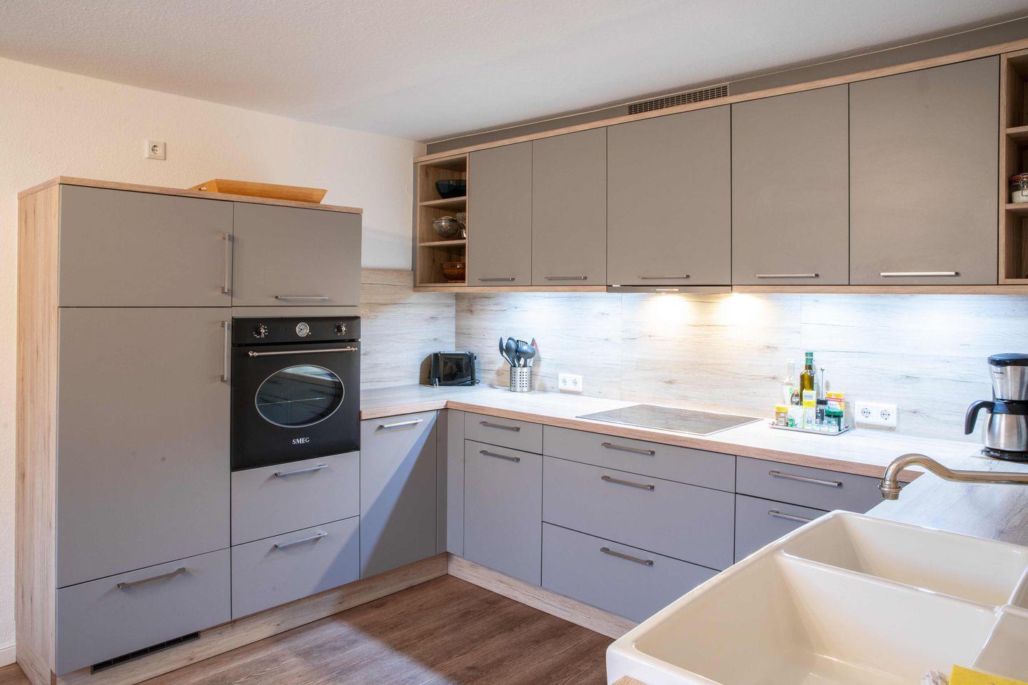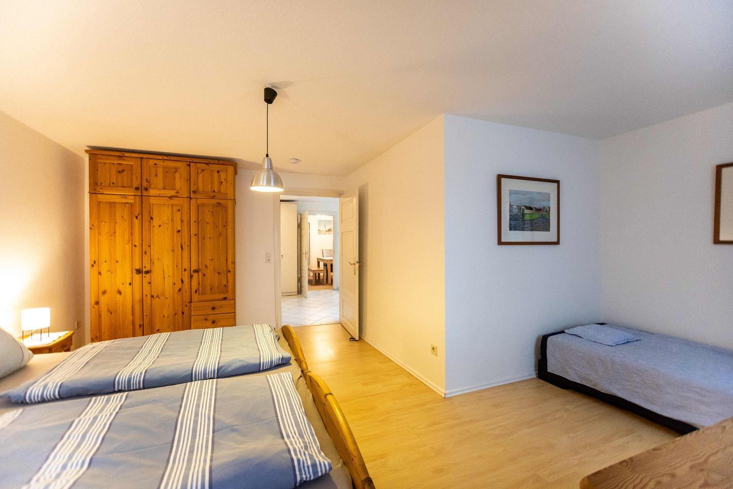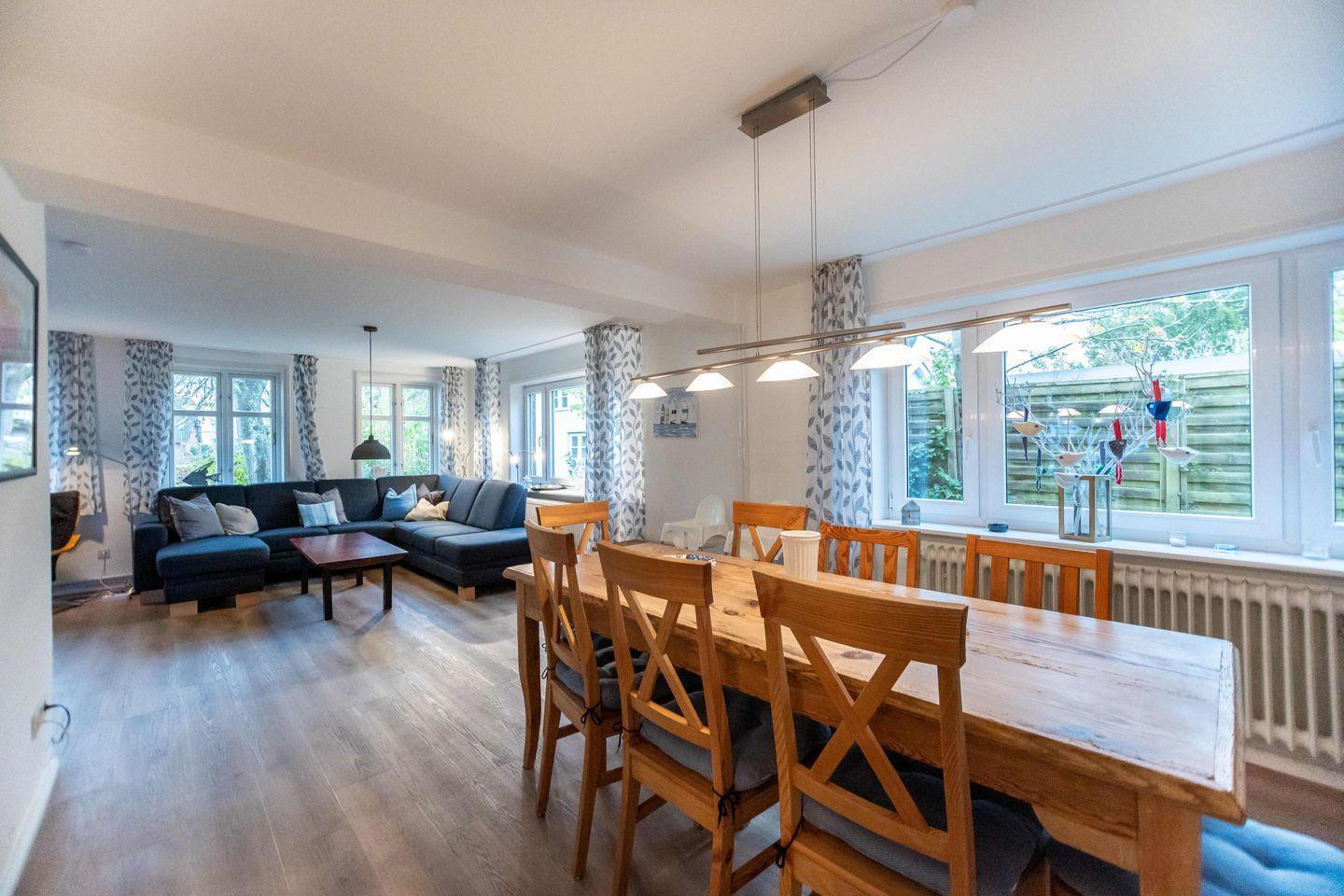 Die komplett neu gestaltete und hervorragend ausgestattete Küche ist ein kulinarischer Traum, der mit Geschirrspüler, Ceranfeld, Backofen und Mikrowelle keine Wünsche offen lässt. Hier können Sie nach Herzenslust für Ihre Liebsten kochen und sie mit kulinarischen Genüssen verwöhnen. Im Erdgeschoss erstreckt sich das großzügige Wohnzimmer, das Platz für gemütliche Stunden bietet, und ein zusätzlicher Esstisch lädt zu gemeinsamen Mahlzeiten ein. Zwei Schlafzimmer mit jeweils zwei Einzelbetten, die bei Bedarf zu Doppelbetten zusammengeschoben werden können, sowie ein drittes Schlafzimmer mit einem weiteren Einzelbett bieten bequeme Übernachtungsmöglichkeiten. Das Duschbad mit Fenster, das 2019 komplett saniert wurde, rundet das Angebot im Erdgeschoss ab.