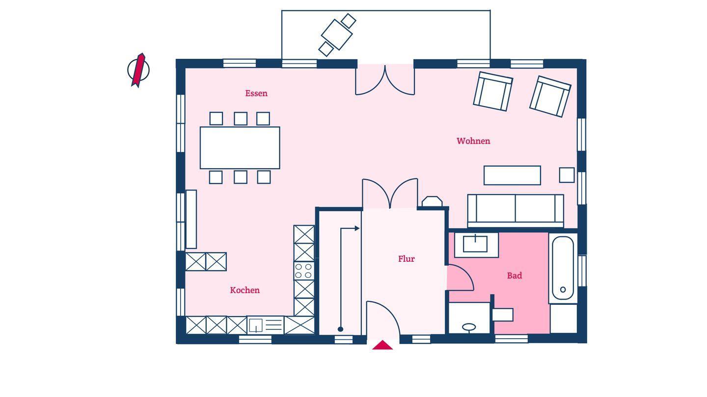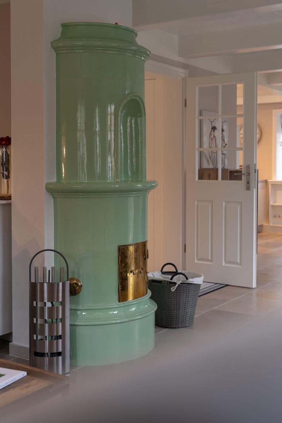 Im Erdgeschoss befinden sich der großzügige Wohn- und Essbereich mit offener Küche, sowie das Vollbad mit Dusche und Badewanne. Über den Wohnbereich gelangen Sie auf die hauseigene Terrasse und in den Garten. Der Original Mylin-Kachelofen in mintgrün sorgt auch an kühleren Tagen für eine angenehme Atmosphäre.