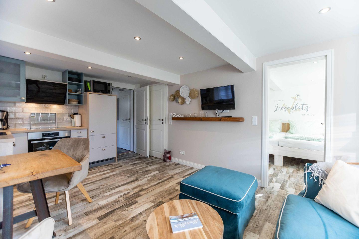 Die Unterkunft verfügt über ein Schlafzimmer mit zwei Schlafmöglichkeiten sowie ein gut ausgestattetes Badezimmer mit einer bodengleichen Dusche. Die geräumige Wohnfläche umfasst ein Wohnzimmer mit Sofaecke, einem Sessel und einem Esstisch, wo Sie gemeinsam essen und entspannen können. Der offene Küchenbereich ist mit modernen Geräten ausgestattet, darunter ein Cerankochfeld, ein Elektrobackofen, eine Spülmaschine, ein Kühlschrank mit Gefrierfach sowie weitere Küchenutensilien wie ein Toaster und eine Kaffeemaschine. Diese Ausstattung ermöglicht es Ihnen, leckere Mahlzeiten zuzubereiten, während Sie den Blick auf den Garten genießen.