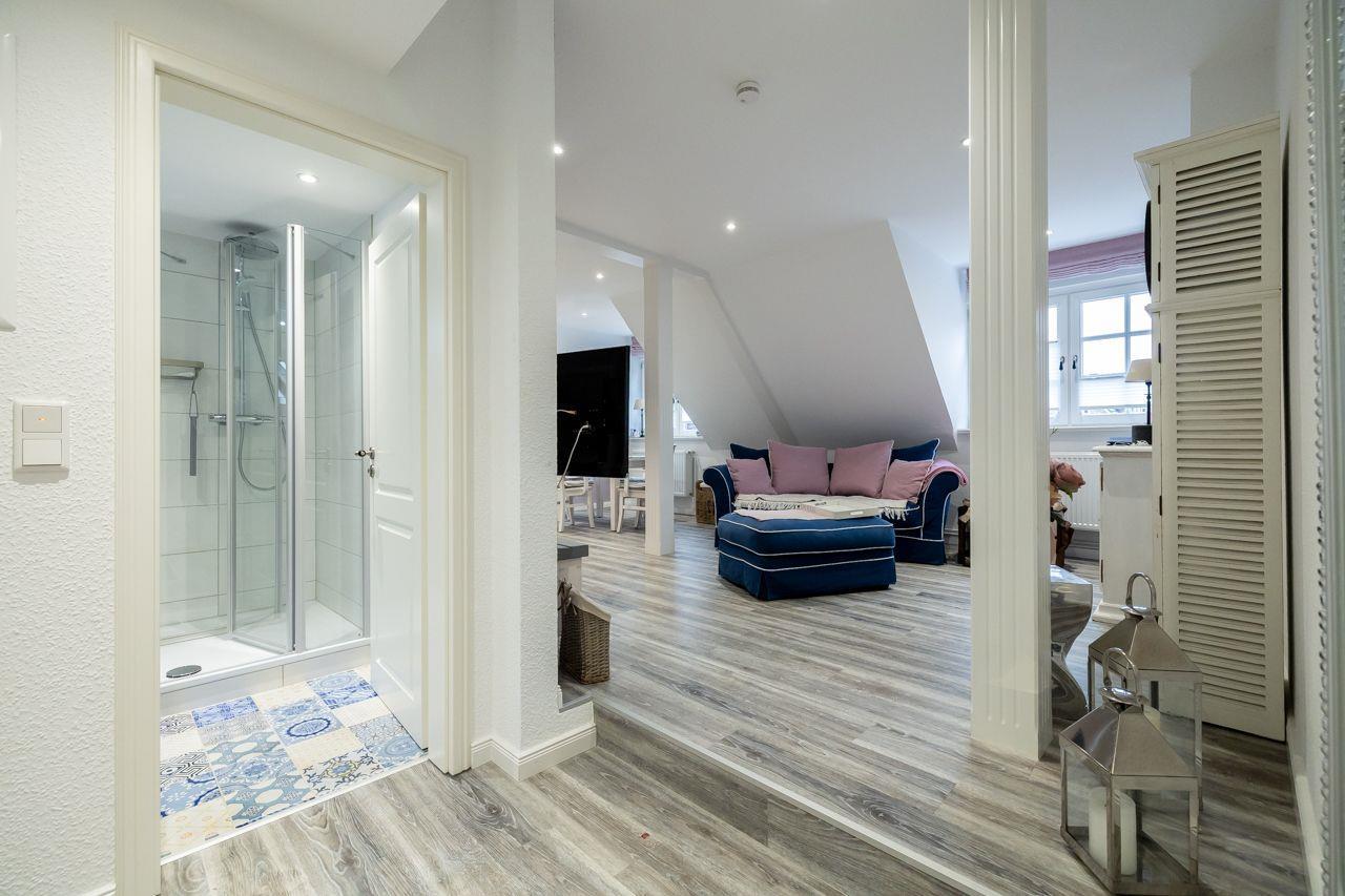 Töwerland 2 in Oevenum ist die perfekte Wahl für einen erholsamen Urlaub. Der Flur führt Sie über ein paar Stufen hinauf in die 1. Etage. Dort erwartet Sie ein großzügiger Wohn-Ess-Küchenbereich, der einen gemütlichen Ort bietet, um sich zu entspannen und zu unterhalten. Von dem Flur aus gelangen Sie zu einem Zimmer mit Einzelbett, das zu dem Schlafzimmer mit einem bequemen Doppelbett führt. Die Wohnung bietet eine große, gut ausgestattete Küche mit einem Esstisch, an dem Sie alle Mahlzeiten des Tages zusammen einnehmen können. Hinter dem Haus im Garten (die Terrasse liegt nicht an der Wohnung, sondern ist über das Grundstück erreichbar) haben Sie eine eigene, eingezäunte kleine Terrasse. Ein Strandkorb am Hundestrand in Goting (Strandkorbsaison ist von Mai bis September. Es gibt einen Strandkorb für beide Wohnungen.) rundet das Angebot ab. Die Ferienwohnung befindet sich in der 1. Etage. Im Erdgeschoss des Hauses liegt die Ferienwohnung Töwerland 1. Hier gibt es Platz für bis zu 2 Personen und einen kleinen Hund. Ein gemeinsamer Familienurlaub, bei dem sich dennoch jede Familie für sich zurückziehen kann, ist sehr gut möglich. Auf dem Grundstück befindet sich eine Garage, die Sie zum Abstellen Ihrer Fahrräder kostenfrei nutzen dürfen.