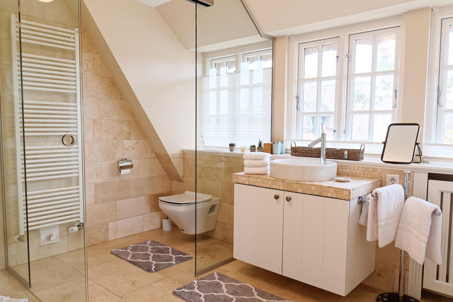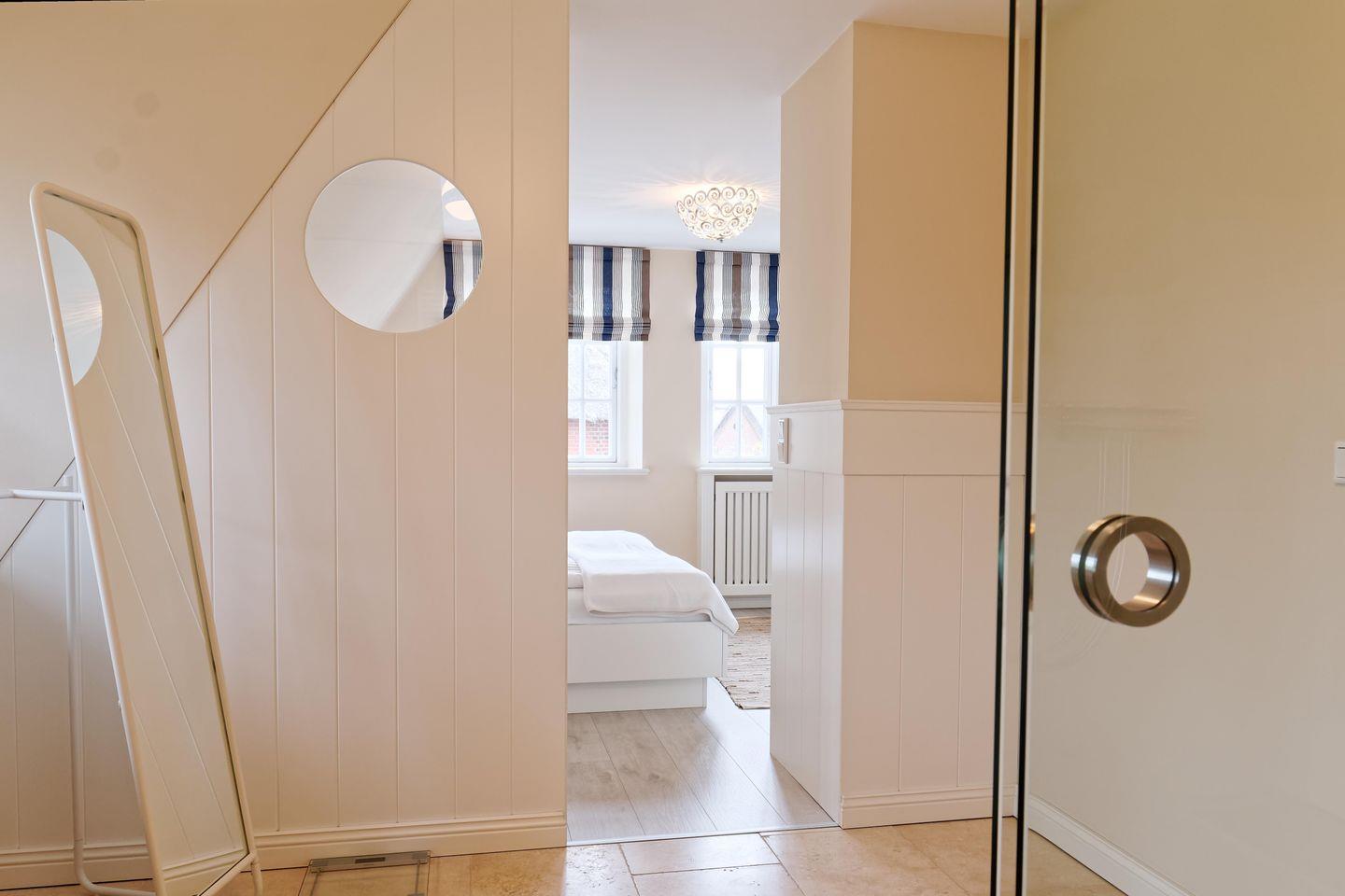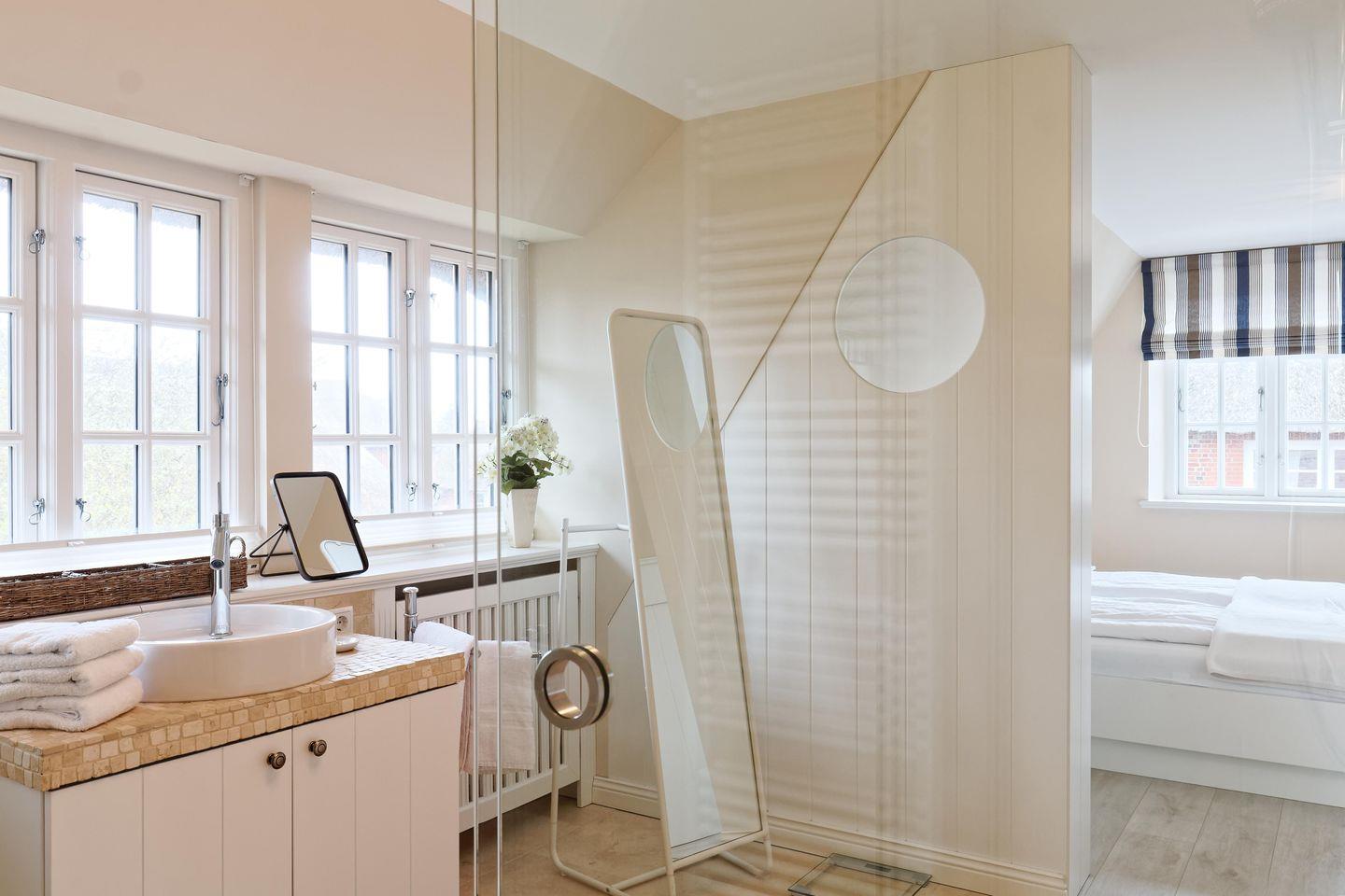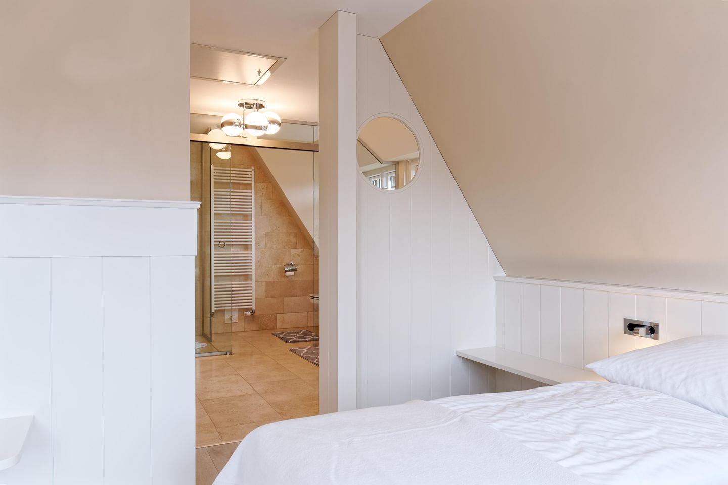 Im Obergeschoss sind die zwei Schlafzimmer - eines mit einem Doppelbett und eines mit zwei Einzelbetten -, sowie ein weiteres Duschbad gelegen. Das Duschbad bildet ein weiteres Highlight des Feriendomizils Dorftraum. Es ist als ansprechendes Durchgangszimmer geplant, sodass es ein offenes Raumgefühl zwischen Master-Bedroom und Duschbad entstehen lässt.
