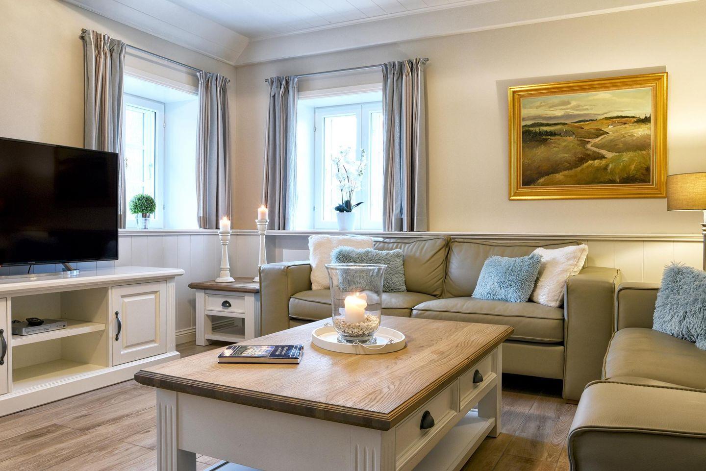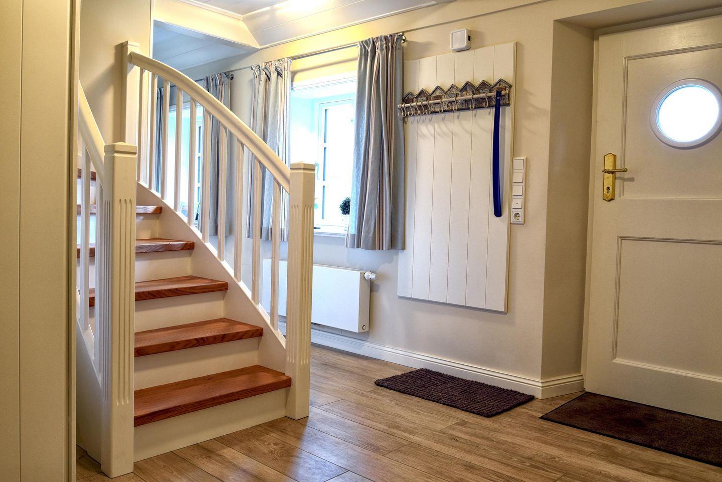 Im Erdgeschoss befindet sich die großzügige Küche, der Wohnbereich, eines der beiden Badezimmer sowie ein Hauswirtschaftsraum. Die Küche ist voll ausgestattet und verfügt über einen Esstisch für bis zu 6 Personen und einen Smart-TV. Außerdem ist in der Küche eine Nespresso Kapselmaschine vorhanden. Das hell eingerichtete Wohnzimmer ist ebenfalls mit einem Smart-TV und einer gemütlichen Sofaecke, sowie einem Internetradio ausgestattet. Das Badezimmer im Erdgeschoss beinhaltet eine bodengleiche Dusche. In dem Hauswirtschaftsraum finden Sie Waschmaschine und Trockner vor. Von dem großzügigen Flur gelangen Sie in den Garten und zur Terrasse. Das Badezimmer, das Wohnzimmer und die Küche werden über eine Fußbodenheizung mit Wärme versorgt.