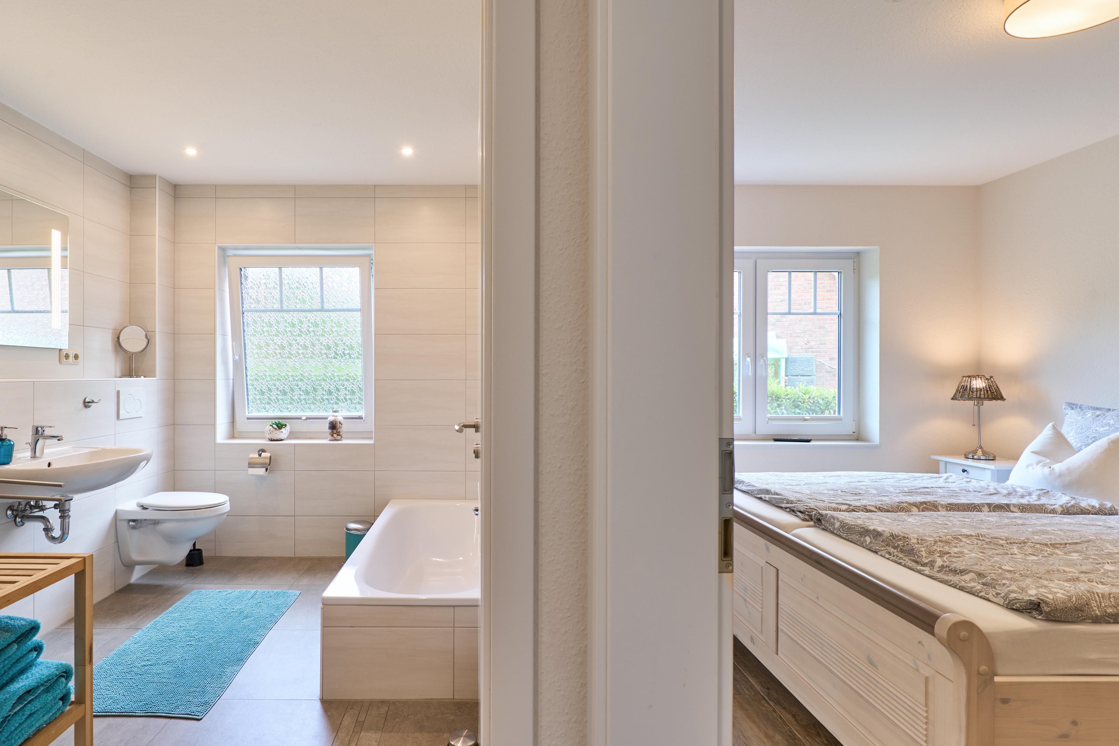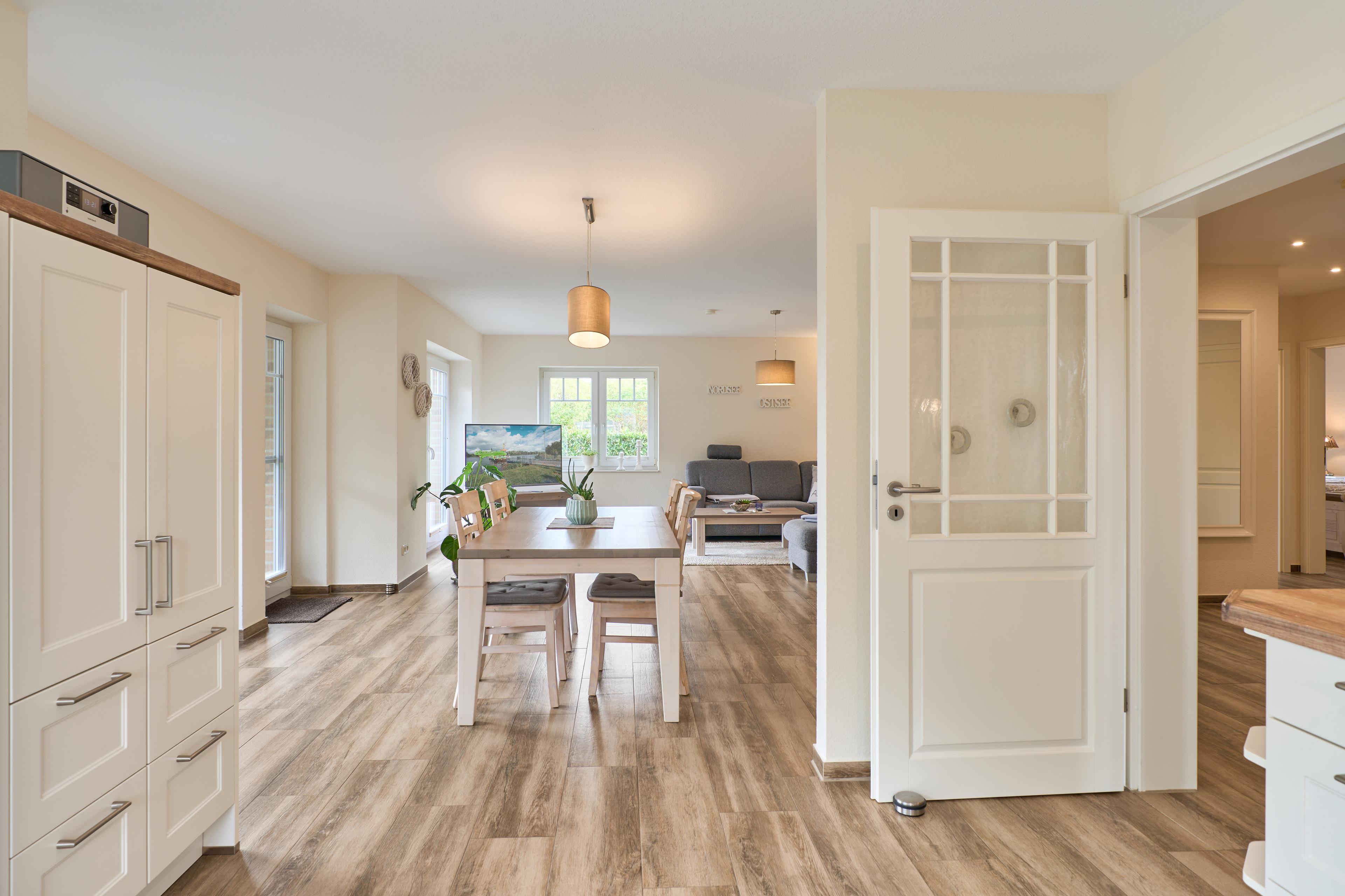 Die Ferienwohnung Schiffsdeck im Erdgeschoss ist hochwertig und geschmackvoll im hellen, modernen Landhausstil eingerichtet. In der lichtdurchfluteten Wohnung finden Sie viel Platz und Komfort für Ihren Traumurlaub. Der großzügige Schnitt der Wohnung lädt zum Erleben ein, ob gemeinsam oder lieber alleine, hier genießen Sie viel Freiraum, aber auch individuelle Rückzugsorte. Auf der großen Sonnenterrasse, die direkt vom Wohn- und Essbereich begehbar ist, finden Sie hochwertige Gartenmöbeln, einen Weber Gasgrill und natürlich einen Sonnenschirm. Der Garten mit viel Rasenfläche ist ideal für Familien mit Kindern. Die Wohnung ist bedingt barrierefrei, auf Wunsch steht Ihnen ein mobile Rollstuhlrampe zur Verfügung. Von der Nebeneingangstür zusätzlich zum Haupteingang könne Sie die Wohnung direkt vom Carport aus betreten. Zwei geräumige Schlafzimmer (Doppelbett 180x200) mit TV laden hier nach einem tollen Urlaubstag zum Träumen ein. Die Schlafzimmer haben zusätzlich zu den Plissees elektrische Aussenrollläden, damit Sie auch im Sommer nicht auf einen erholsamen Schlaf verzichten müssen. Der Wohn- und Essbereich bietet mit seinen bodentiefen Fenstern einen herrlichen Blick auf den NOK. Träumen Sie beim Kochen in der hochwertig ausgestatteten Küche von großen Pötten und der weiten Welt oder genießen Sie von der großen Wohnlandschaft das ständige pendeln der Fähre. Die Wohnung ist komplett ausgestattet, neben dem 55 Zoll TV mit DVD Player und Sonoro Soundsystem, im Wohnbereich, finden Sie eine feine Auswahl an Lektüren und Spielen. Unsere kleinen Gäste liegen uns sehr am Herzen, für sie stellen wir Ihnen gerne unsere Kleinkindausstattung zur Verfügung. Genießen Sie entspannte Sonnentage in der sehr gepflegten Gartenanlage mit viel Platz zum relaxen, Kraft tanken, entspannen oder toben und spielen. Staunen Sie über die vorbeiziehenden Schiffe oder beobachten Sie das rege Treiben der NOK- Fähre.
