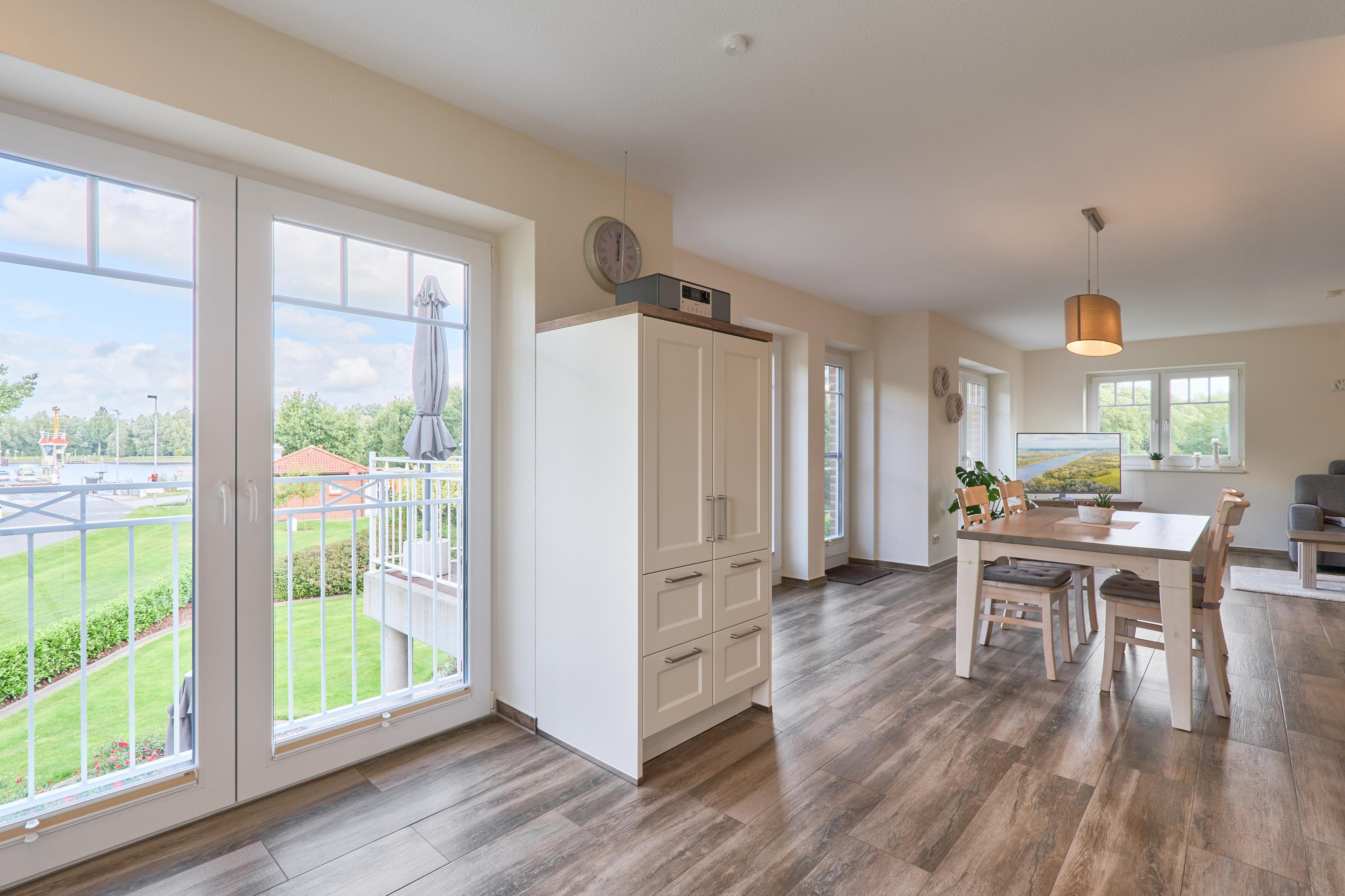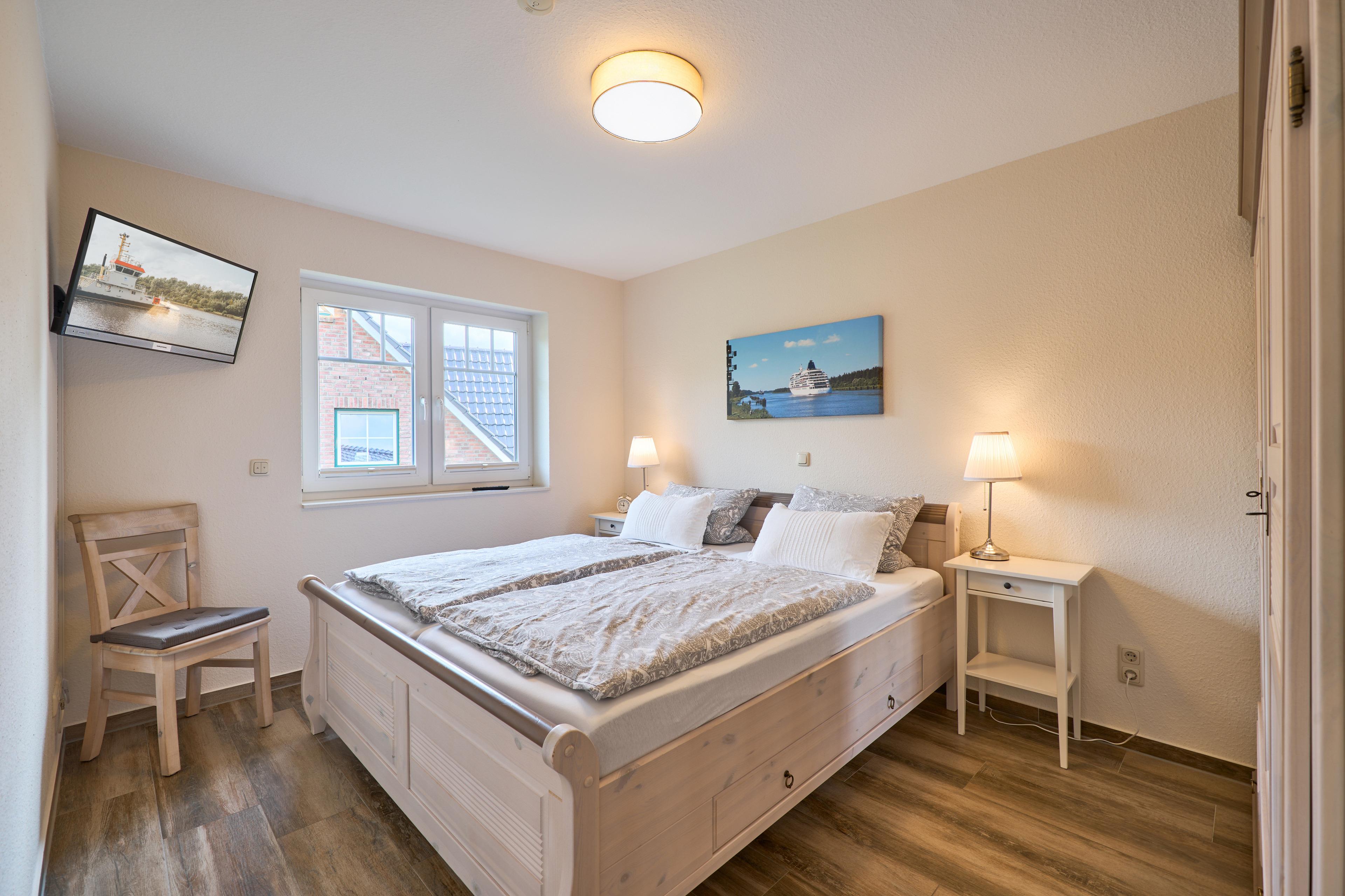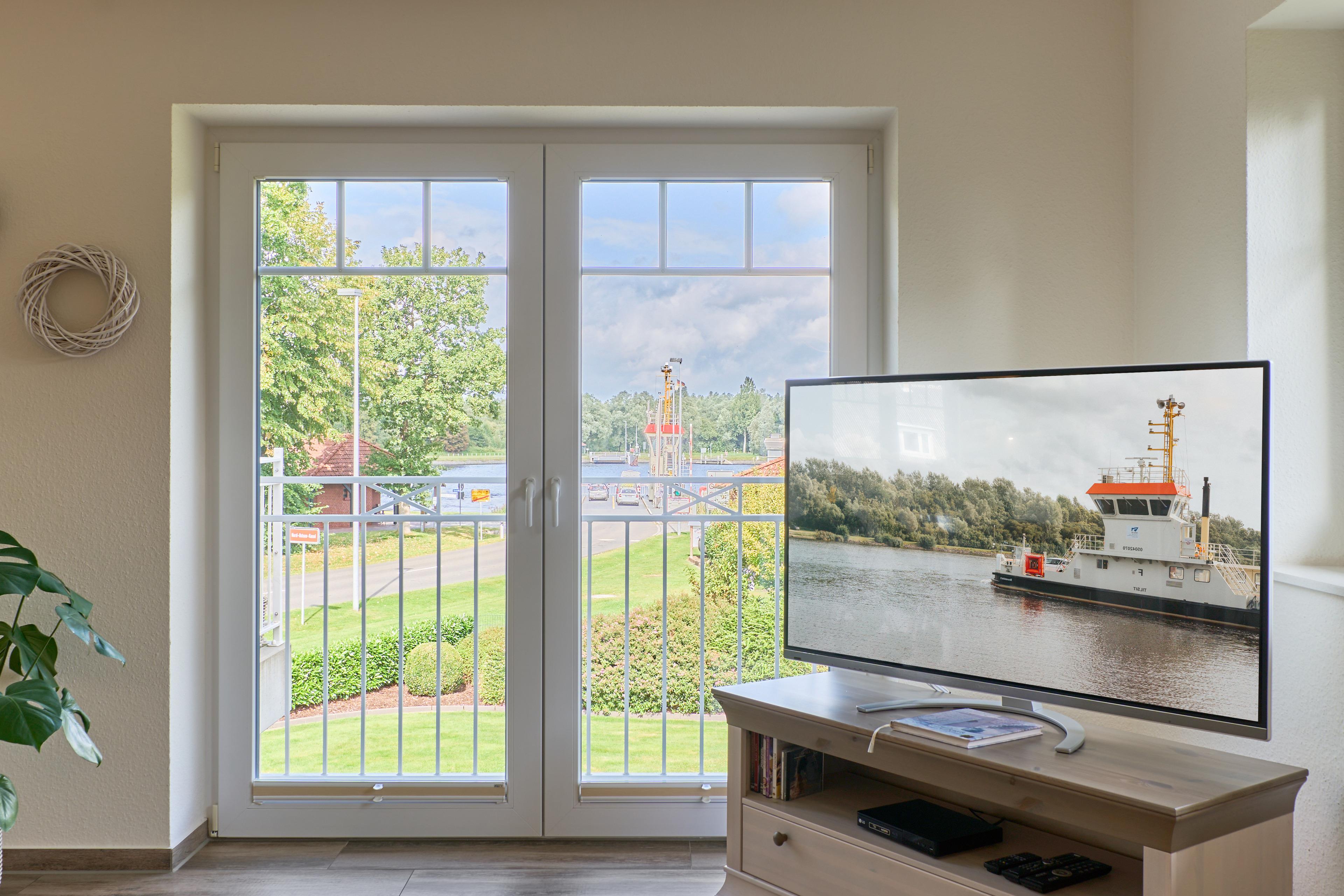 - Die Ferienwohnung befidet sich im ersten Stock, verzaubert mit großem Balkon mit hochwertigen Gartenmöbeln, Weber E- Grill und Sonnenschirm, von dem Sie die Sicht auf den NOK ungestört genießen können. Staunen Sie über die vorbeiziehenden Schiffe oder beobachten Sie das rege Treiben der NOK- Fähre. Zwei geräumige Schlafzimmer laden hier nach einem tollen Urlaubstag zum Träumen ein. Die Schlafzimmer (Doppelbett 180x200) mit TV haben zusätzlich zu den Plissees elektrische Rollläden, damit Sie auch im Sommer nicht auf einen erholsamen Schlaf verzichten müssen. Der Wohn- und Essbereich bietet mit seinen bodentiefen Fenstern einen herrlichen Blick auf den NOK, träumen Sie beim Kochen in der hochwertig ausgestatteten Küche von großen Pötten und der weiten Welt oder genießen Sie von der großen Wohnlandschaft das ständige pendeln der Fähre. Die Wohnung ist komplett hochwertig ausgestattet, neben dem 55 Zoll TV mit DVD Player und Sonoro Sound System finden Sie eine feine Auswahl an Lektüren und Spielen. Unsere kleinen Gäste liegen uns sehr am Herzen, für sie stellen wir Ihnen gerne unsere Kleinkindausstattung zur Verfügung.