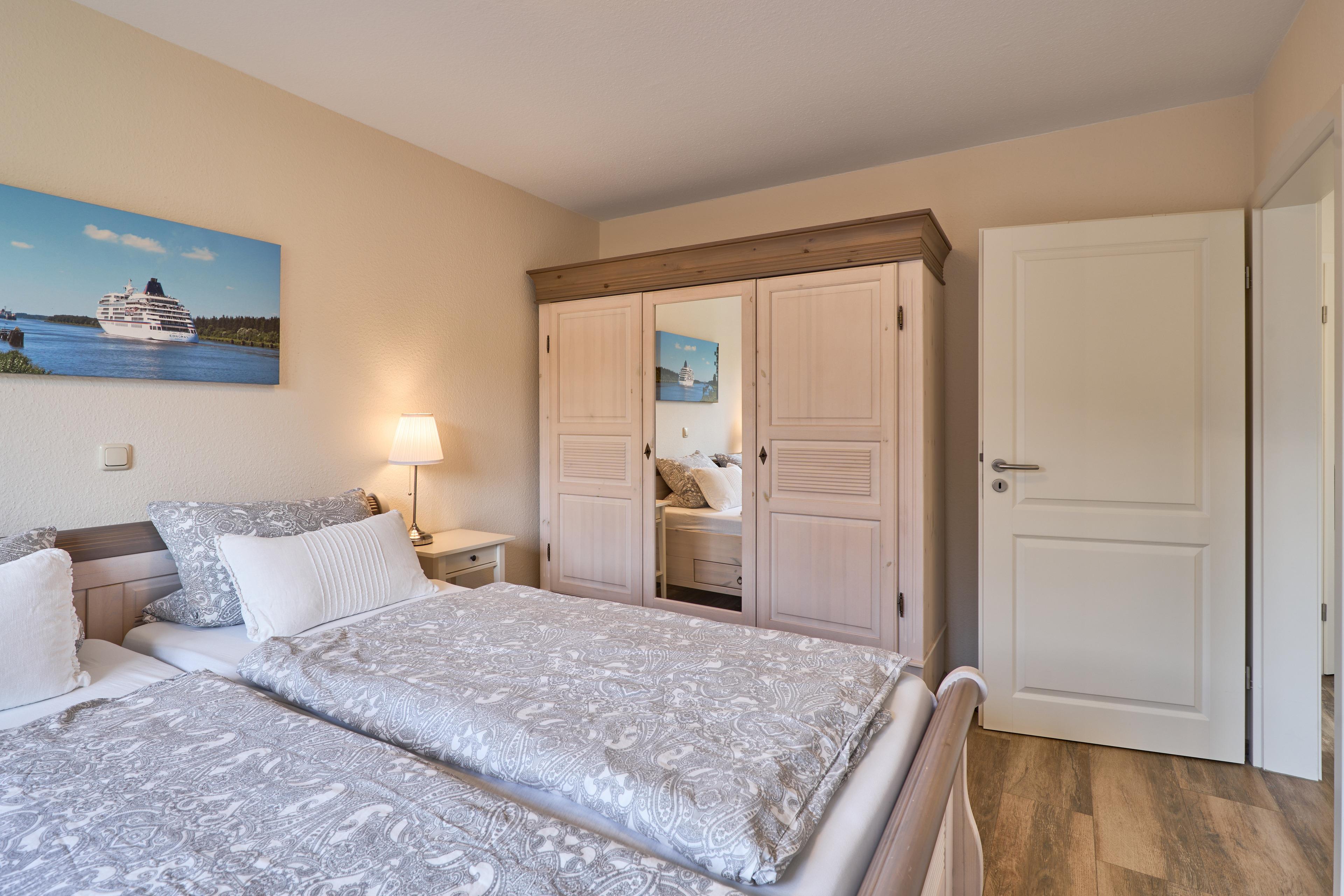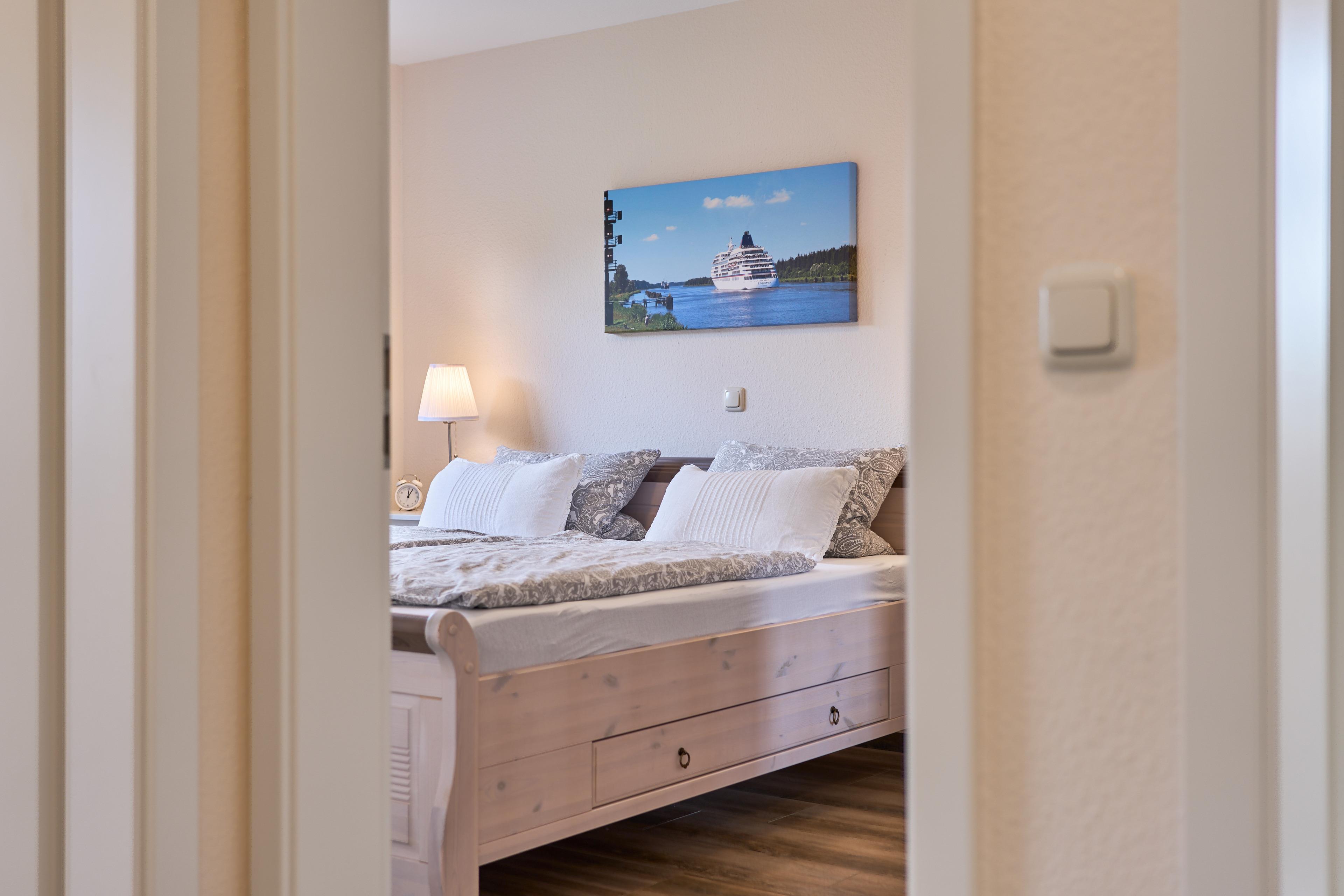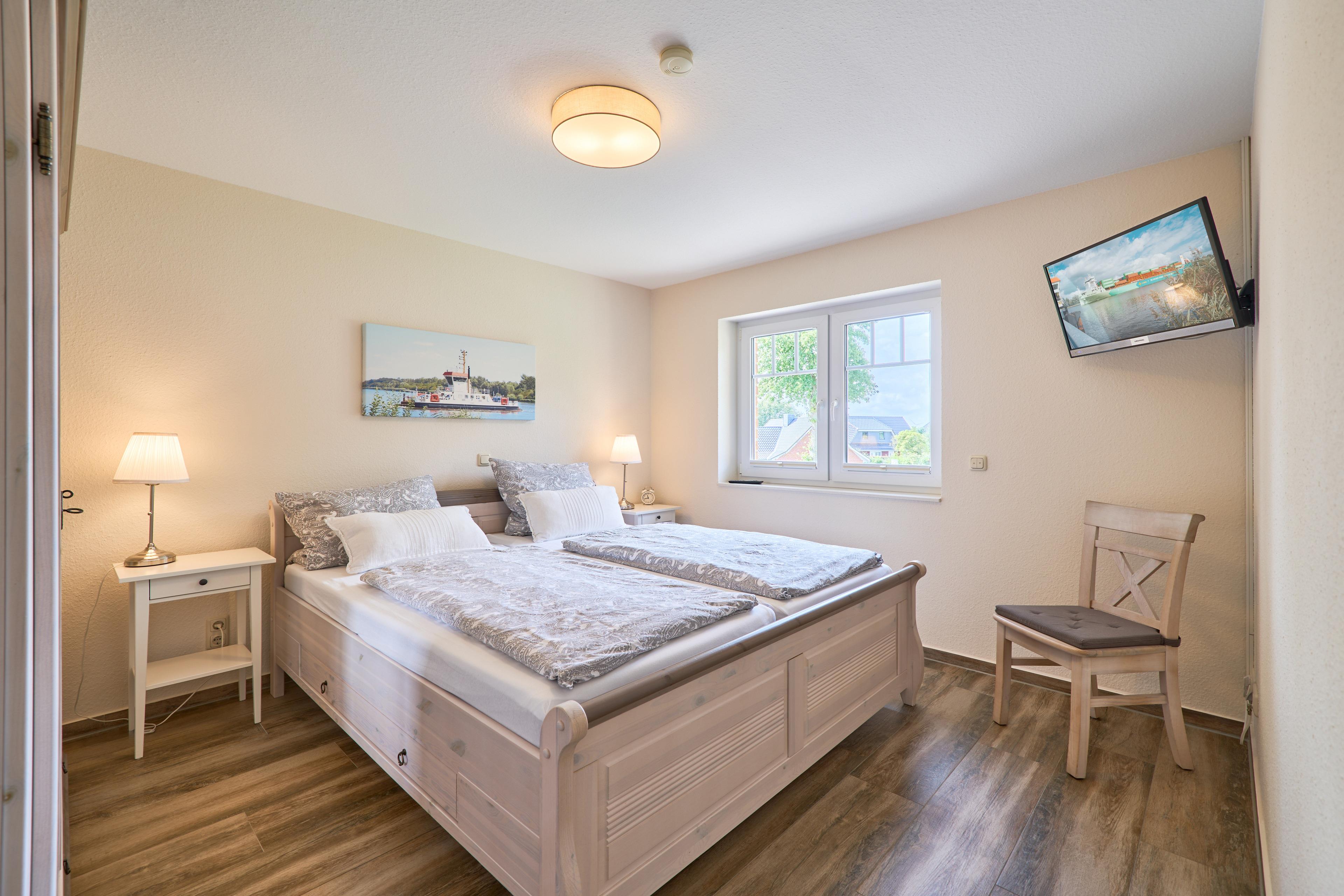 - Die Ferienwohnung befidet sich im ersten Stock, verzaubert mit großem Balkon mit hochwertigen Gartenmöbeln, Weber E- Grill und Sonnenschirm, von dem Sie die Sicht auf den NOK ungestört genießen können. Staunen Sie über die vorbeiziehenden Schiffe oder beobachten Sie das rege Treiben der NOK- Fähre. Zwei geräumige Schlafzimmer laden hier nach einem tollen Urlaubstag zum Träumen ein. Die Schlafzimmer (Doppelbett 180x200) mit TV haben zusätzlich zu den Plissees elektrische Rollläden, damit Sie auch im Sommer nicht auf einen erholsamen Schlaf verzichten müssen. Der Wohn- und Essbereich bietet mit seinen bodentiefen Fenstern einen herrlichen Blick auf den NOK, träumen Sie beim Kochen in der hochwertig ausgestatteten Küche von großen Pötten und der weiten Welt oder genießen Sie von der großen Wohnlandschaft das ständige pendeln der Fähre. Die Wohnung ist komplett hochwertig ausgestattet, neben dem 55 Zoll TV mit DVD Player und Sonoro Sound System finden Sie eine feine Auswahl an Lektüren und Spielen. Unsere kleinen Gäste liegen uns sehr am Herzen, für sie stellen wir Ihnen gerne unsere Kleinkindausstattung zur Verfügung.