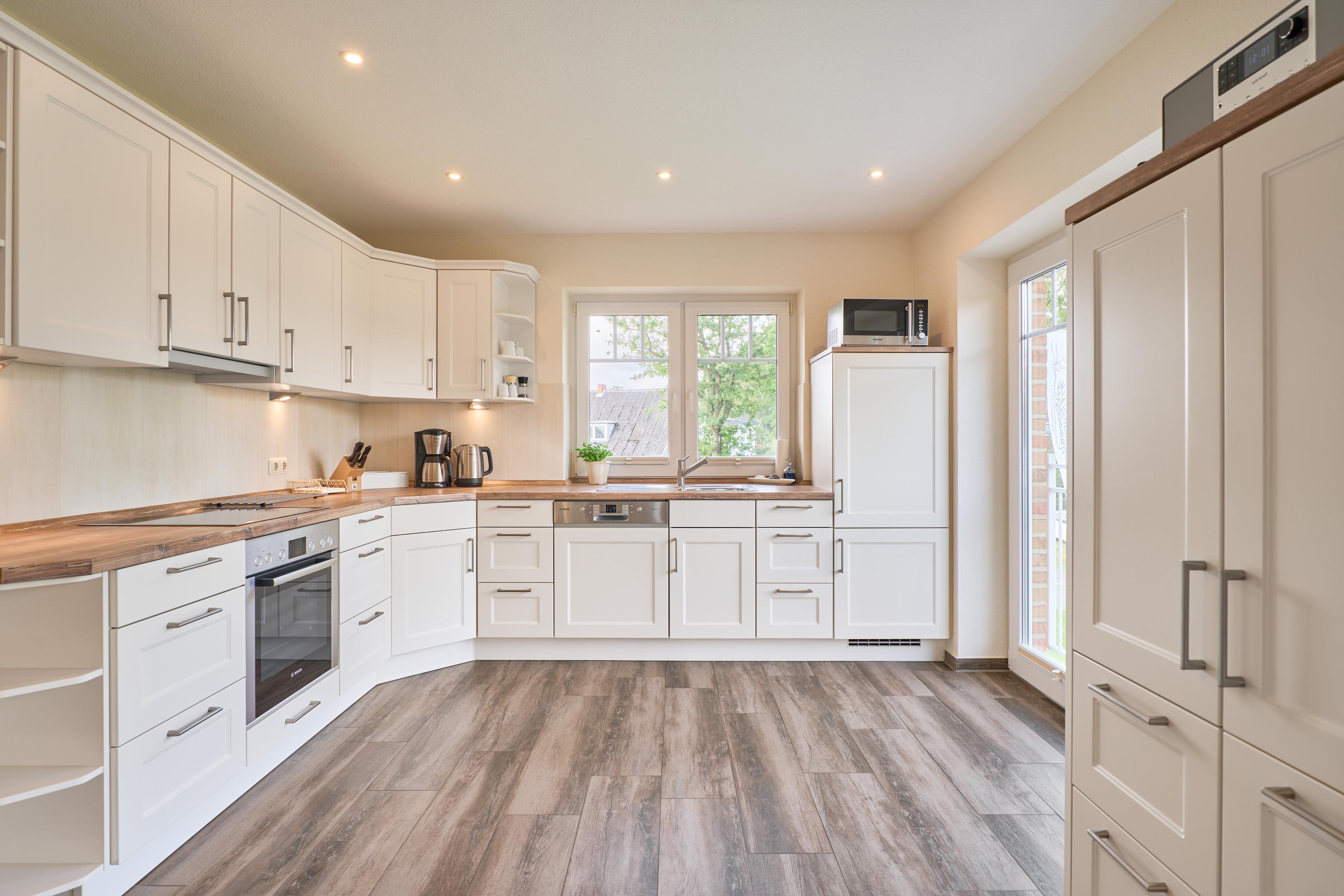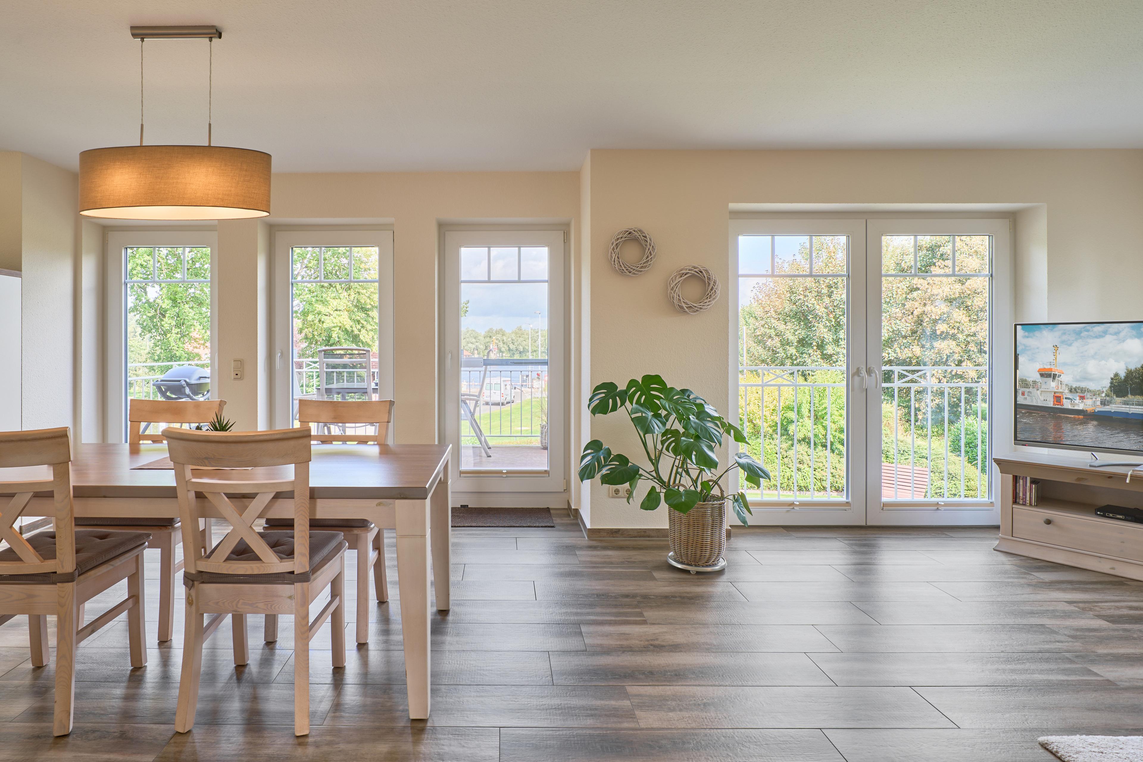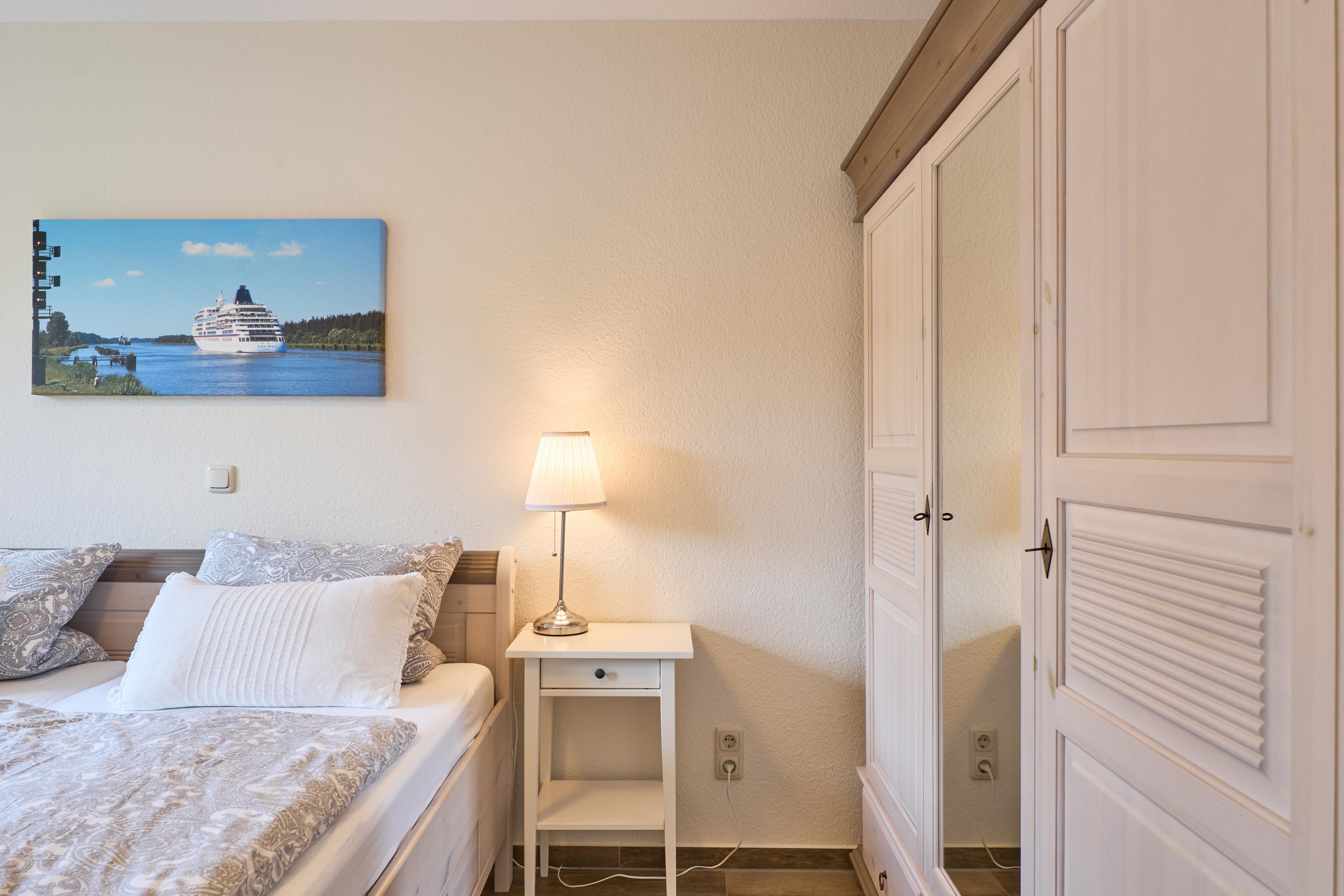 - Die Ferienwohnung befidet sich im ersten Stock, verzaubert mit großem Balkon mit hochwertigen Gartenmöbeln, Weber E- Grill und Sonnenschirm, von dem Sie die Sicht auf den NOK ungestört genießen können. Staunen Sie über die vorbeiziehenden Schiffe oder beobachten Sie das rege Treiben der NOK- Fähre. Zwei geräumige Schlafzimmer laden hier nach einem tollen Urlaubstag zum Träumen ein. Die Schlafzimmer (Doppelbett 180x200) mit TV haben zusätzlich zu den Plissees elektrische Rollläden, damit Sie auch im Sommer nicht auf einen erholsamen Schlaf verzichten müssen. Der Wohn- und Essbereich bietet mit seinen bodentiefen Fenstern einen herrlichen Blick auf den NOK, träumen Sie beim Kochen in der hochwertig ausgestatteten Küche von großen Pötten und der weiten Welt oder genießen Sie von der großen Wohnlandschaft das ständige pendeln der Fähre. Die Wohnung ist komplett hochwertig ausgestattet, neben dem 55 Zoll TV mit DVD Player und Sonoro Sound System finden Sie eine feine Auswahl an Lektüren und Spielen. Unsere kleinen Gäste liegen uns sehr am Herzen, für sie stellen wir Ihnen gerne unsere Kleinkindausstattung zur Verfügung.