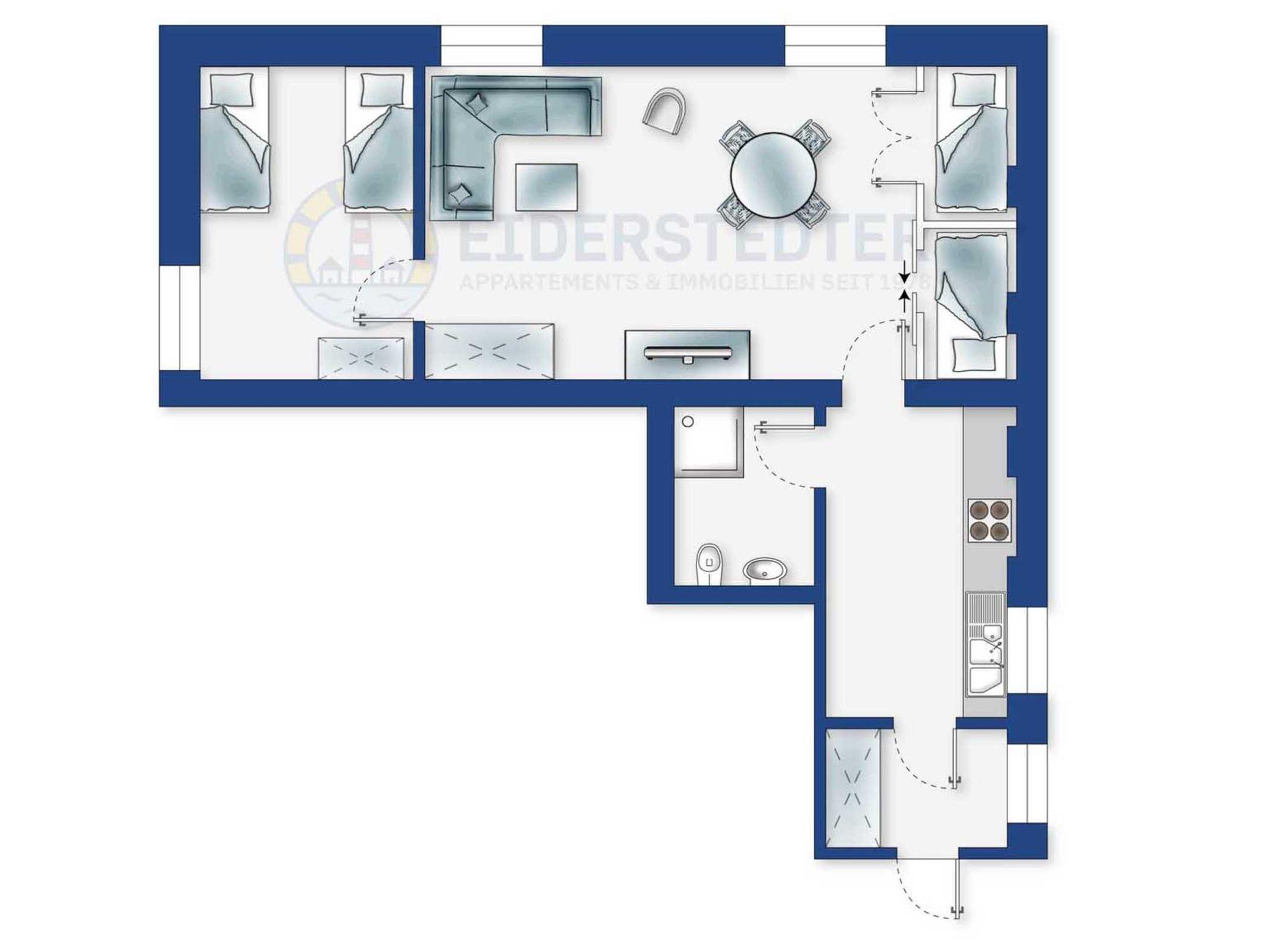 Wohn- / Schlafzimmer mit gemütlichem Ecksofa, Essplatz für 4 Personen, einem Flatscreen-TV (SAT), einer Stereo-Anlage mit CD-Spieler und zwei Alkoven-Einzelbetten (je 100x 200cm).