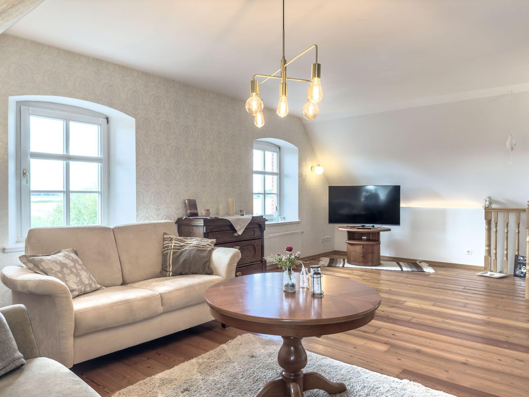 • Wohnbereich: Ein einladendes Wohnzimmer mit viel Tageslicht und Blick ins Grüne für entspannte Abende und gemeinsame Zeit.