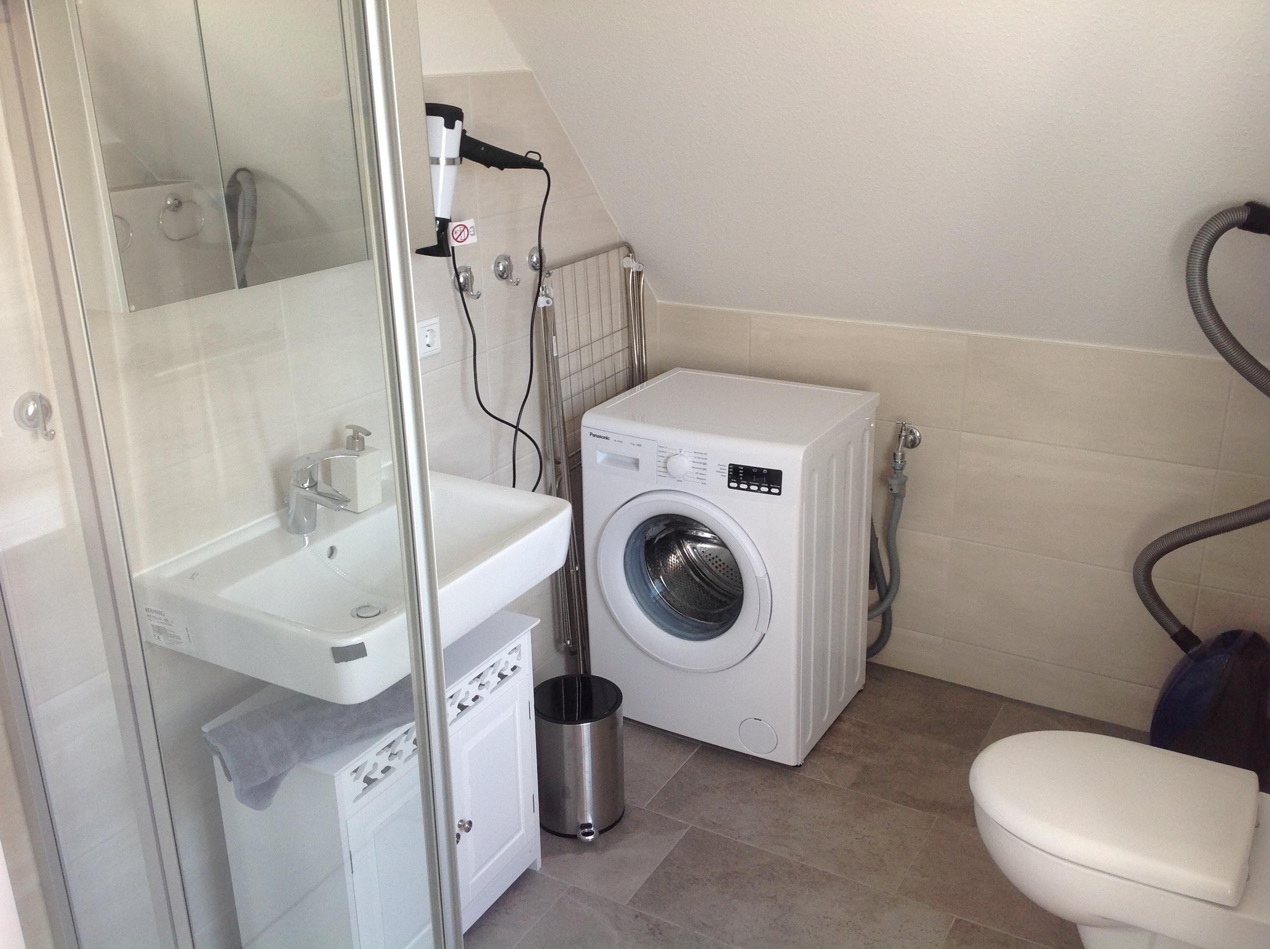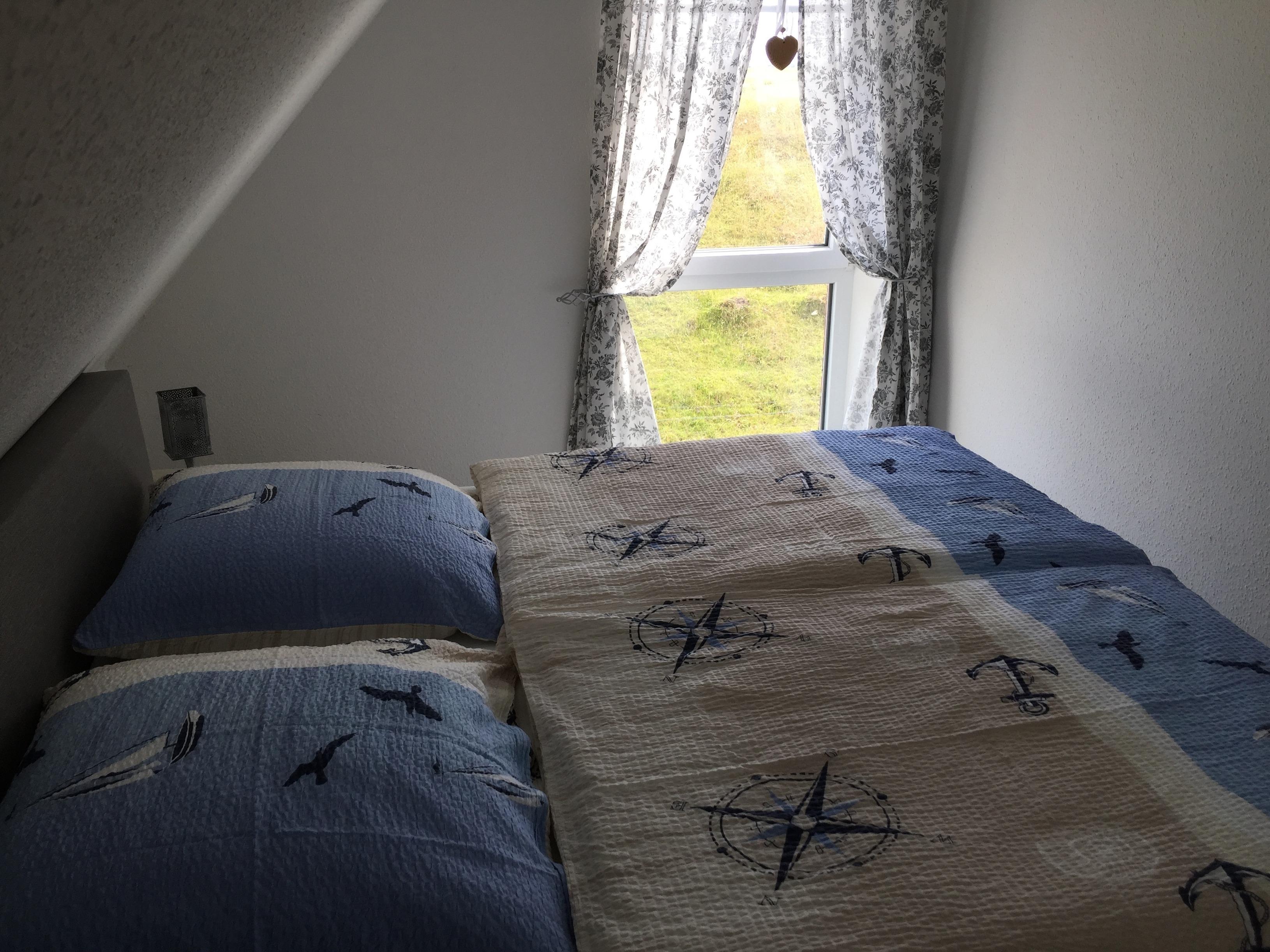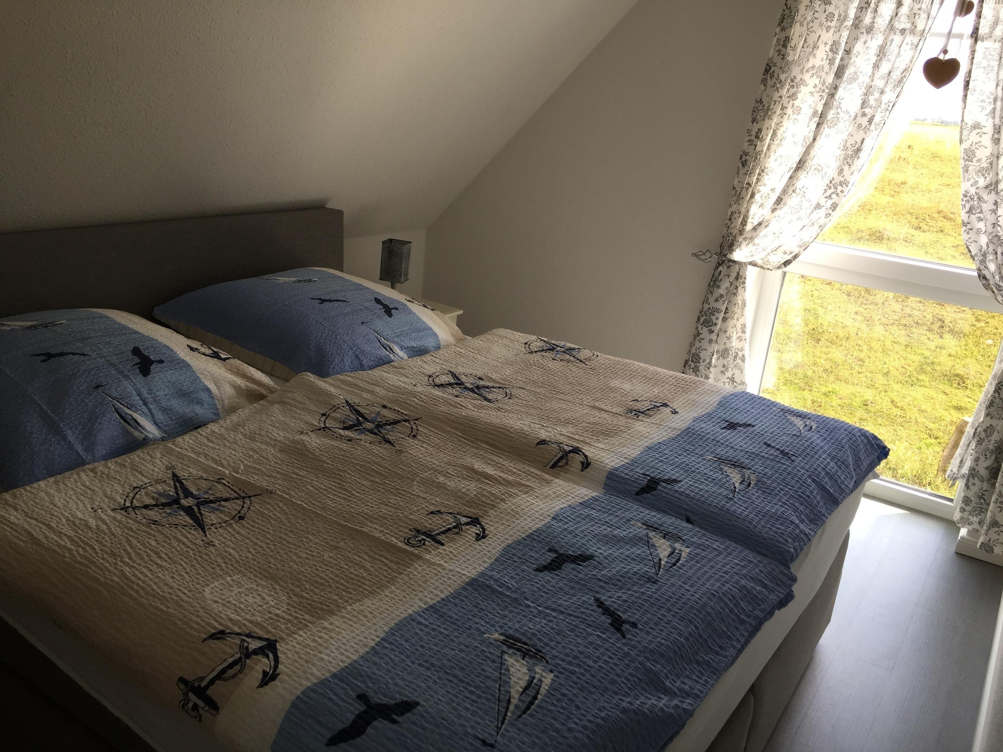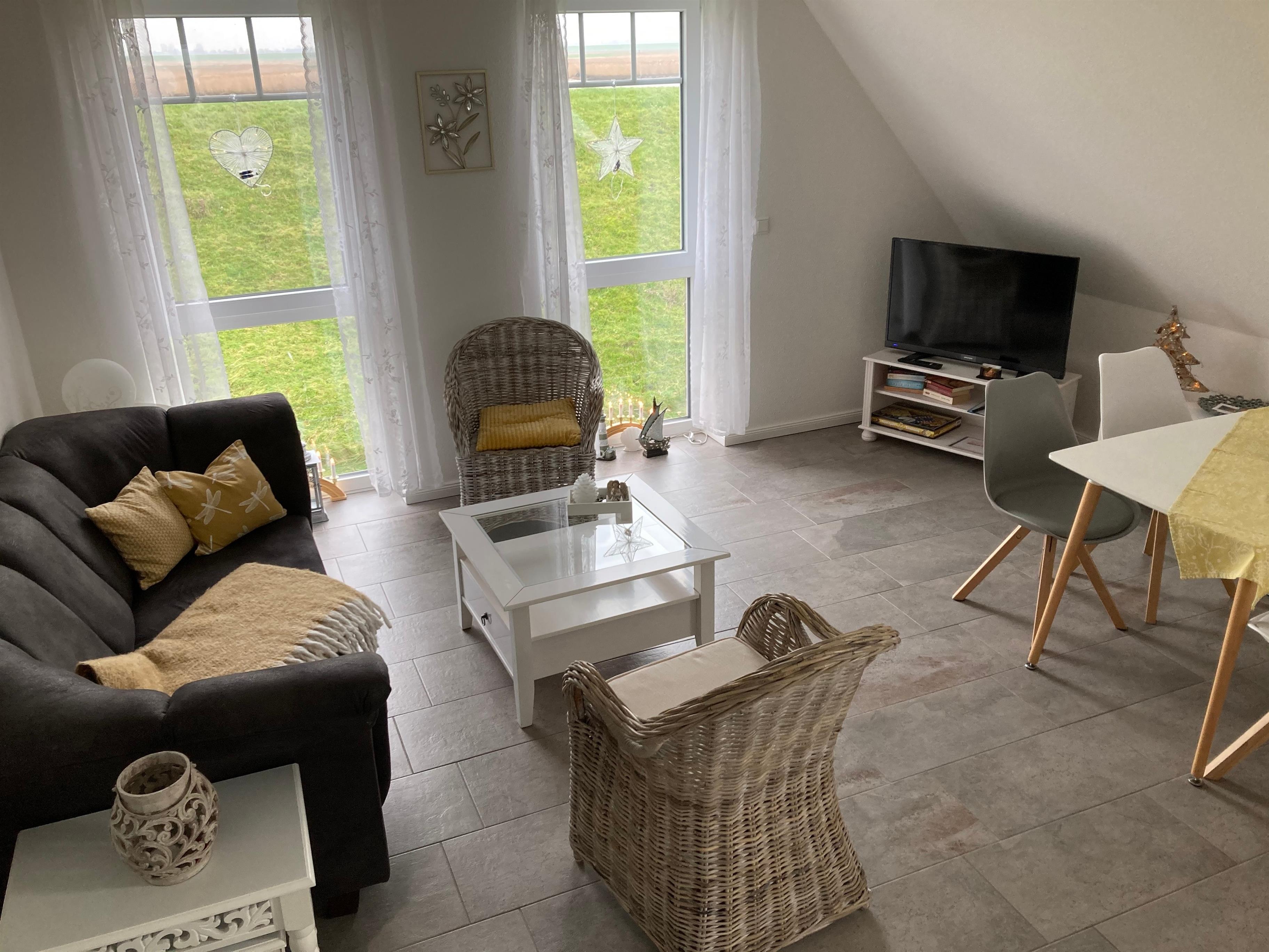 Die Ferienwohnung im OG hat top geschnittene 60 m², Wohnzimmer mit offener Küche, 2 Schlafzimmer, Bad mit Dusche, Fußbodenheizung.