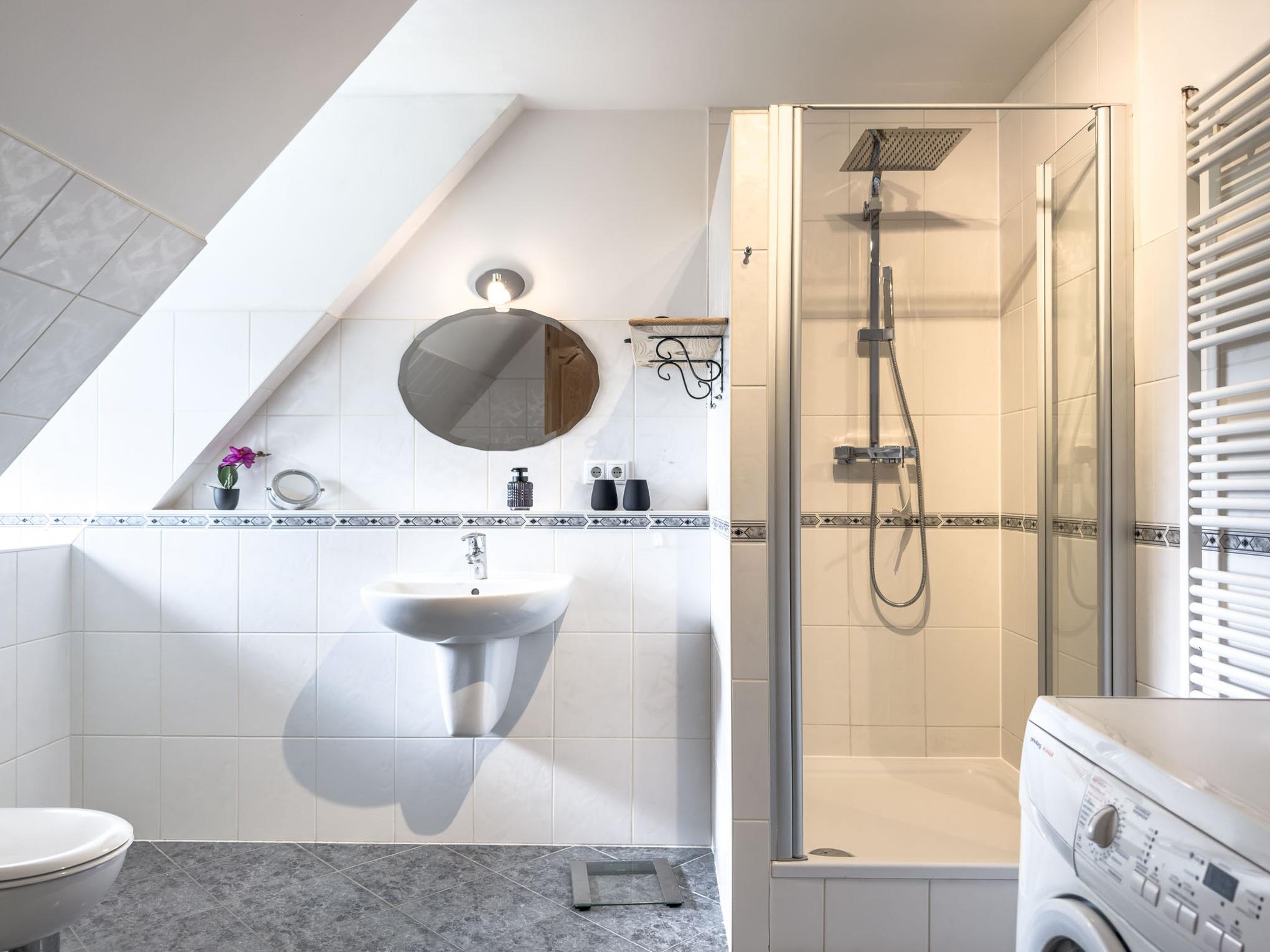 Modernes, großzügiges Duschbad, hell und funktional für einen entspannten Start in den Tag.