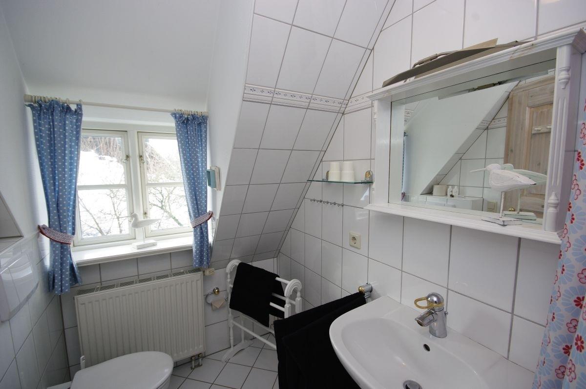 Das Gäste-Bad im Erdgeschoss besticht mit seinem maritimen Look und niedlichen Details, welche den Charme der Wohnung unterstreichen.