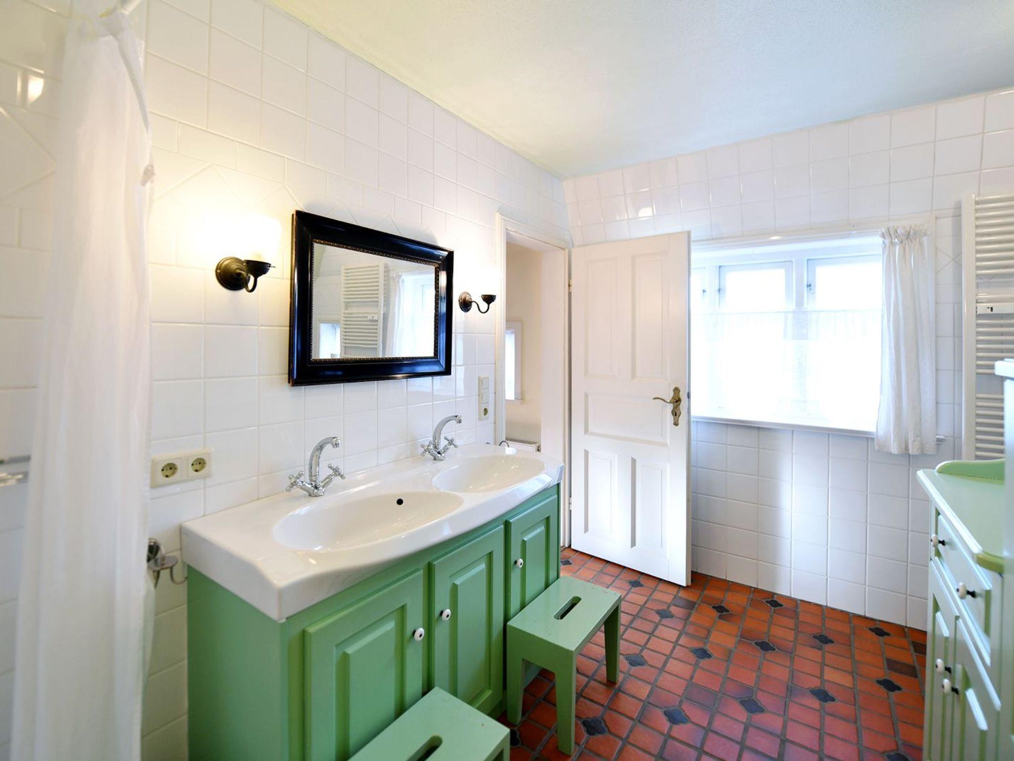 Das Bad verfügt über Badewanne, Dusche, Doppelwaschbecken und Toilette. Separat steht noch eine Gästetoilette zur Verfügung.