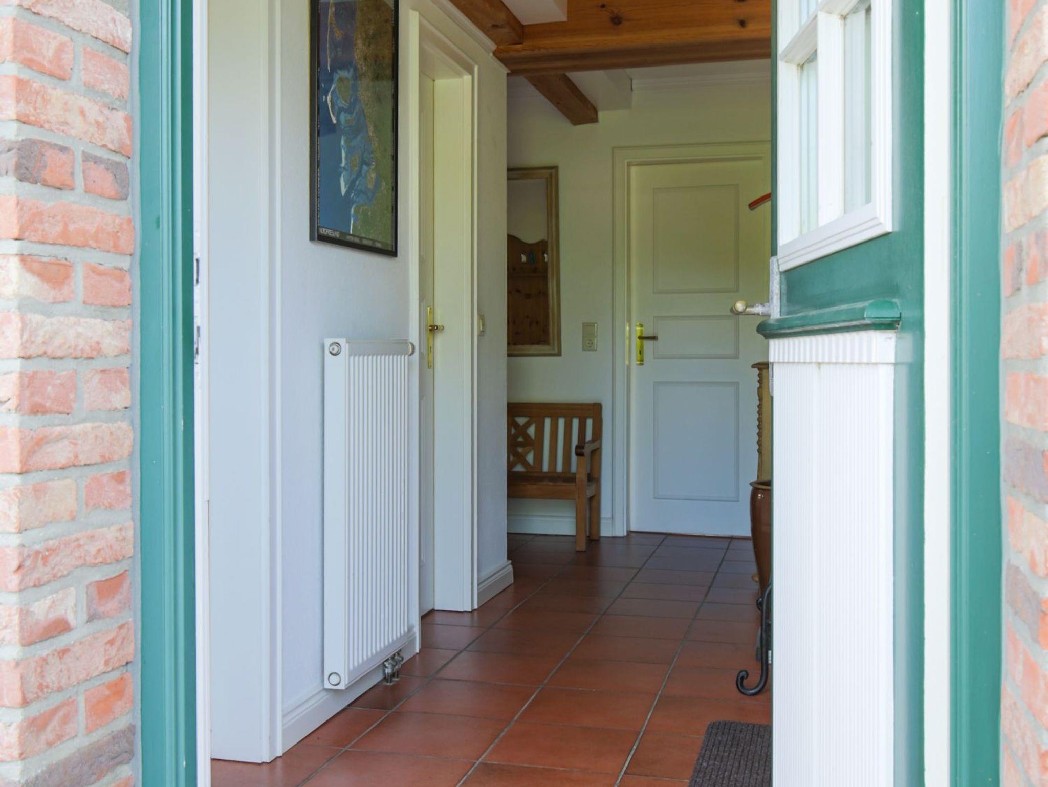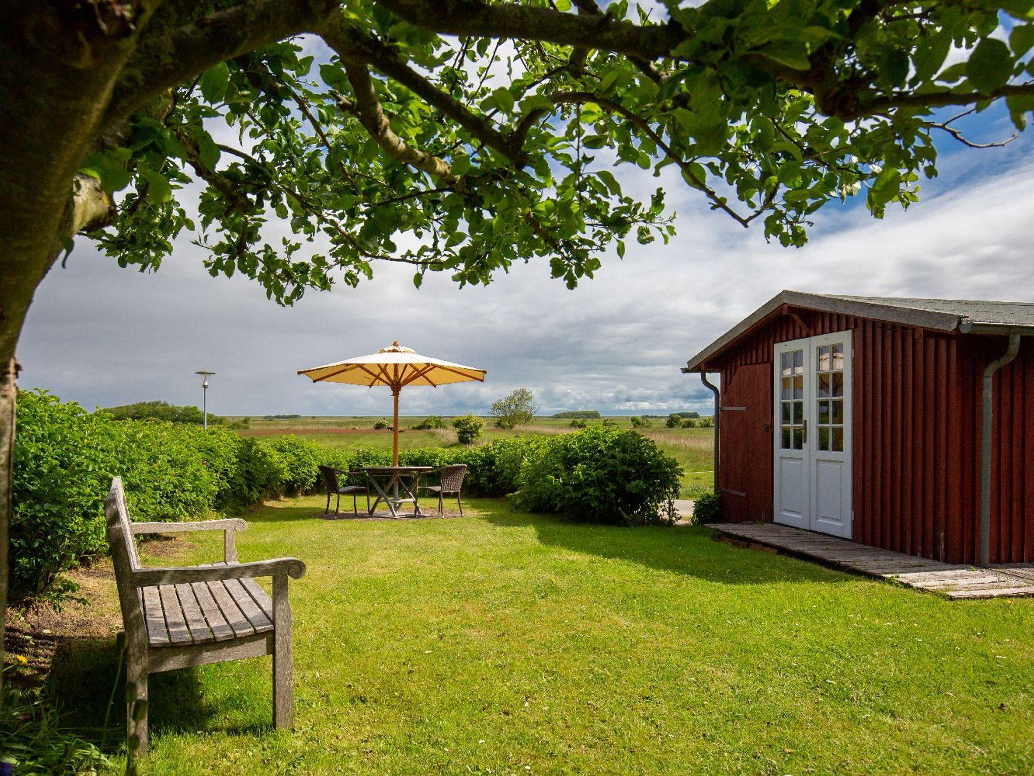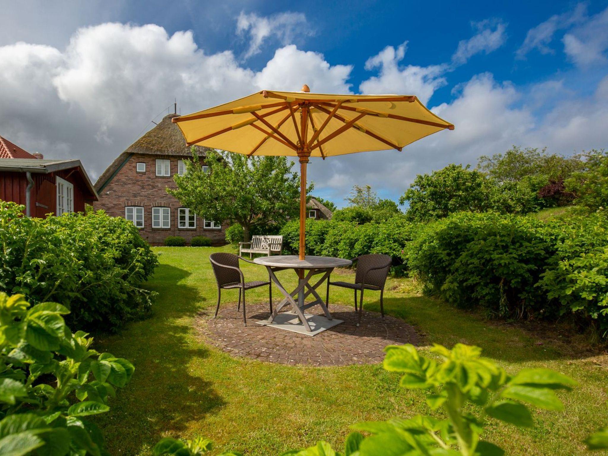 Der Garten ist umgeben von einem mit Heckenrosen bewachsenem Friesenwall und bietet freien Blick in die Marsch. Auf den bequemen Gartenmöbeln mit Polstern kann man es sich in der Sonne gemütlich machen