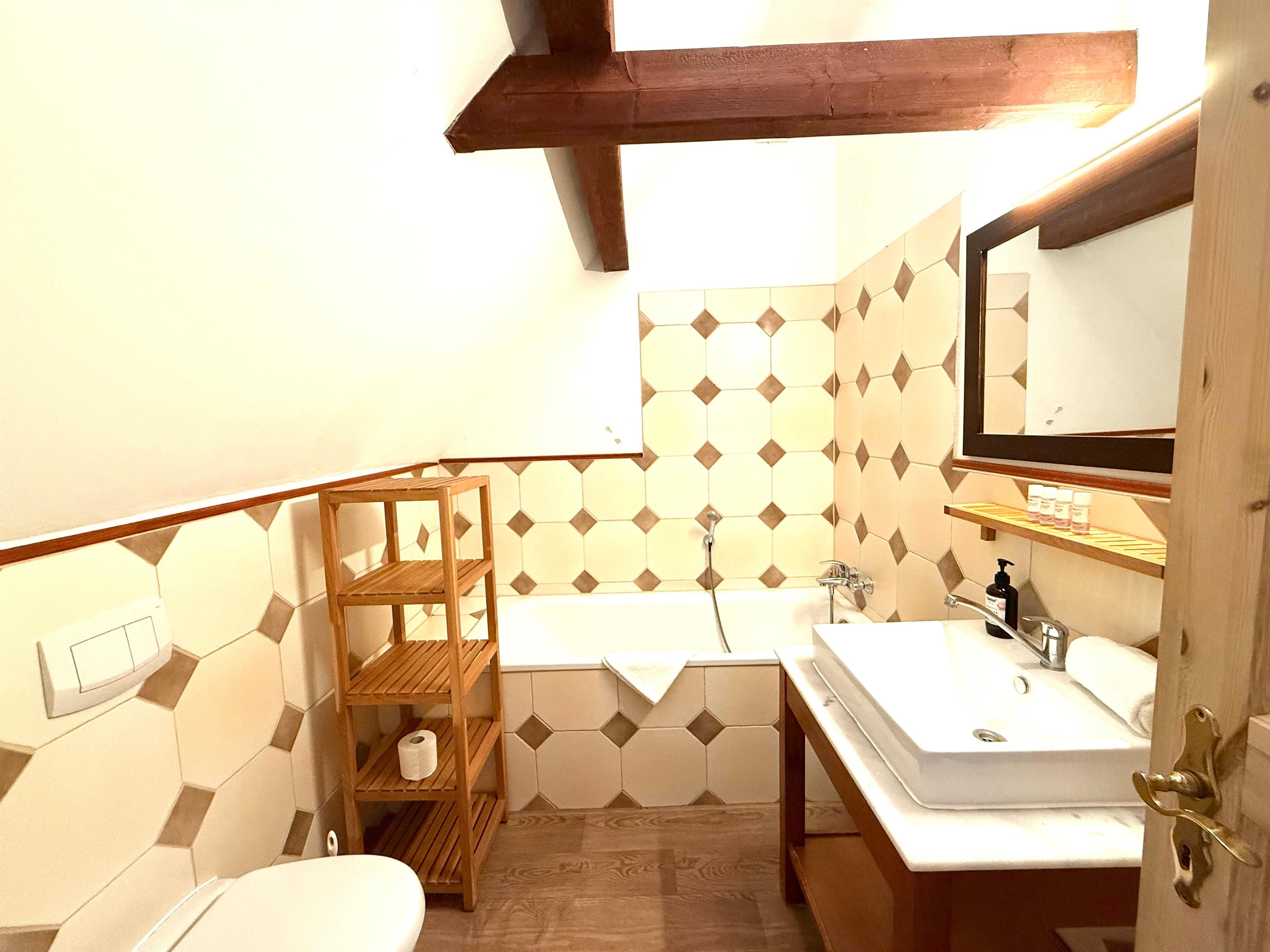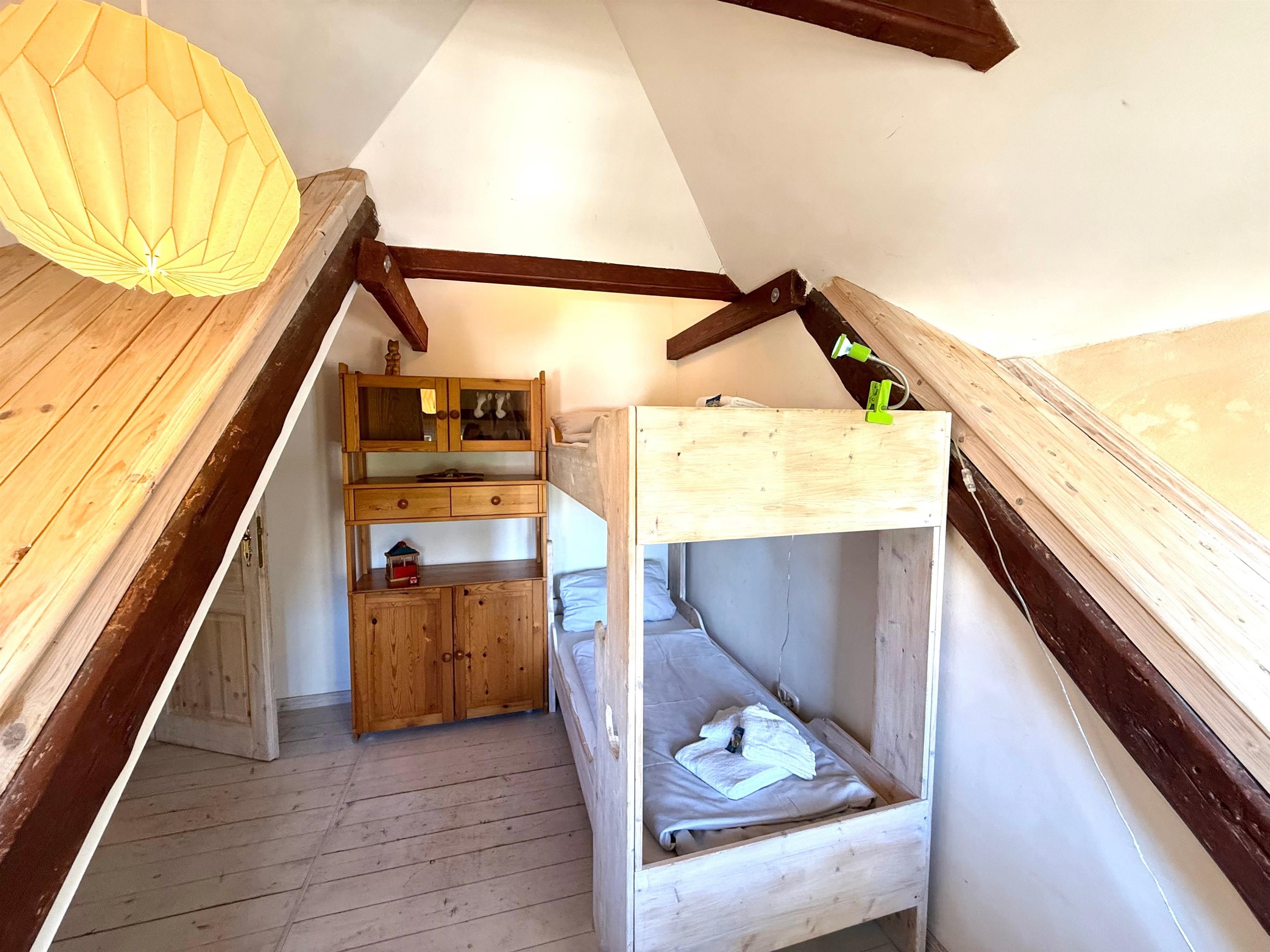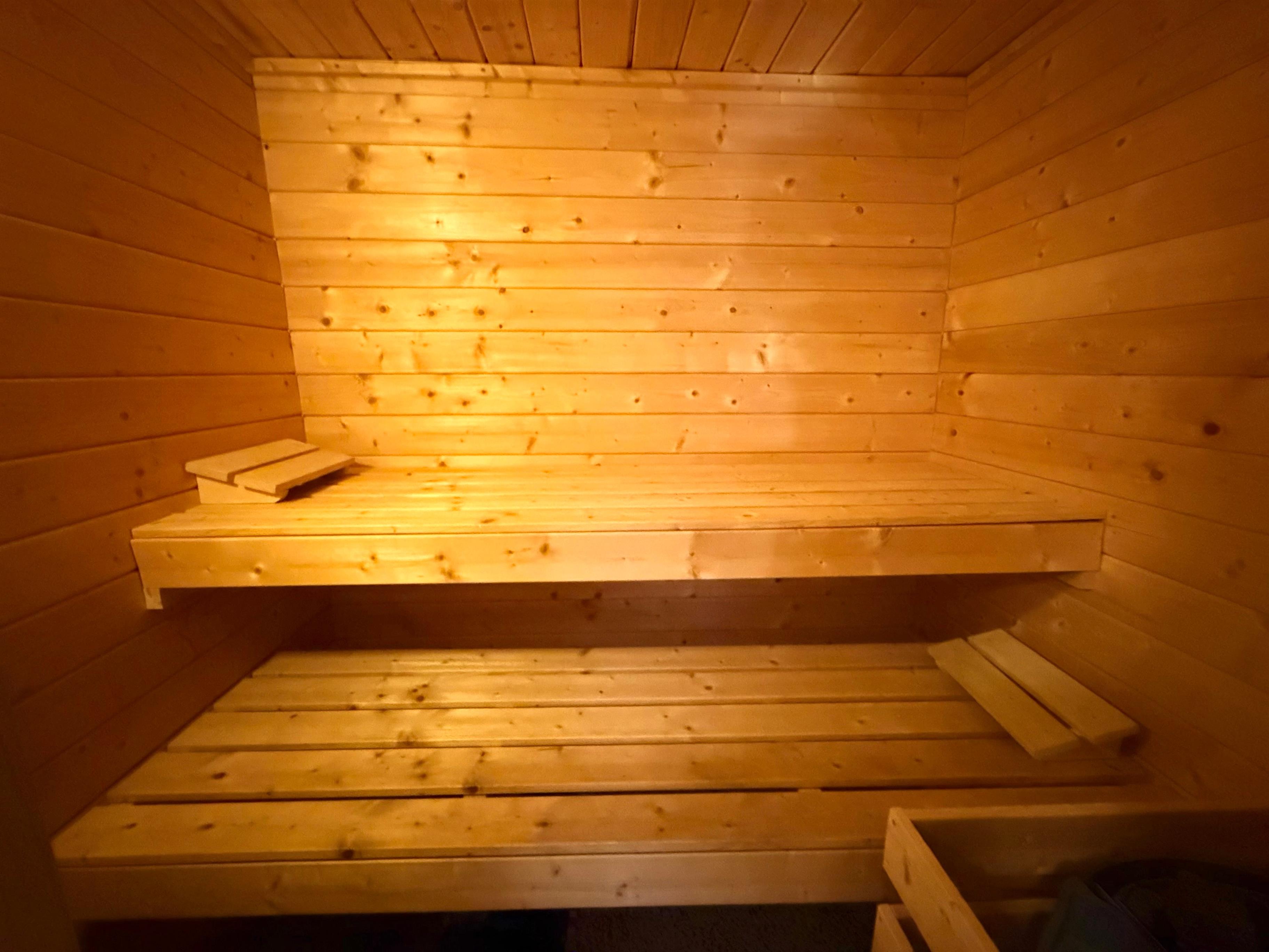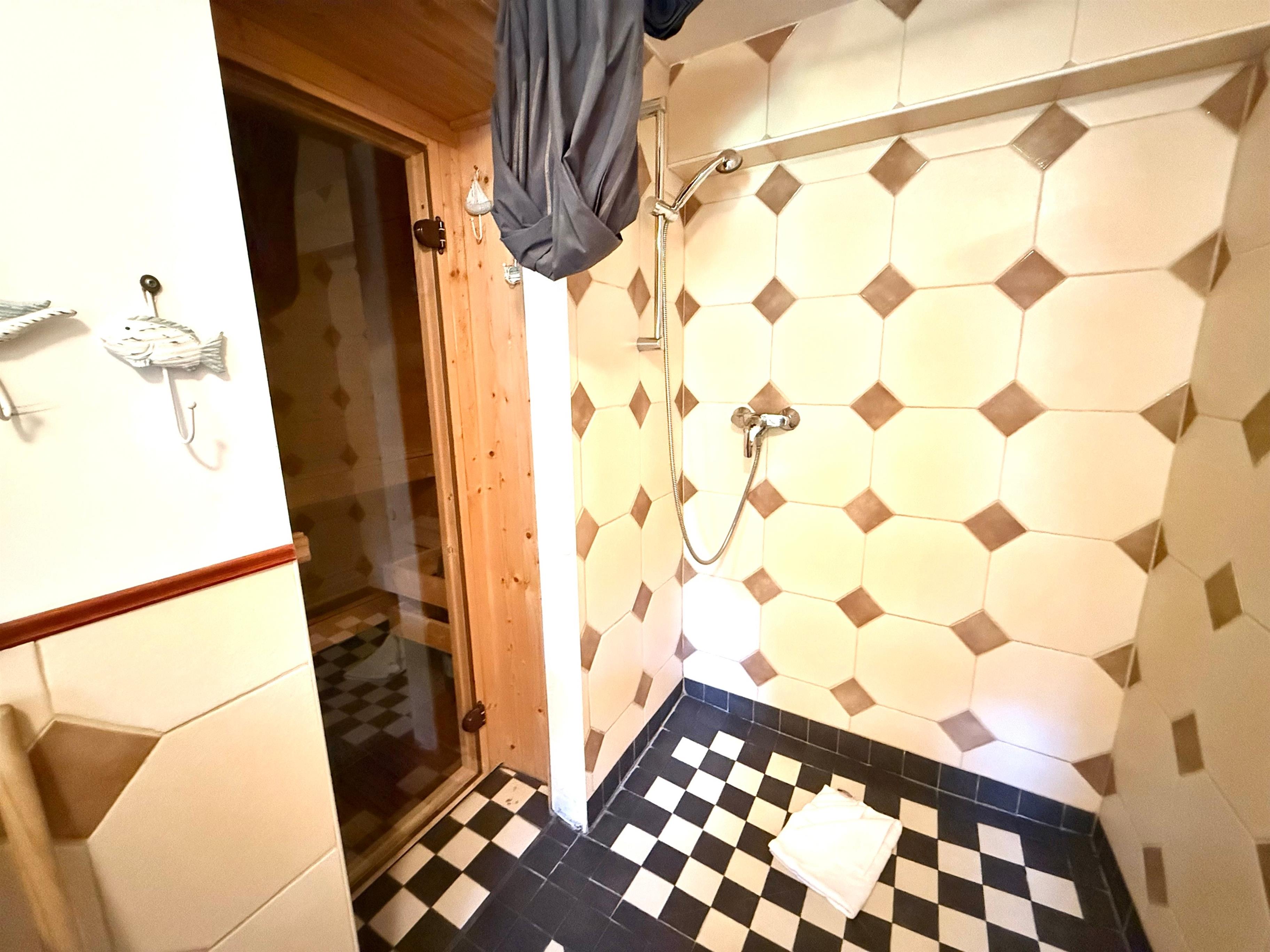 Diese Wohnung für 6 Personen und ist stilvoll und gemütlich eingerichtet. Im Wohnzimmer finden Sie einen Fernseher mit SAT-Anschluss, Musikanlage mit DVD und einen Kaminofen. Die Wohnküche hat noch den alten Fliesenboden und eine Einbauküche mit Spülmaschine. Ebenfalls im Erdgeschoss sind ein Schlafzimmer, ein Duschbad mit seniorengerechter, bodengleicher Dusche und angrenzender Sauna. Im Dachgeschoss sind das Elternschlafzimmer, ein Kinderzimmer mit Etagenbett und ein Wannenbad.