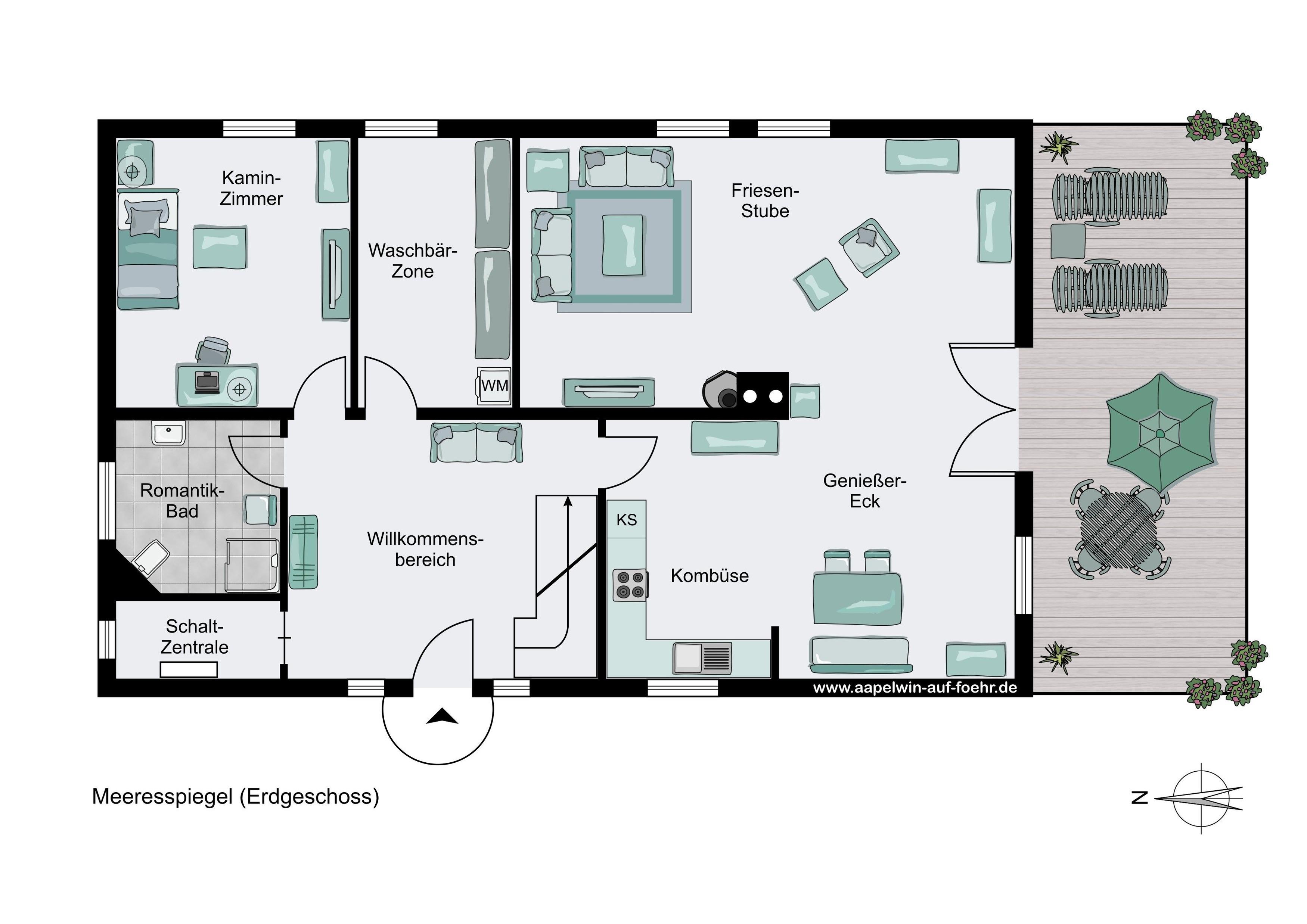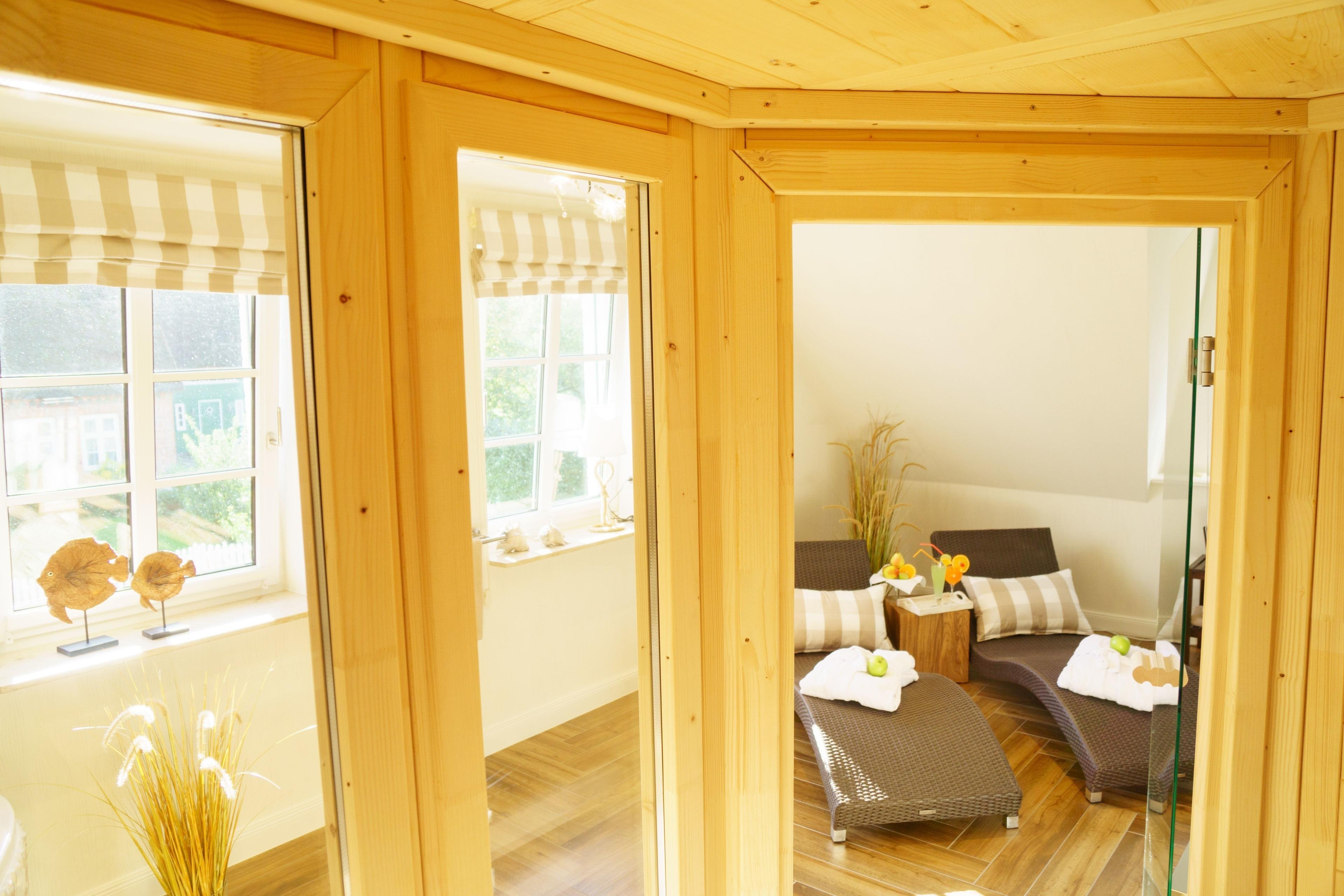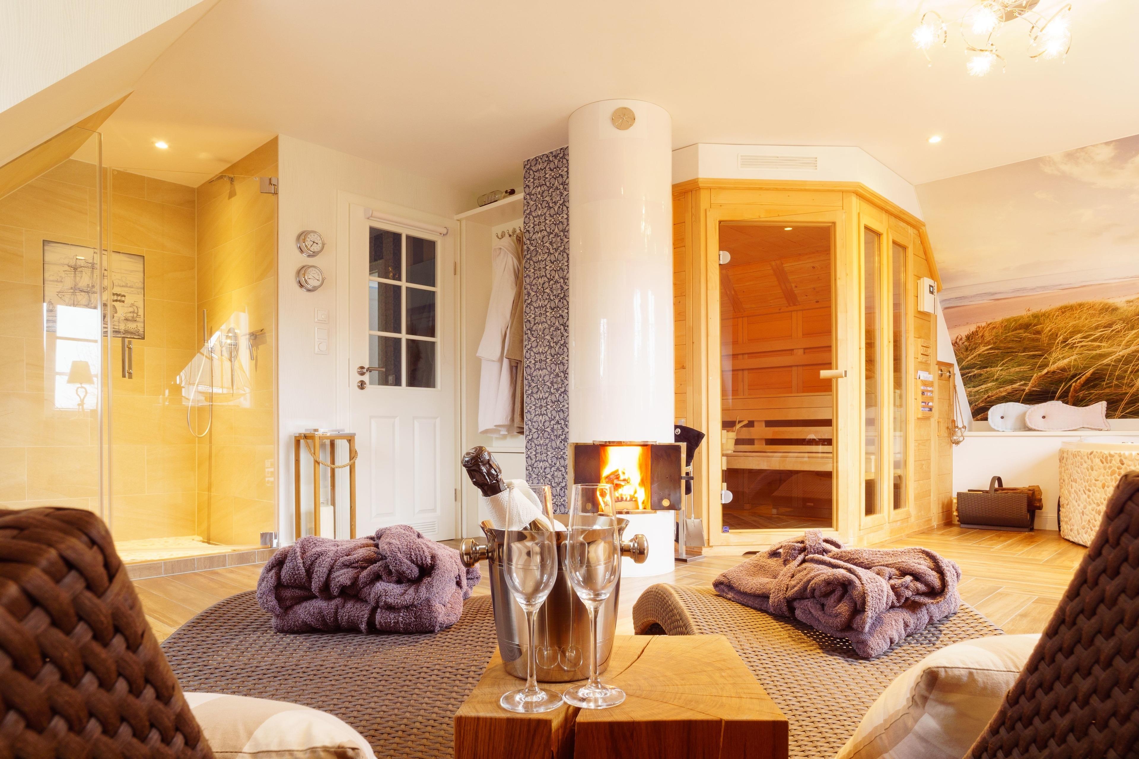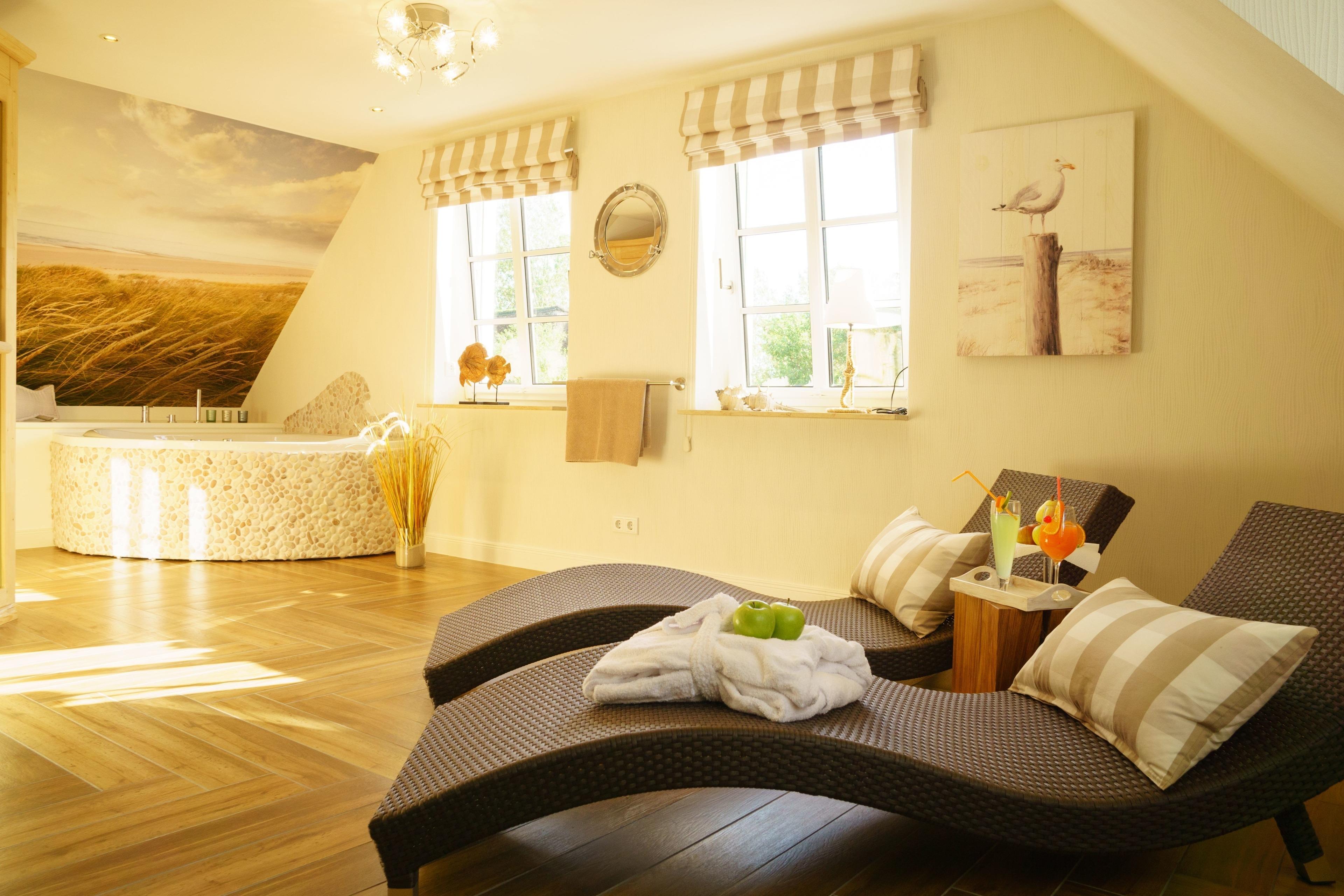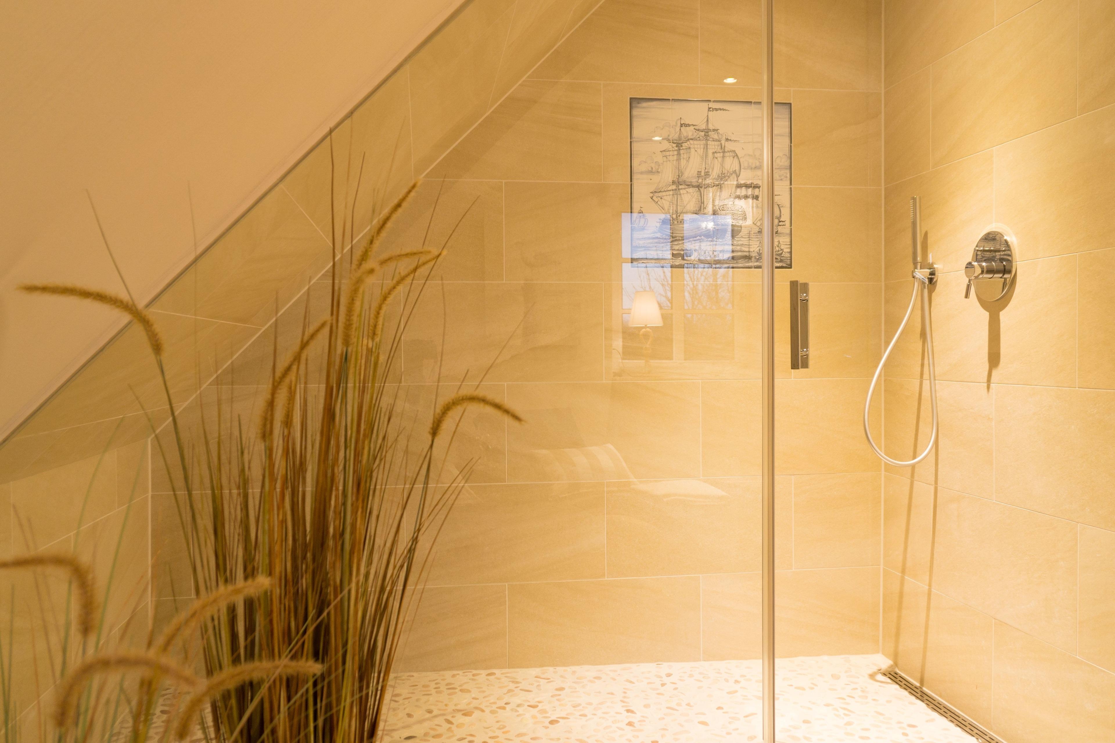 Das zauberhafte 5-Sterne-Haus "Aapelwin auf Föhr" besticht durch seine Großzügigkeit und den außergewöhnlichen Komfort sowohl im Innen-, als auch im Außenbereich. Auf seinen über 153 m² können bis zu drei Erwachsene pure Erholung, Entschleunigung und Entspannung finden. Die drei Mylin-Kachelöfen sind mit Recht als Highlight hervorzuheben. Diese sorgen sowohl im offenen Wohn-/ Essbereich des Erdgeschosses, als auch im Wellnesszimmer im OG, sowie im Hauptschlafzimmer für eine wohlige Atmosphäre. Je Stockwerk befinden sich im "Aapelwin auf Föhr" ein Duschbad und ein Schlafzimmer. Das beachtliche Tageslicht-Wellnesszimmer verfügt neben einer Sauna und einer sehr komfortablen Dusche mit Schwallbrause auch noch über einen Whirlpool.