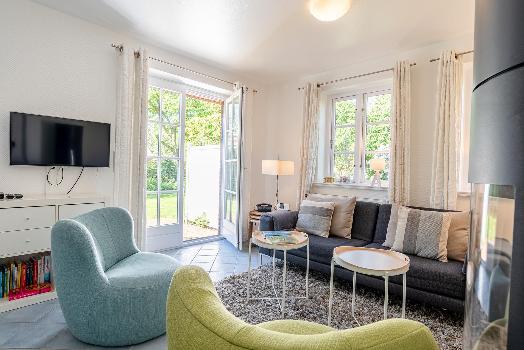 Gemütliche Doppelhaushälfte in Oldsum mit Terrasse, Garten und dänischem Kaminofen für entspannte Ferien.