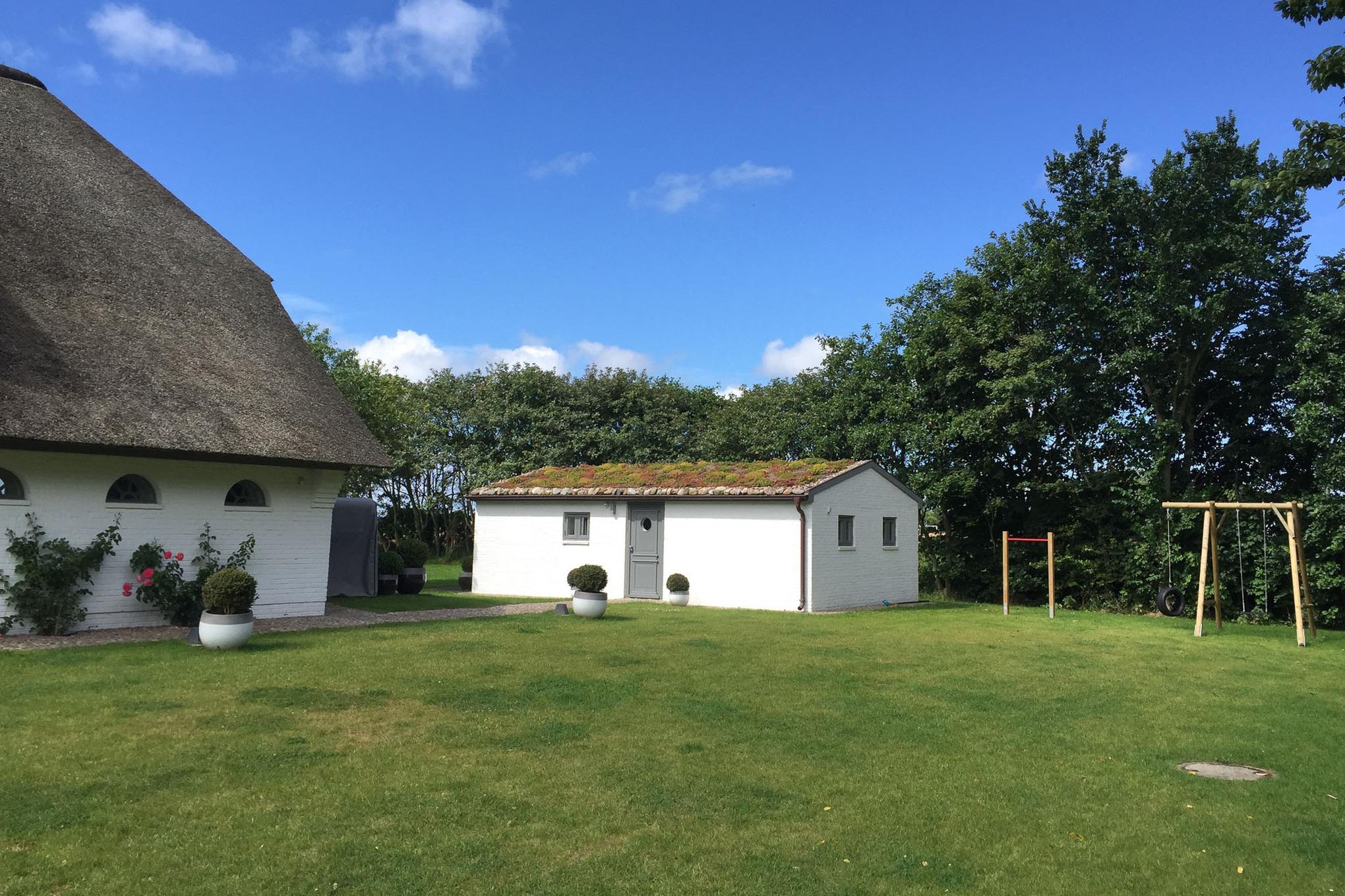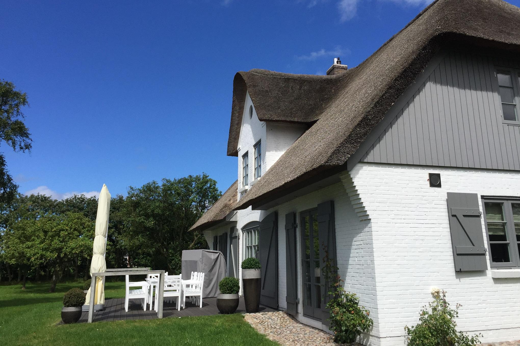 Mit viel Liebe zum Detail und in höchster Qualität ausgestattet, finden Sie in diesem Reetdachhaus Ruhe, Entspannung und Weitblick. Mitten in der Natur, umgeben von ländlichem Ambiente. Urlaub wie im eigenen Zuhause genießen - nach dieser Philosophie haben die Besitzer das Landhaus BO konzipiert und besonders anspruchsvoll ausgestattet. Ein charmantes Grundstück mit alten Obstbäumen und drei großzügigen Terrassenflächen laden zum Verweilen im Garten ein. In der kälteren Jahreszeit bieten die Sauna im separaten Sauna- und Gästehaus sowie ein Kamin im Haupthaus eine perfekte Gelegenheit für erholsame und gemütliche Stunden. Eine große und helle Bulthaup-Küche mit allen technischen Geräten lädt zum Kochen ein. Esszimmer und Wohnbereich gehen ineinander über und lassen den Blick zu auf die großen Terrassenflächen nach Süden und Westen. Die perfekten Voraussetzungen für einen fantastischen Urlaub im kleinen oder großen Kreis, denn dieses Haus bietet sogar Platz für zwei Familien. Der idyllische Ort Oldsum verfügt über einen eigenen kleinen Supermarkt und Bäcker und ist über die Grenzen Föhrs für seine Schönheit bekannt. Die Fähre sowie die weitläufigen Strände in Utersum, Nieblum und den Südstrand in Wyk erreichen Sie in nur 10 Minuten mit dem Auto