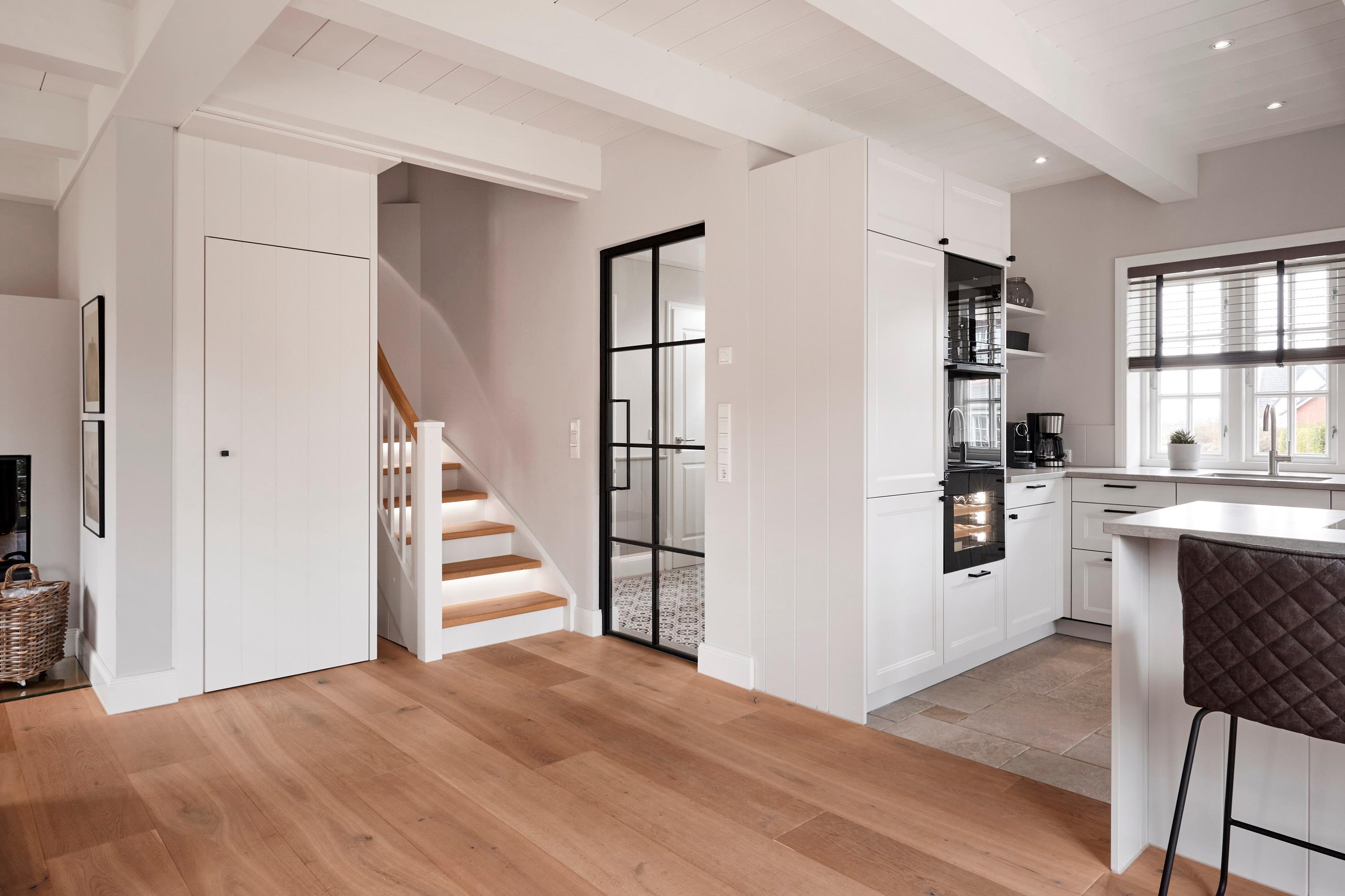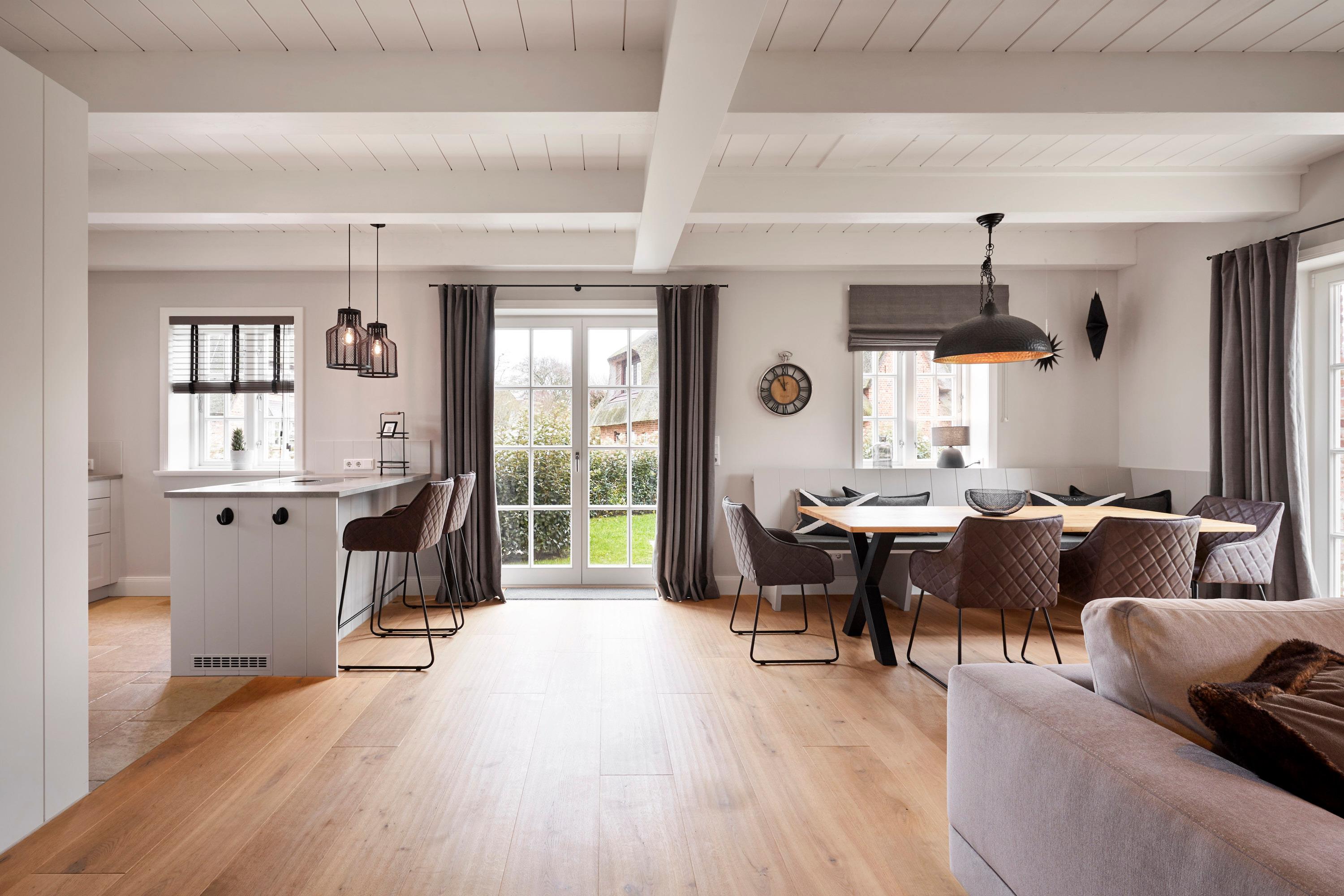 In der modernen und gemütlichen Doppelhaushälfte unter Reet erwartet Sie der Wohn- und Essbereich mit offener Küche, ein Gäste-WC sowie ein Hauswirtschaftsraum. Vom Wohnbereich aus gelangen Sie direkt auf die eigene Terrasse und in den Garten.