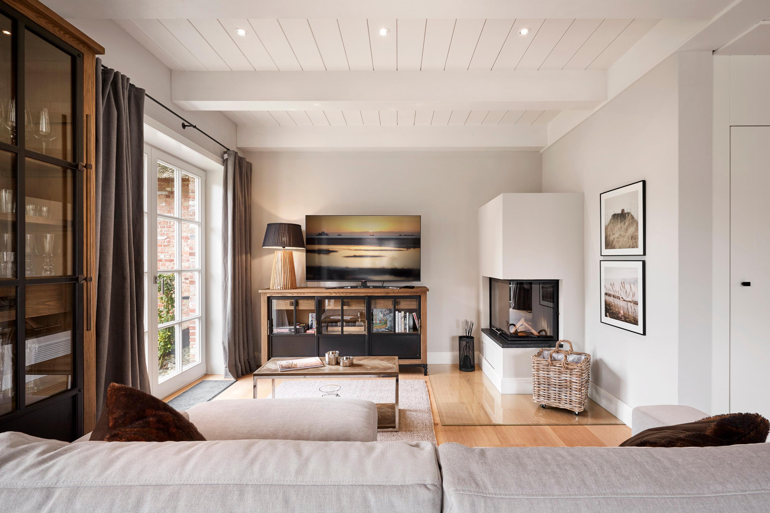 Ein Glaskamin sorgt im Wohnbereich auch an kühleren Tagen für eine gemütliche Atmosphäre. Die beiden Schlafräume befinden sich - neben dem Duschbad - im Obergeschoss des Hauses.