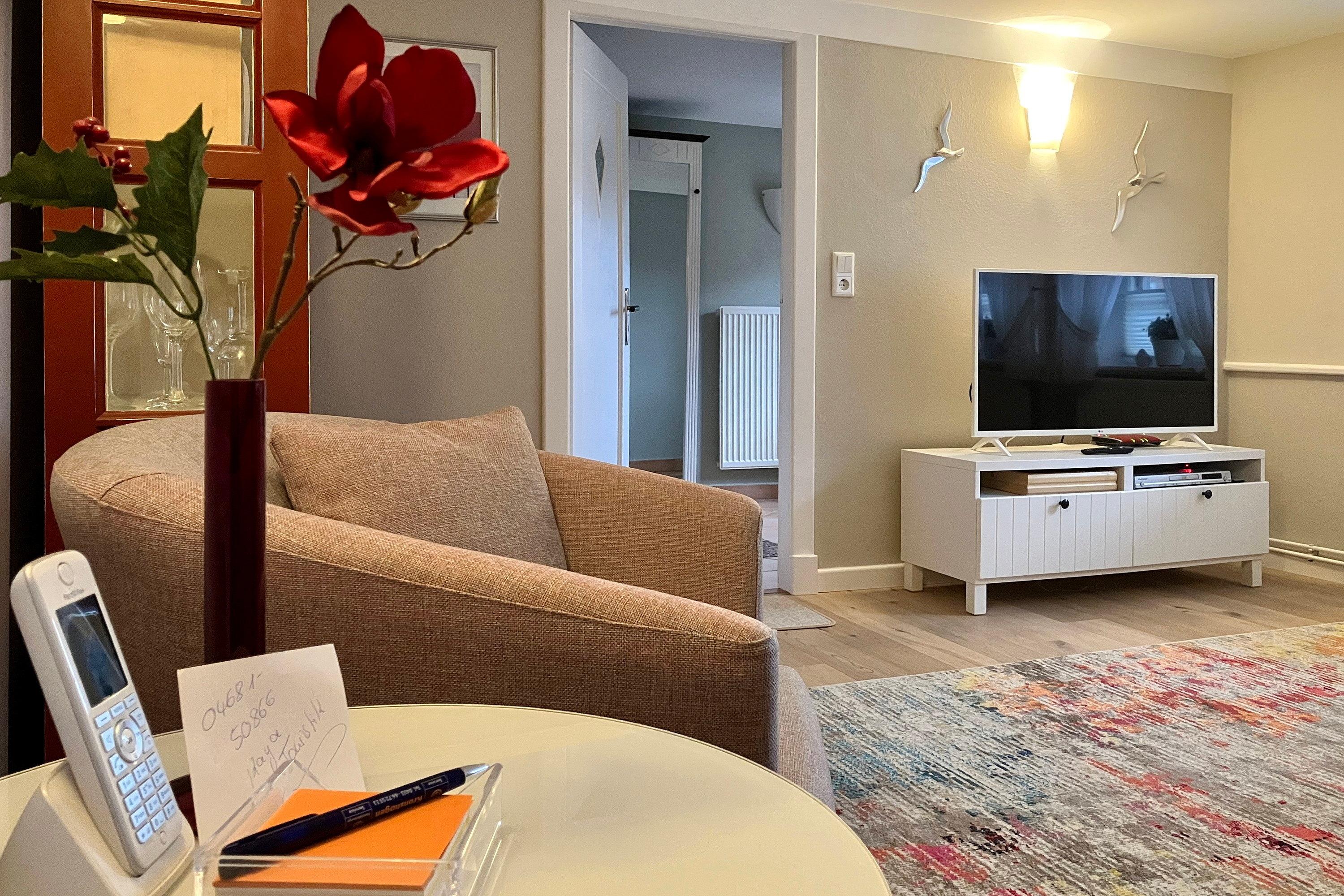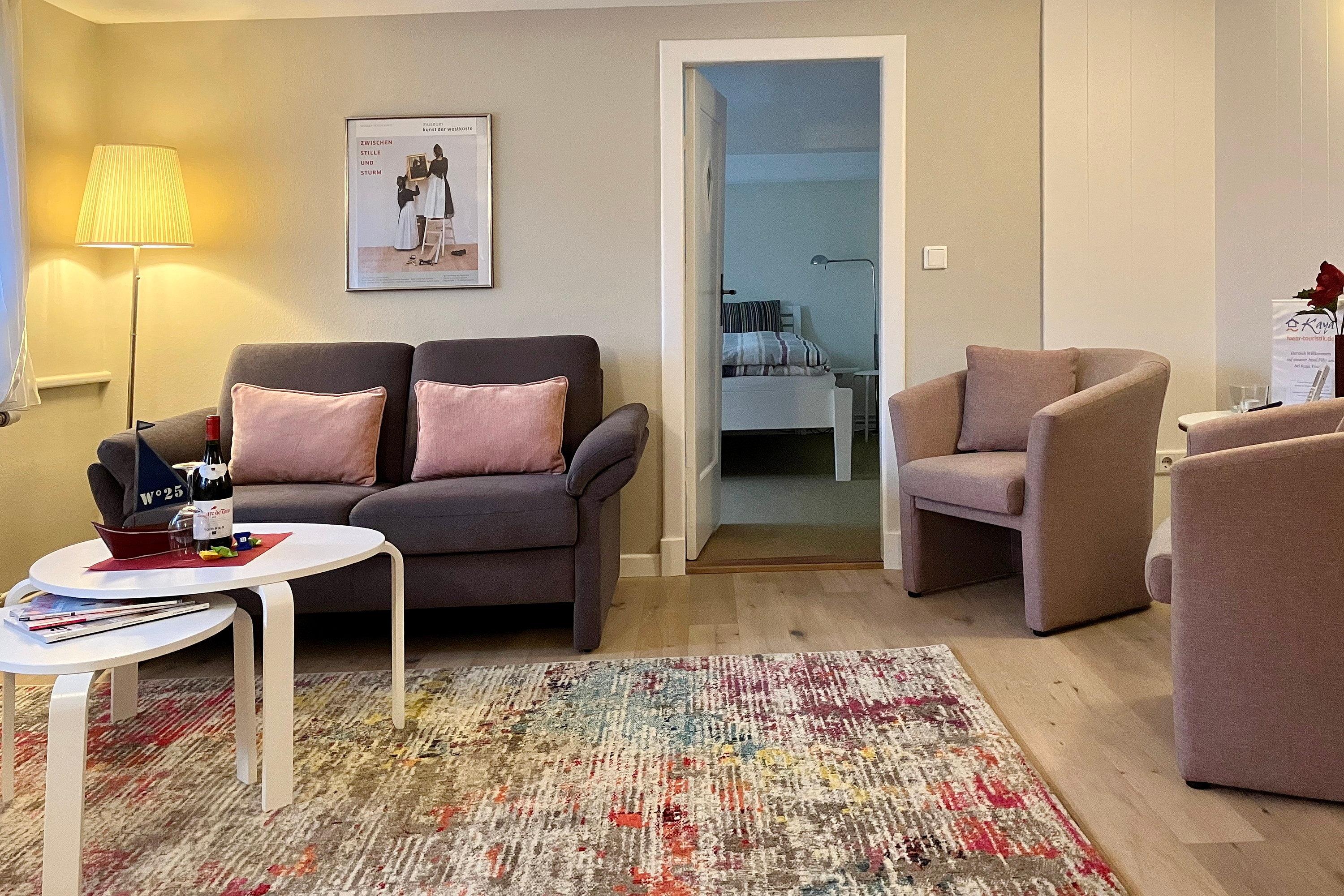 Das Haus 25 ist eine ebenerdige Unterkunft bestehend aus einer Küche, einem Wohnzimmer, zwei Schlafzimmern und einem Bad mit einem separaten WC und einer großen Diele. Die Küche ist voll ausgestattet und vom Essplatz haben Sie einen schönen Blick in den Garten. Relaxen Sie im urigen Wohnzimmer, dass zum Verweilen und Entspannen einlädt mit WLAN, Stereoanlage, Fernseher und DVD-Player oder genießen Sie einen Föhrer Tee zusammen mit einem guten Buch. Zwei Schlafzimmer versprechen ruhige Nächte. Eines davon verfügt über ein Doppelbett, das andere über zwei Einzelbetten. Das Duschbad ist funktional. Angenehm ist das separat liegende WC. Ein besonderes Highlight im Sommer ist der schön angelegte Garten mit Gartenhäuschen, Holzterrasse und Gartenmöbeln (ca. von April bis Ende September) und Kinder können sich über ein Schaukelgerüst freuen. Erleben Sie die Insel von der ruhigen Seite und die friesische Mentalität in einem echt friesischen Dorf, wobei Supermarkt, Gaststätte, Cafés und auch die Bushaltestelle in Fußnähe erreichbar sind...
