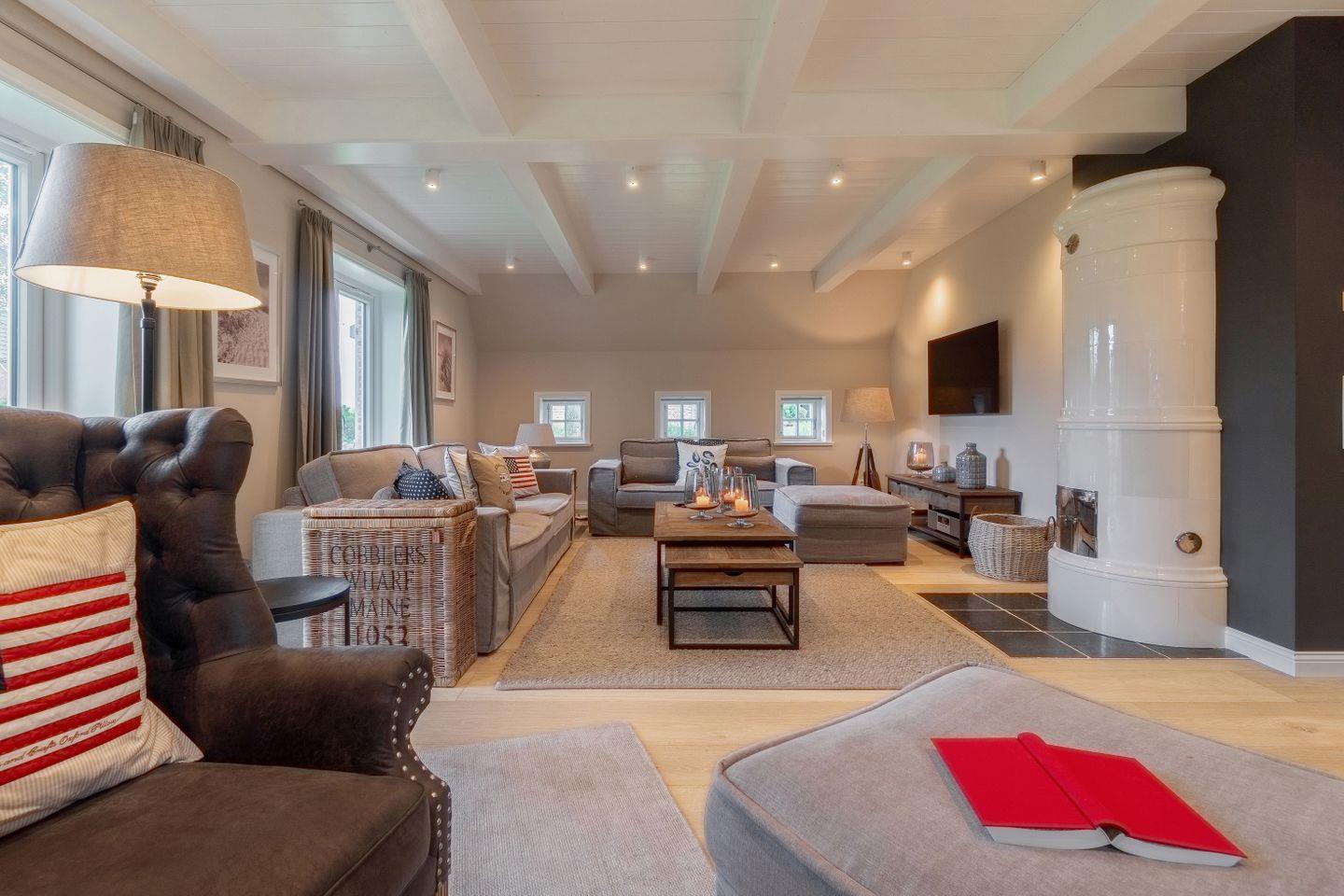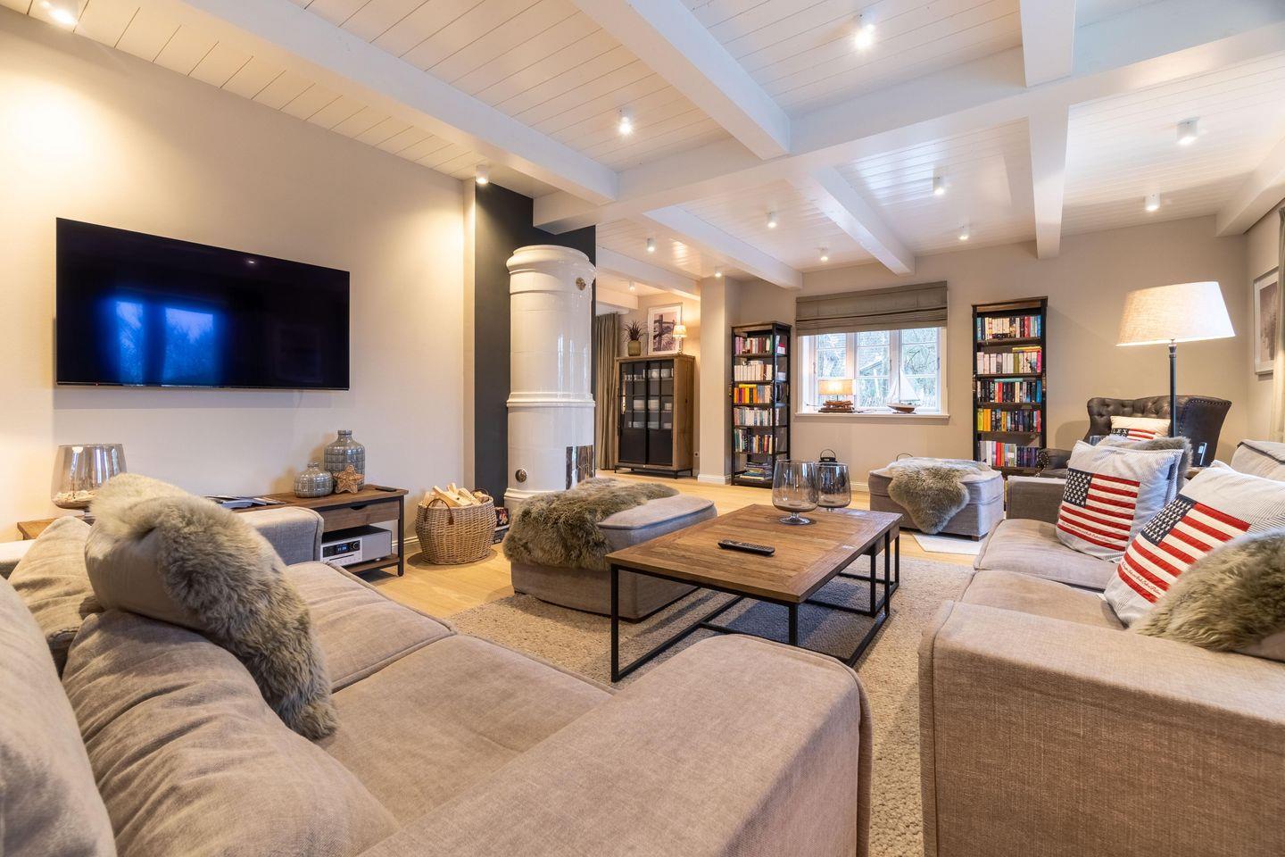 Zu den Highlights des exklusiv ausgestatteten Ferienhauses unter Reet zählen wir u. a. die hauseigene Sauna mit Ruheraum, den Original Mylin-Kachelofen sowie die exzellent ausgestattete Küche.