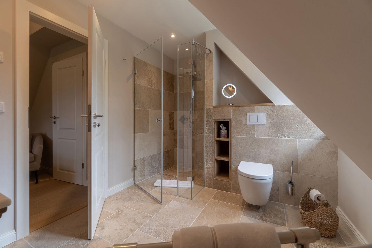 Im Erdgeschoss befinden sich der großzügige Wohn- und Essbereich mit offener Küche, eines der drei Schlafzimmer, ein Bad mit bodengleicher Dusche und ein Hauswirtschaftsraum. Der offene Wohn-, Ess- und Küchenbereich bildet das Herzstück des Hauses. Der Original Mylin-Kachelofen sorgt auch an kühleren Tagen für eine wohlige Atmosphäre - und an warmen Tagen ist er ein echter Hingucker! Die Küchenausstattung ist besonders vielfältig und gut. Neben der Kitchenaid mit reichlich Zubehör, einer Nespresso-Kaffeemaschine und Milchaufschäumer zählen wir den englischen Falcon Herd mit verschiedenen Ofen- und Backfunktionen sowie mit Induktionskochfeldern zu den Highlights des Ferienhauses Eva-Marie. Über den Essbereich gelangen Sie auf die Terrasse und in den Garten.
