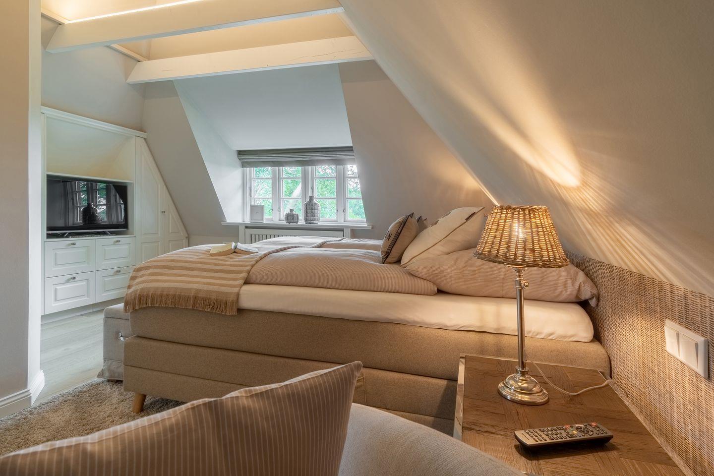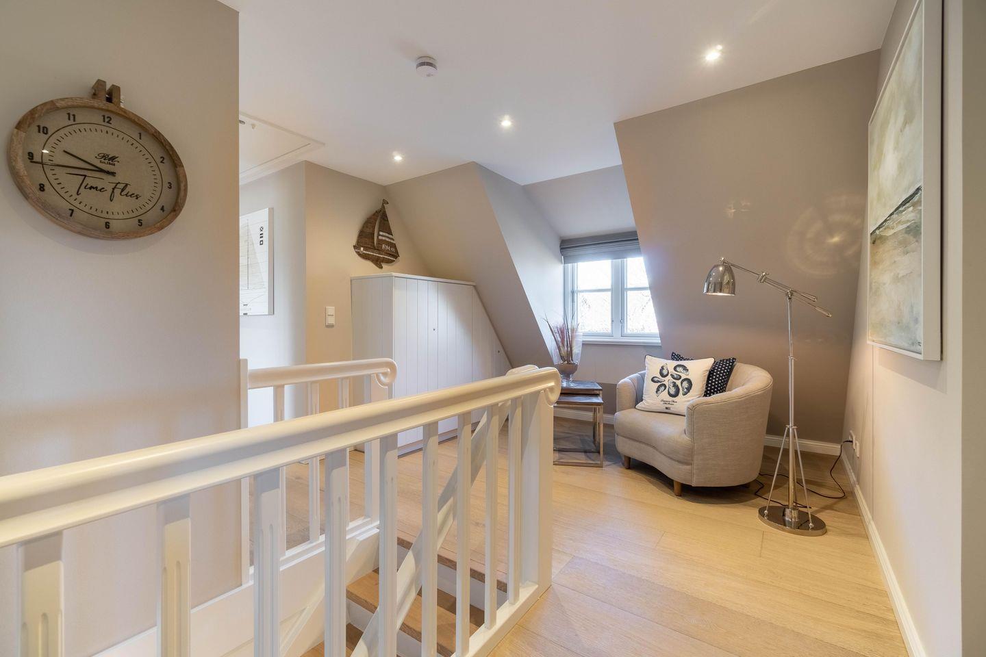 Im Obergeschoss befinden sich die beiden weiteren Schlafzimmer, zwei Bäder mit bodengleicher Dusche und der Ruheraum samt hauseigener Sauna. Sämtliche Betten verfügen über einen elektrisch verstellbaren Motorrahmen.