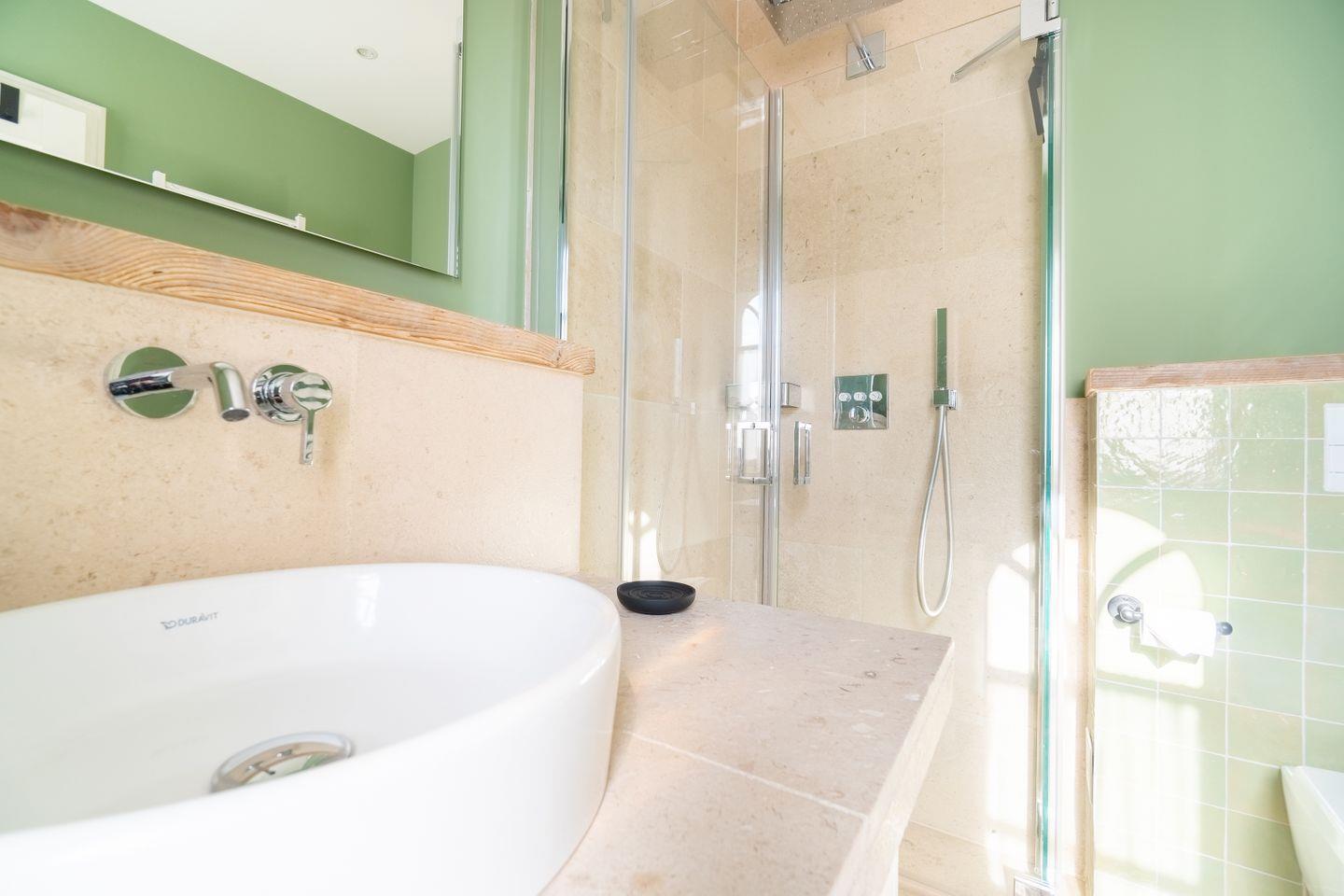 Design umschmeichelt Atmosphäre. Kostbarer Mylin Limestoneboden im gesamten Erdgeschoß und Bädern, fußschmeichelnde Eichentreppen und Böden treffen auf traditionelle Holzbalkendecke im Erdgeschoß. Designer’s guild-Farben strahlen mit handgestrichenen liebevollen Tischlereinbauten im gesamten Haus kombiniert mit hochwertigen Designerlampen. Nichts ist zu viel dekoriert, aber auch nichts zu wenig.