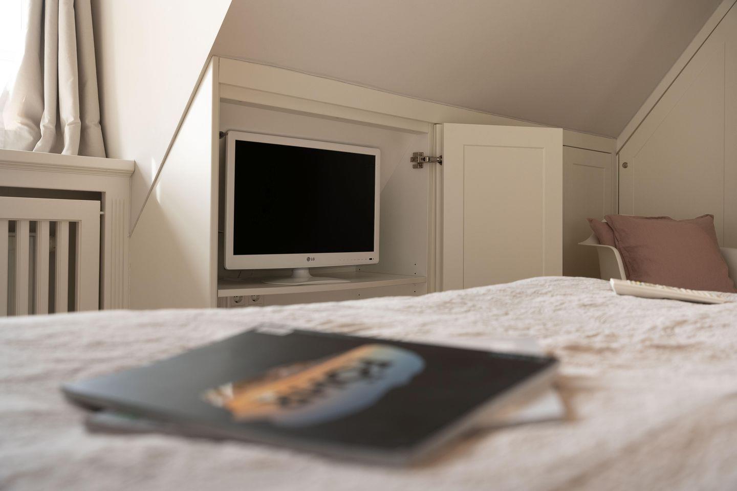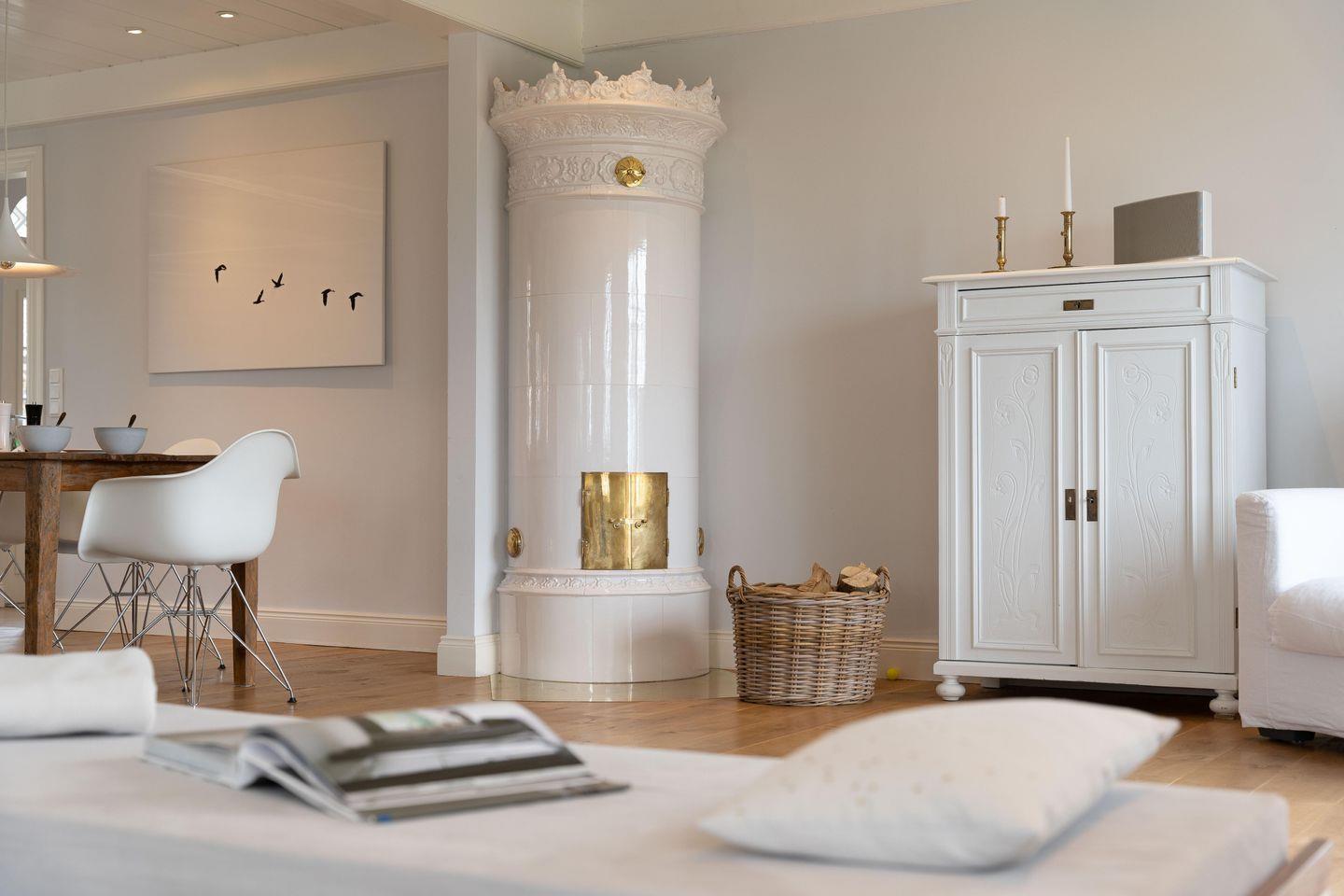 Im Erdgeschoss befinden sich der großzügige Wohn- und Essbereich mit offener Küche, sowie eines der beiden Bäder mit bodengleicher Dusche. Über den Wohnbereich gelangen Sie in den Garten und auf die eigene Terrasse. Der Original Mylin-Kachelofen sorgt auch an kühleren Tagen für eine wohlige Atmosphäre. Auf den ersten Blick im gemütlichen Wohnbereich werden Sie die Flachbild-TVs vermissen: Die Fernseher verstecken sich hinter den Bildern, welche sich seitlich verschieben lassen!