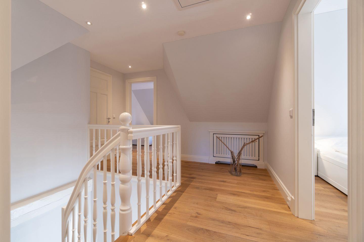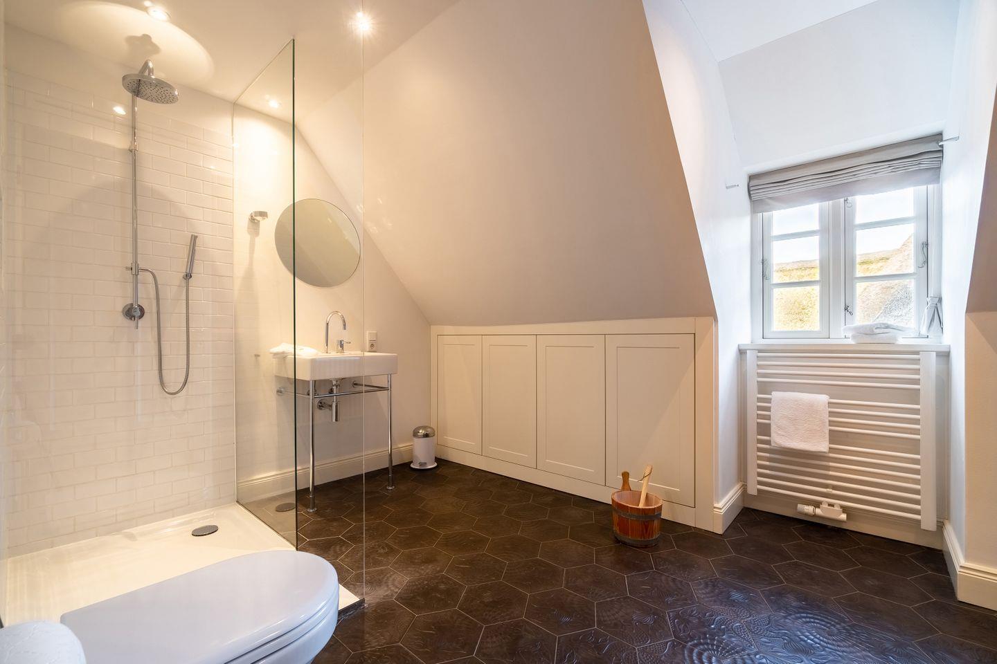 Im Obergeschoss befinden sich zwei weitere Schlafzimmer - eins mit Doppelbett und eins mit zwei Einzelbetten -, sowie das Duschbad mit der hauseigenen Sauna.