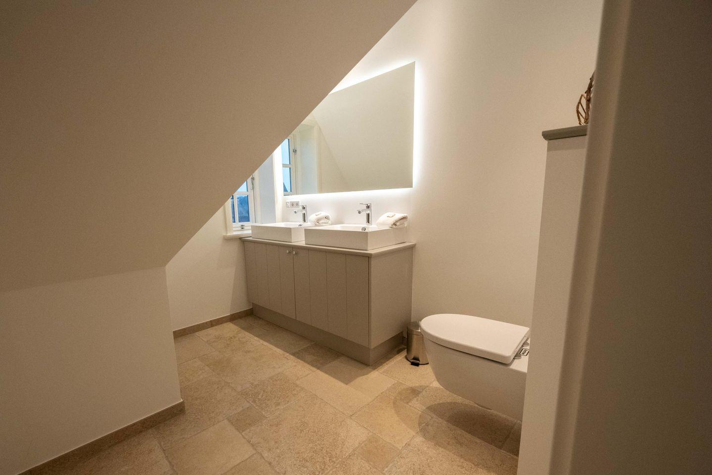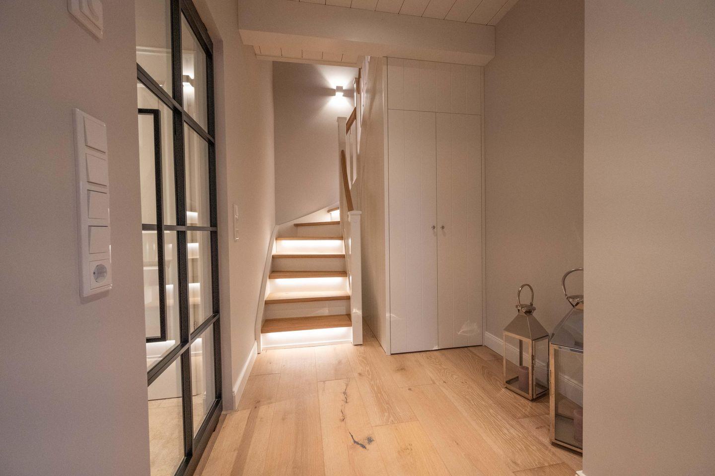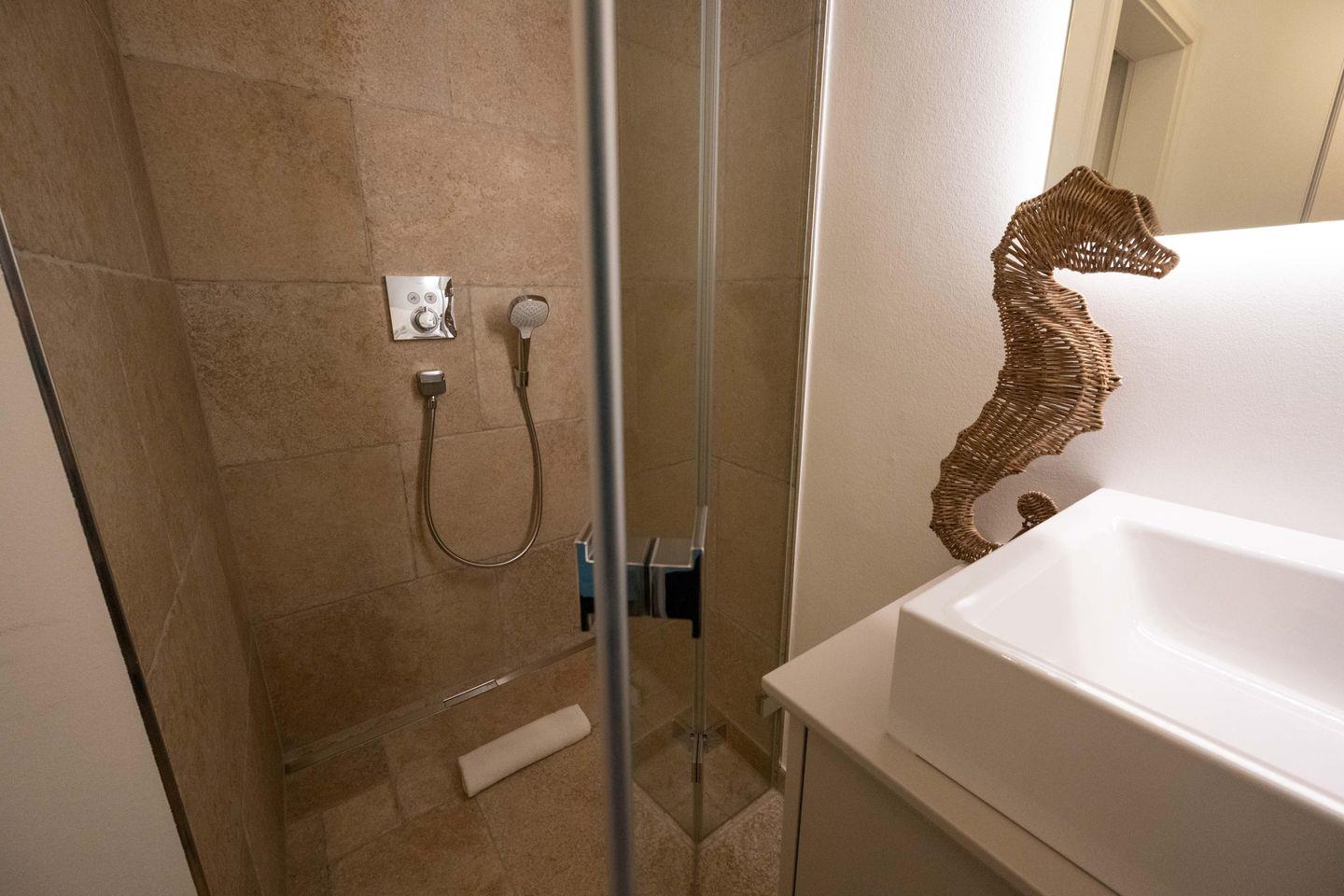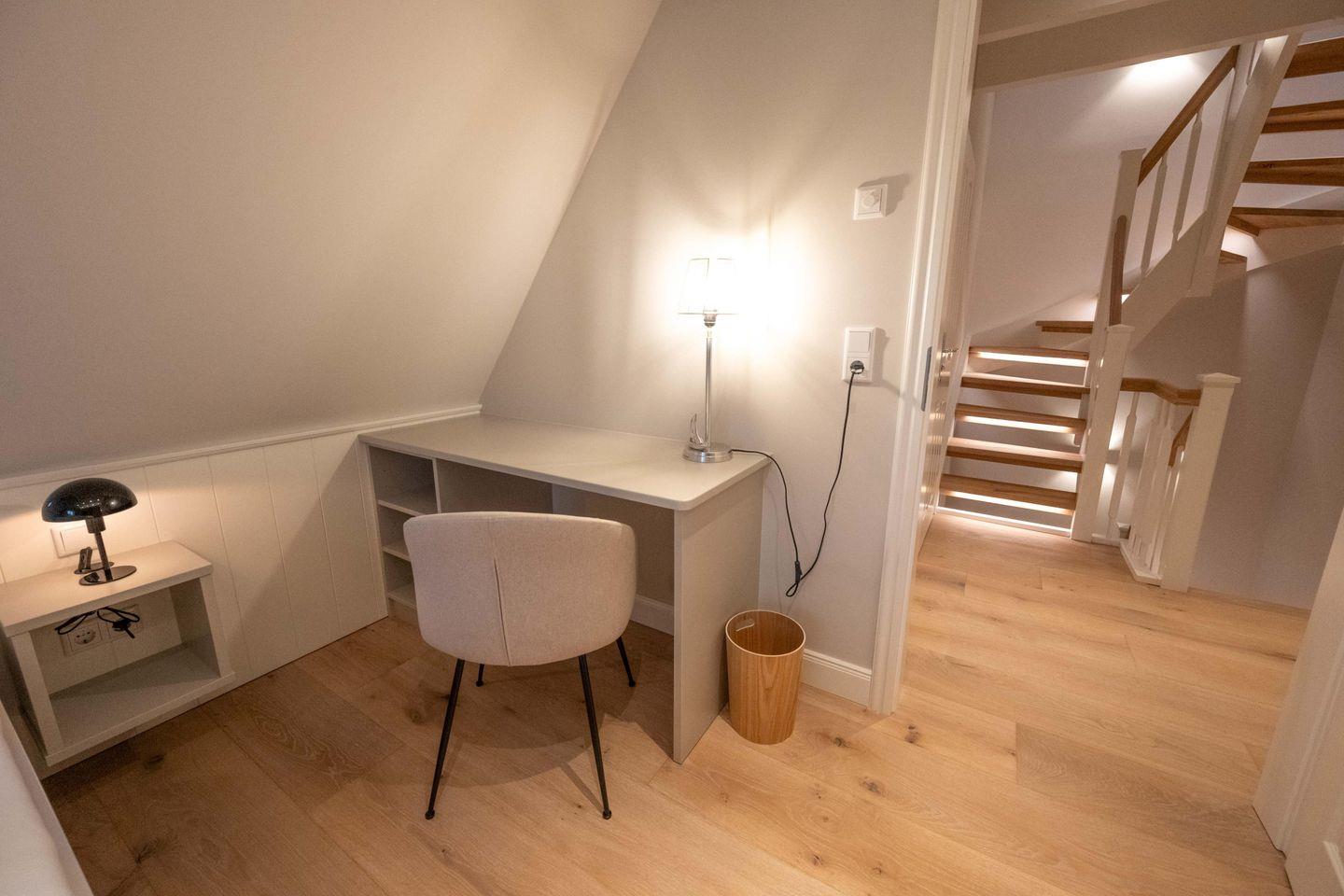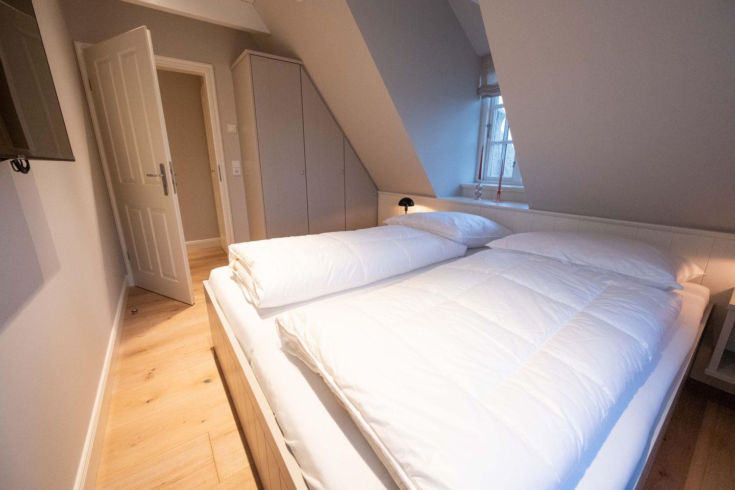 Im Obergeschoss sind die beiden Schlafzimmer - jeweils mit einem Doppelbett und einem Smart-TV ausgestattet - und die beiden Duschbäder gelegen. Im Dachgeschoss steht Ihnen ein weiteres Schlafzimmer mit Doppelbett zur Verfügung.