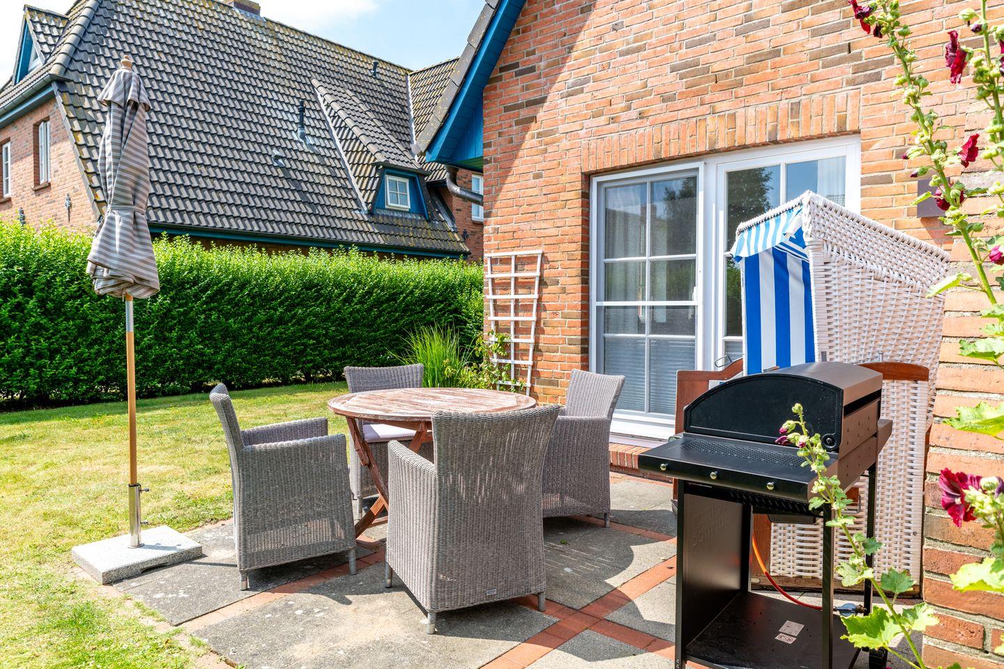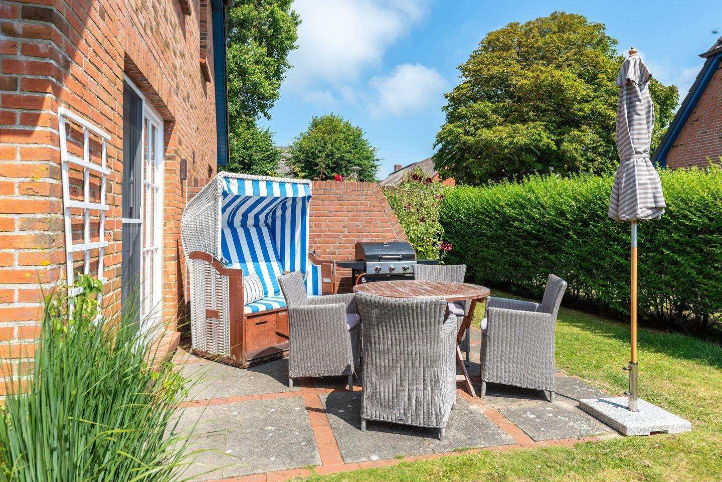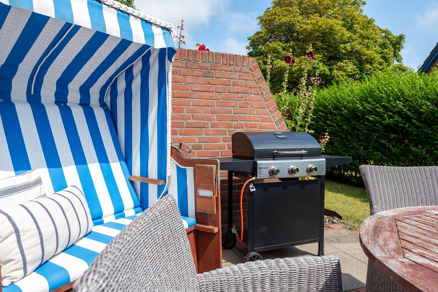 Eine sonnige Terrasse mit Garten – perfekt für ein Frühstück im Freien oder gemütliche Grillabende (Gasgrill vorhanden). Ein ausgewiesener Parkplatz ist ebenfalls vorhanden. Fahrräder können hinter dem Haus abgestellt werden. Ein Strandkorb steht ihnen AM Objekt zur Verfügung.