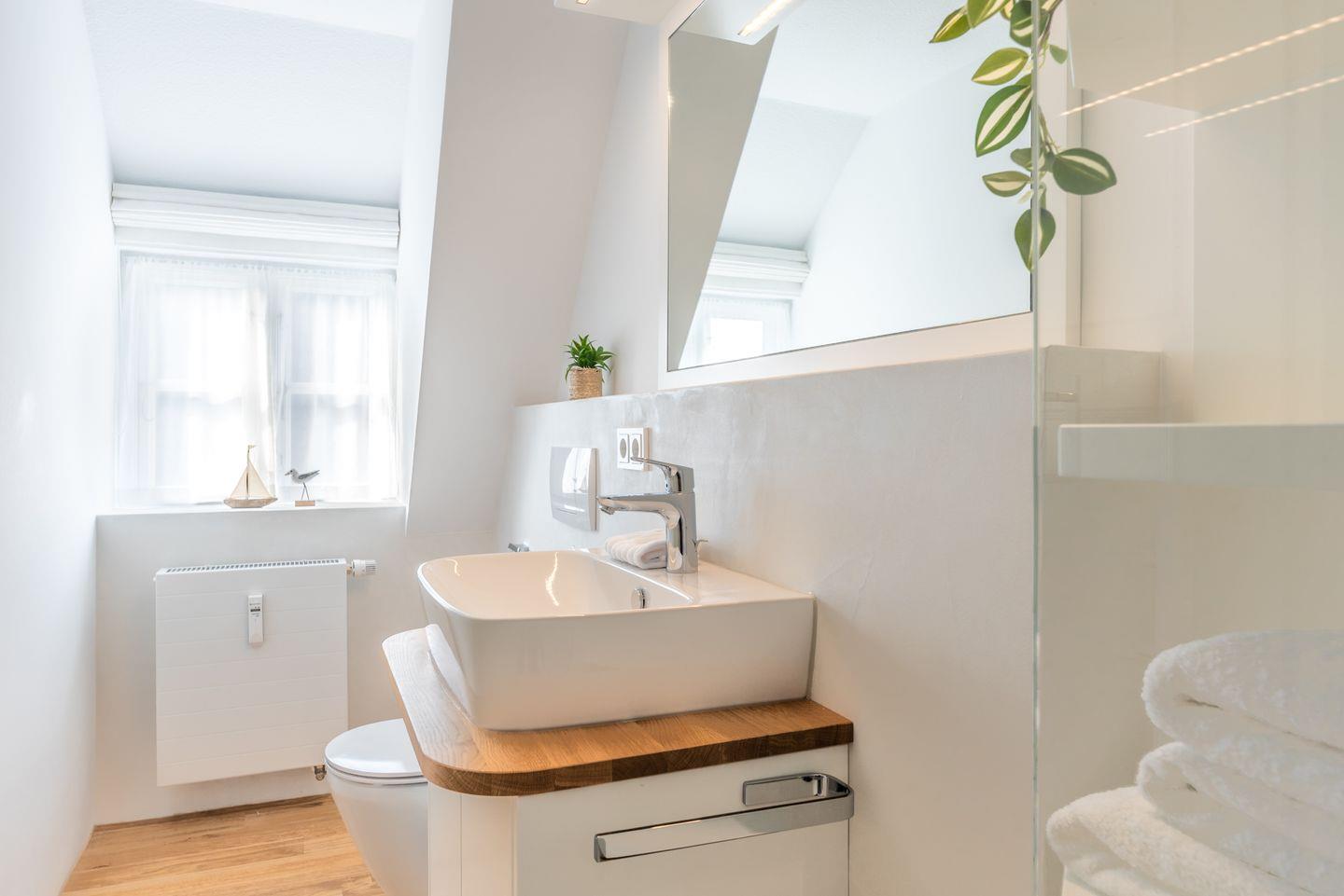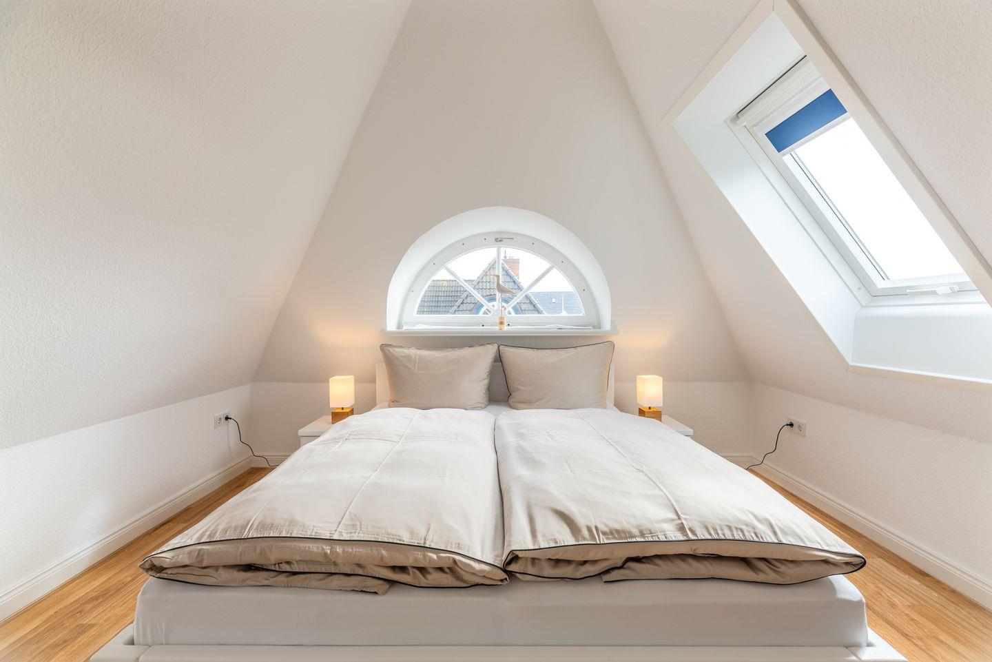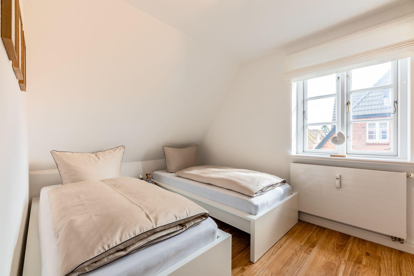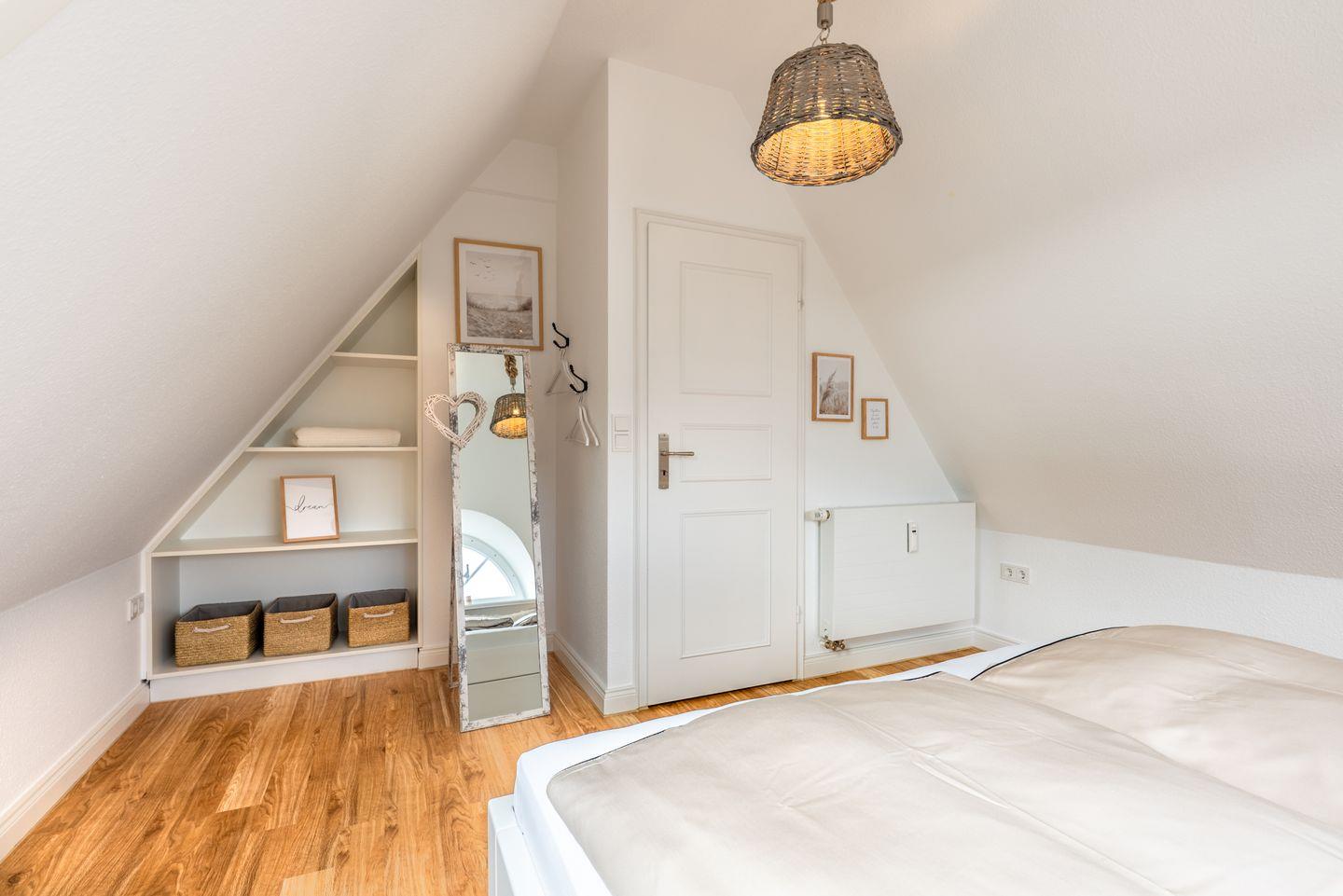 Zwei liebevoll gestaltete Schlafzimmer im Obergeschoss sorgen für erholsamen Schlaf. Das moderne Duschbad verfügt über eine Dusche und ein Fenster sowie eine Fußbodenheizung.