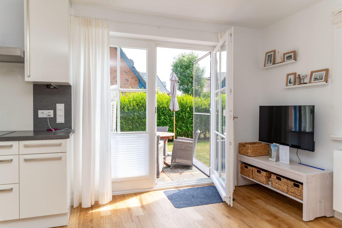 Ein weiteres Highlight der Wohnung ist die Terrasse mit Gartenblick, auf der Sie die Seele baumeln lassen können. Genießen Sie Ihr Frühstück im Freien oder entspannen Sie bei einem Buch auf den Gartenmöbeln. Die Liegewiese lädt dazu ein, die Sonne zu genießen. Für die kleineren Gäste steht ein Strandkorb bereit, während der Garten Sicherheit und Privatsphäre bietet. Die Ferienwohnung ist kinderfreundlich und bietet zahlreiche Annehmlichkeiten für Familien. Ein Hochstuhl und ein Kinderbett sind auf Anfrage verfügbar. Zudem können Ihre vierbeinigen Freunde, max. 1 Haustier, ebenfalls mit in den Urlaub kommen, wodurch jeder in der Familie bestens versorgt ist. Auch eine Waschmaschine ist hier vorhanden. Fahrräder können hinter dem Haus abgestellt werden.