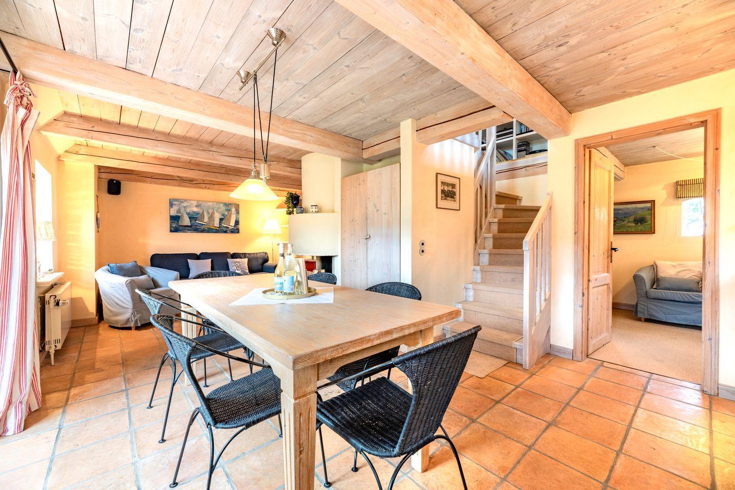 Im Erdgeschoss befindet sich eine großzügige Wohnküche sowie ein Badezimmer, ein Gäste-WC und ein Schlafzimmer mit einem 140b breiten Doppelbett, eine Kammer mit Waschmaschine. Vom Wohn- und Essbereich aus haben Sie Zugang zur hauseigenen Terrasse und zum Garten.